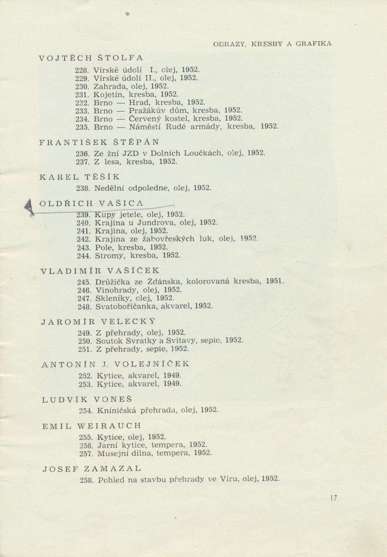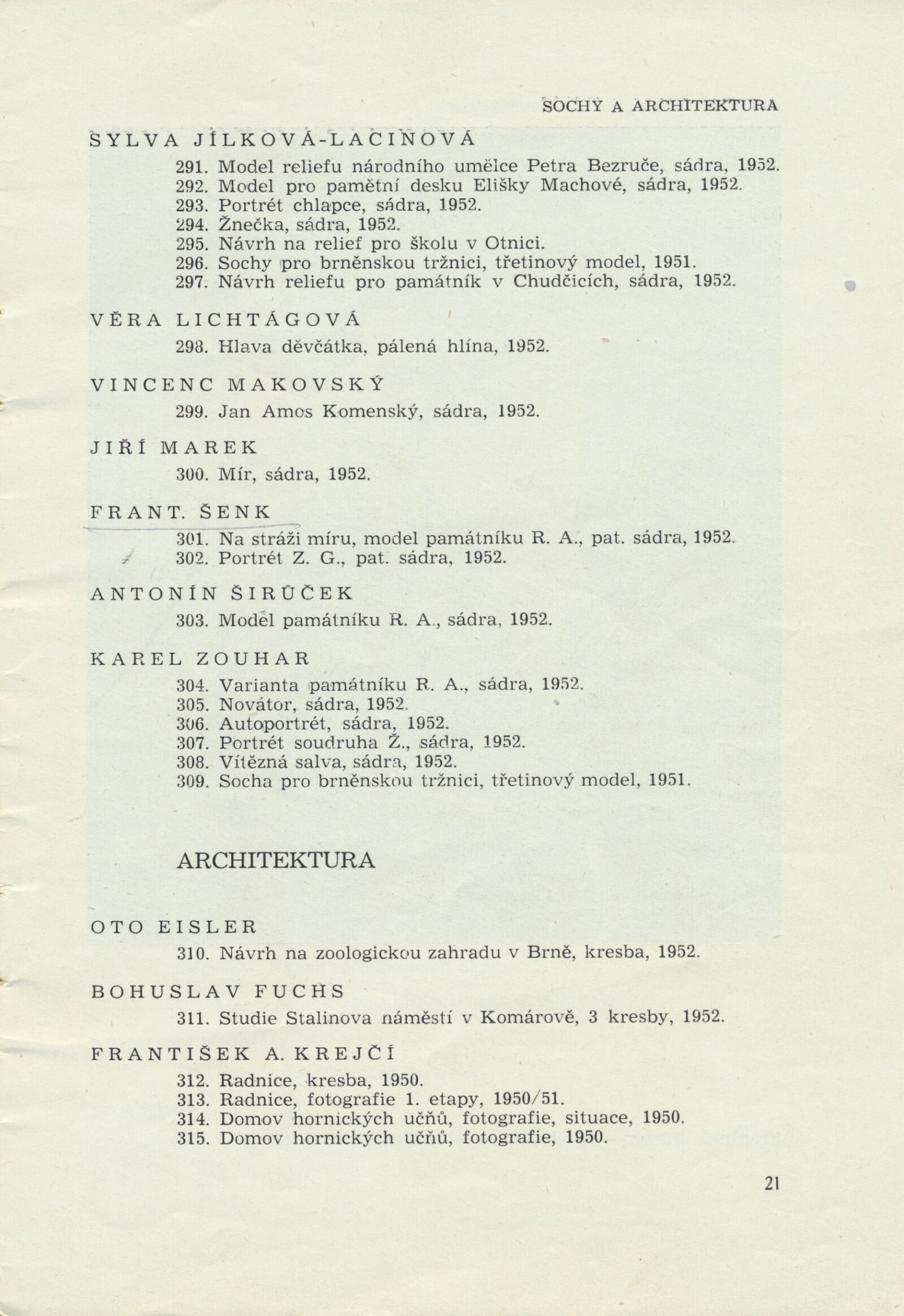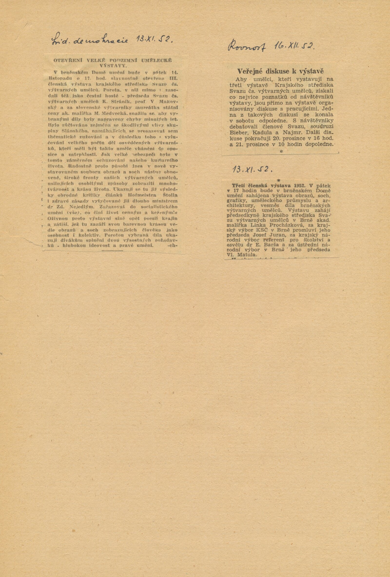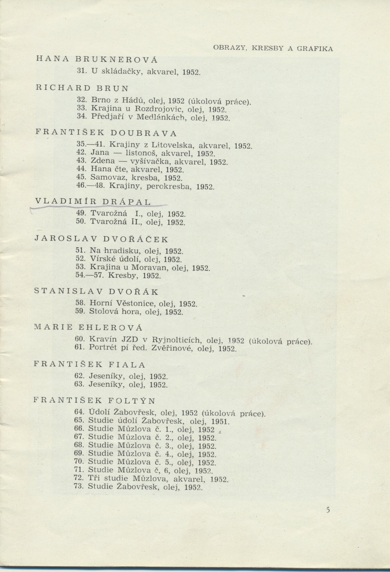 III. členská výstava krajského střediska ÚSČSVU v Brně: Dům umění města Brna, 14. 11. 1952 – 1. 1. 1953 / Text: František Kubišta. – Brno: ÚSČSVU, 1952. – 23 s., obr., DU 178. – MZK; MG; MMB