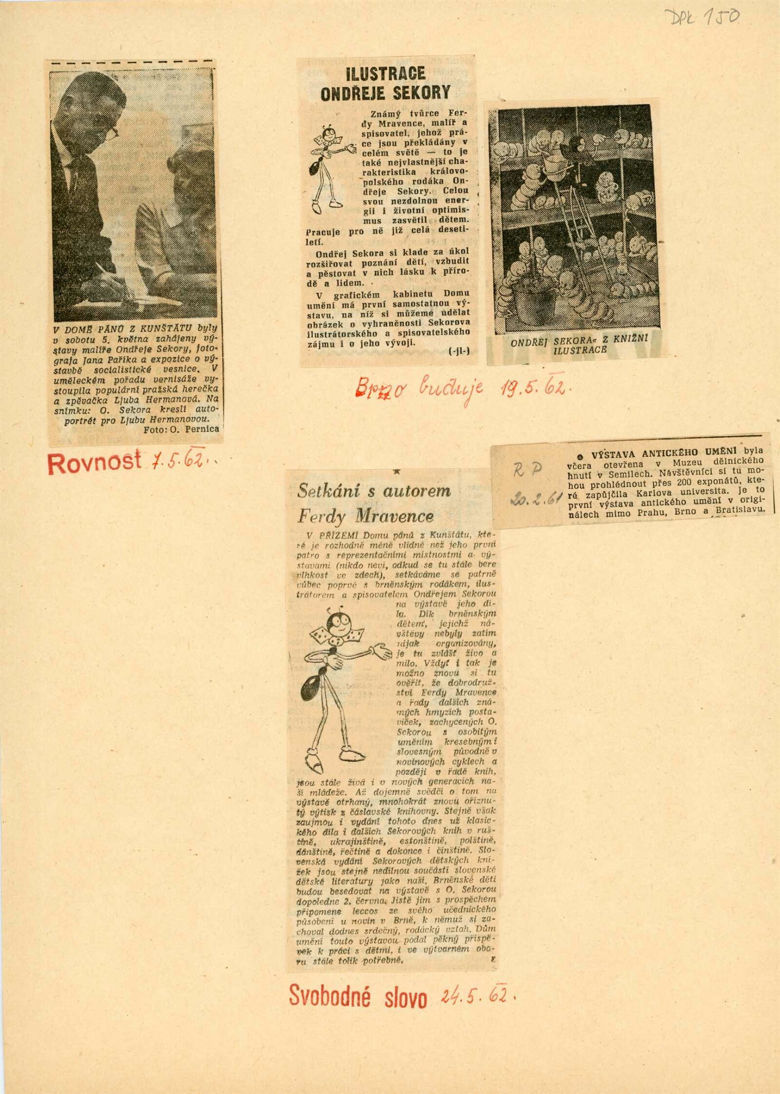 společná pozvánka DPK 151 a 152, katalog, karta k výstavě, úvodní slovo Jaroslav Kačer, podmínky pro uspořádání výstavy, seznam vystavených prací, korespondence (uspořádání a příprava výstavy – Ondřej Sekora, Jaroslav Kačer, Adolf Kroupa), recenze v tisku