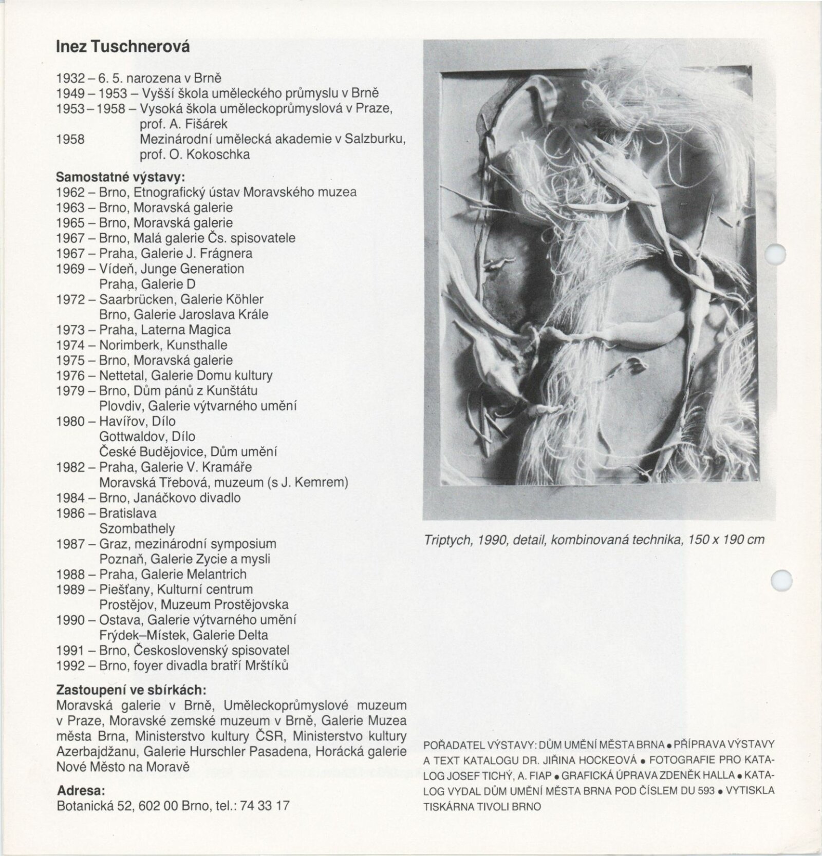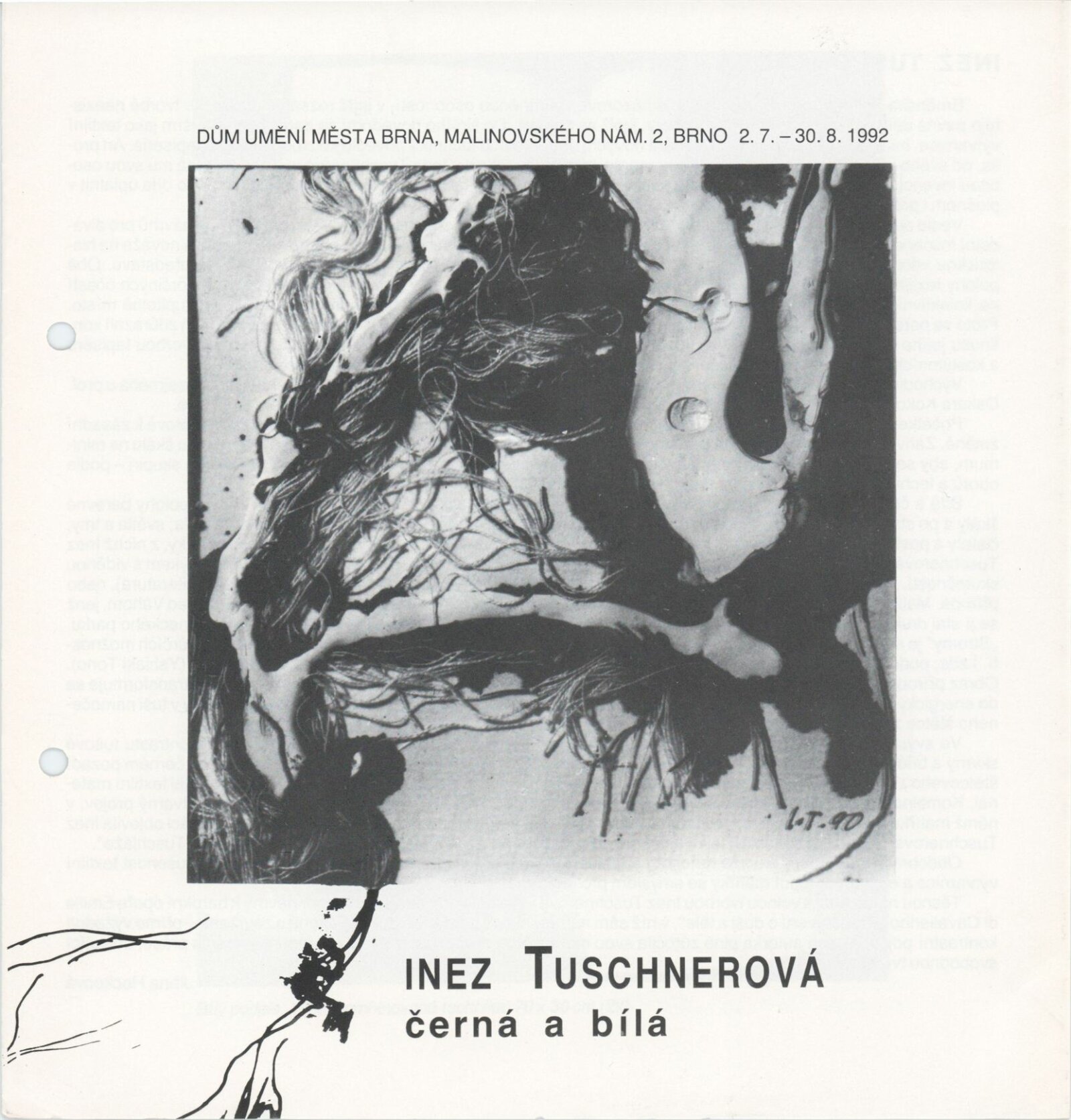 Inez Tuschnerová. Černá a bílá: Dům umění města Brna, hala, 2. 7. – 30. 8. 1992 / Text: Jiřina Hockeová. – Brno: DUmB, 1992. – skládačka (6 s., obr.), životní data, výstavy, zastoupení ve sbírkách, DU 926. – MG