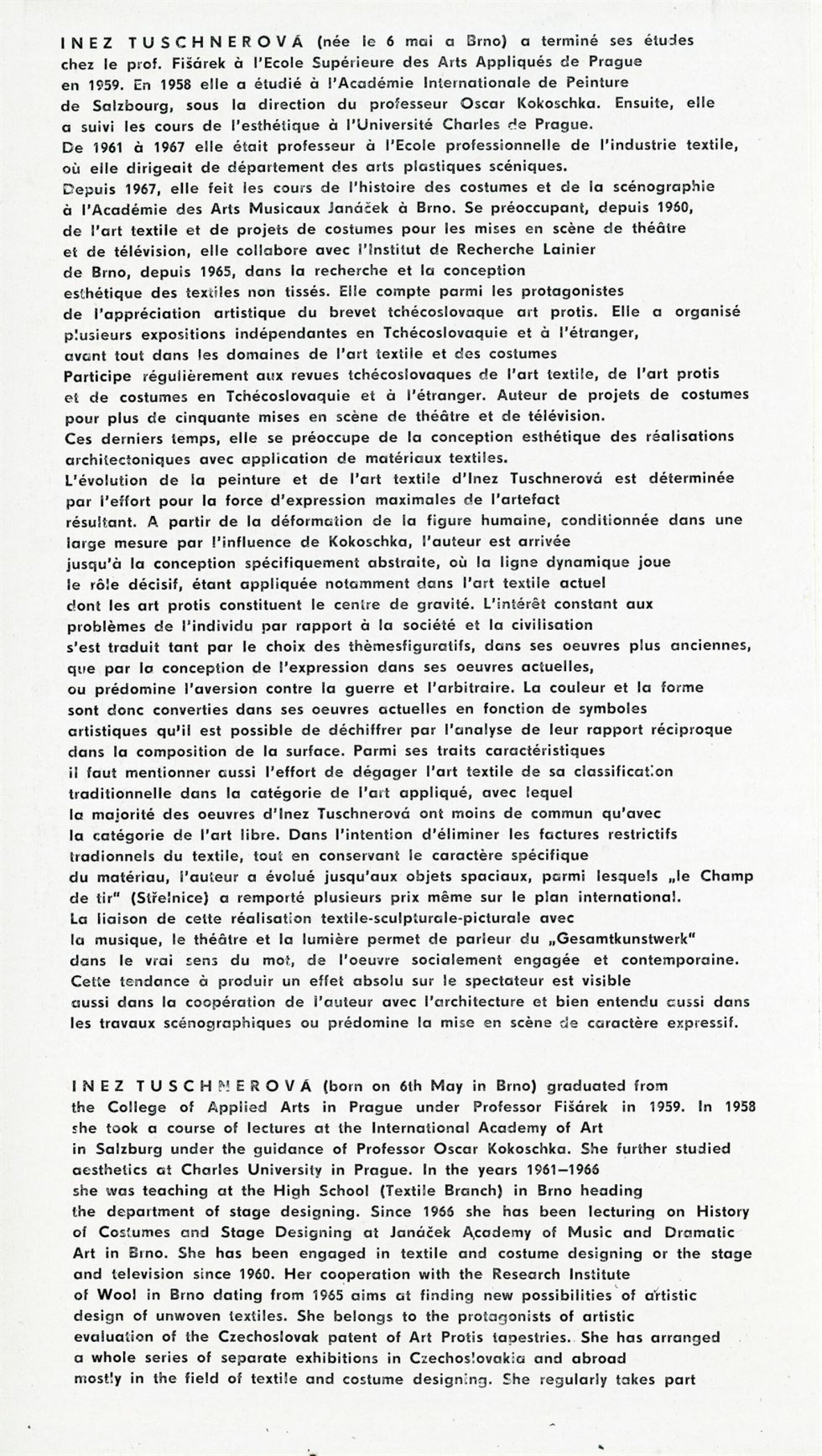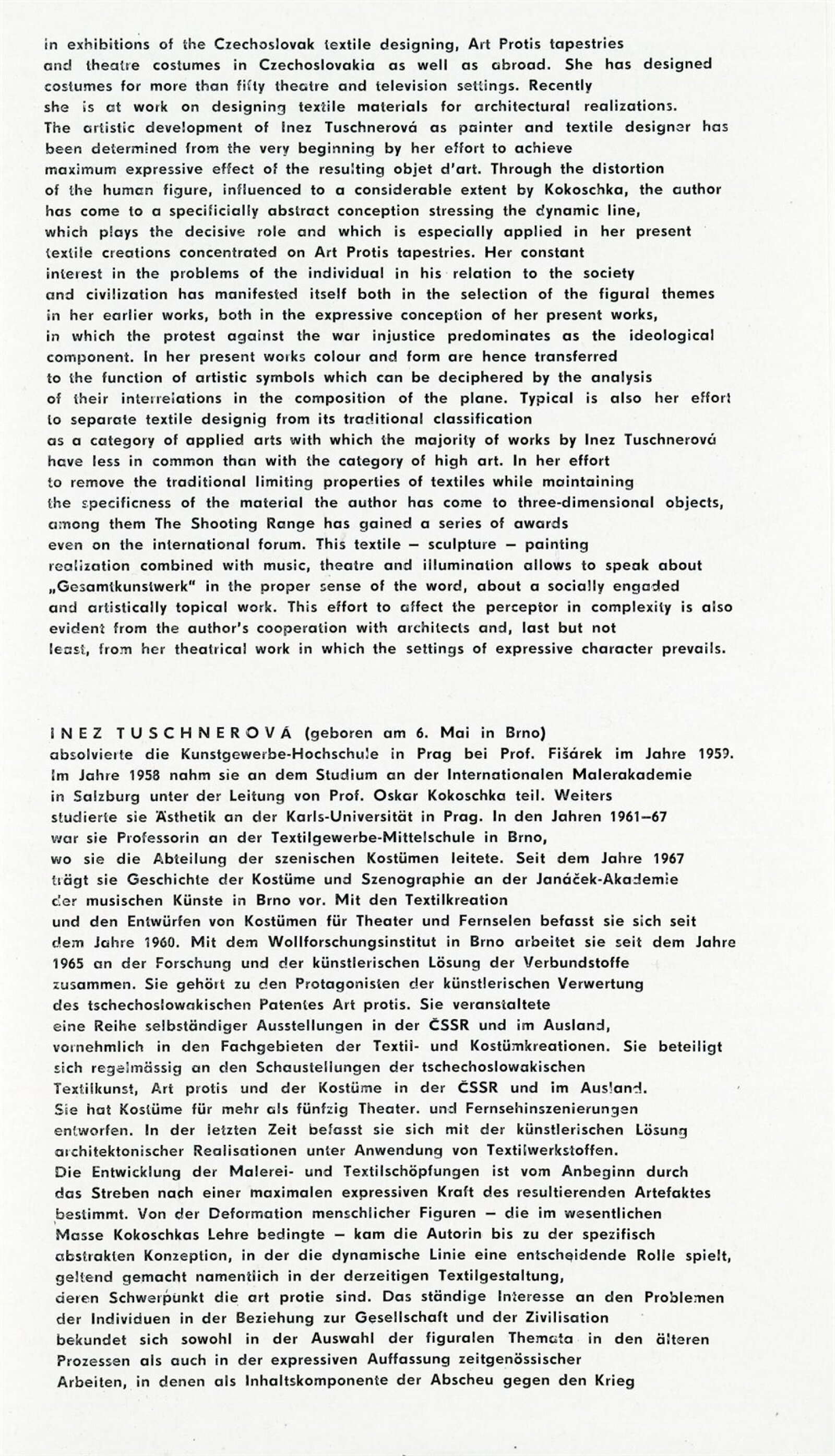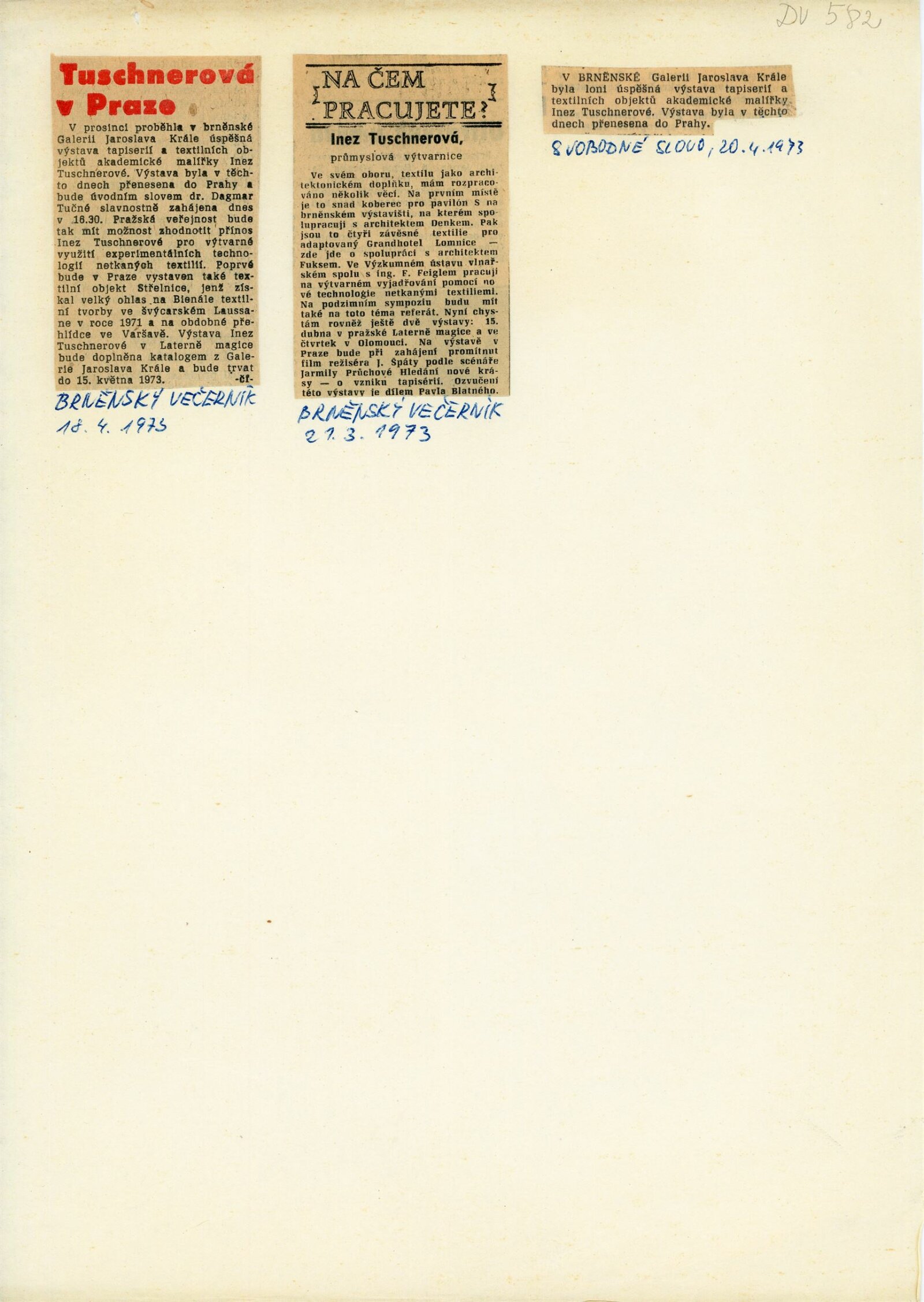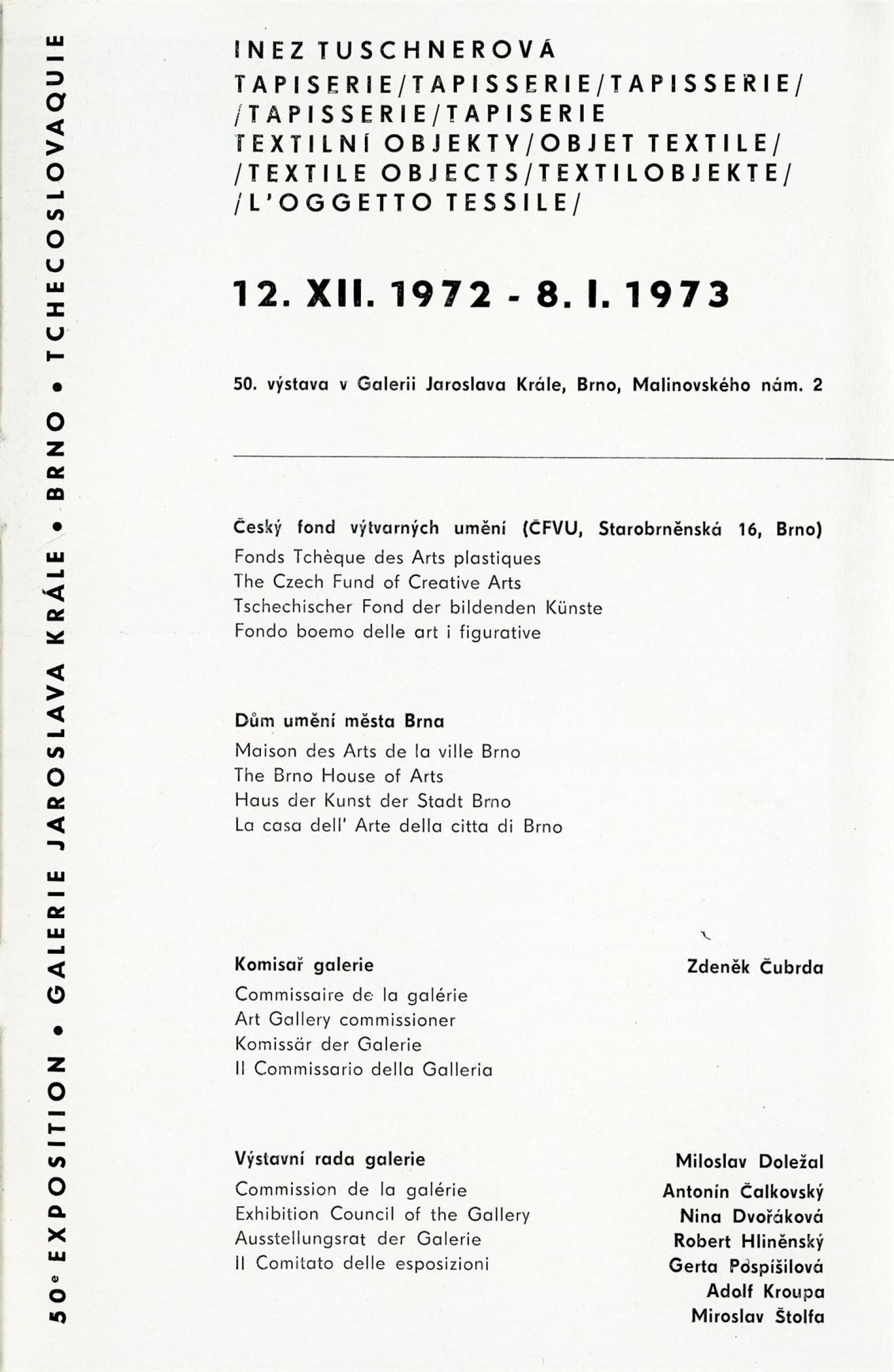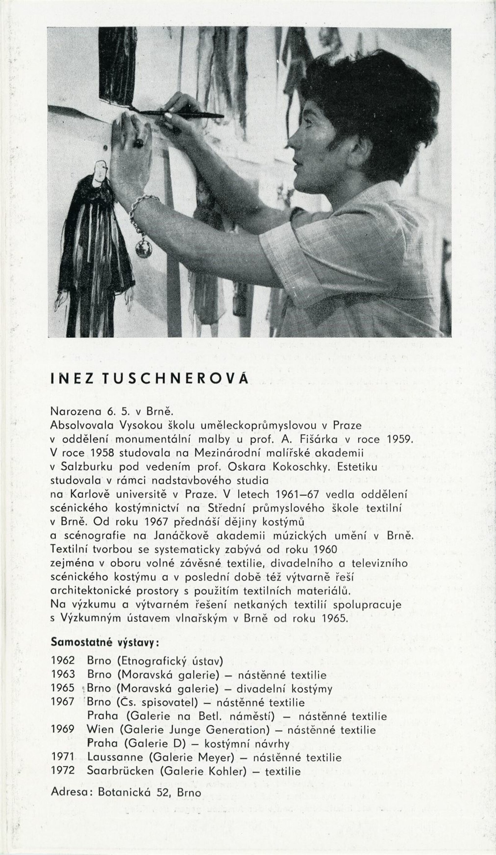 Inez Tuschnerová. Tapiserie, textilní objekty: Dům umění, 50. výstava v Galerii Jaroslava Krále, 12. 12. 1972 – 8. 1. 1973 / Text: Zdeněk Čubrda. – Brno: ČFVU, 1972. – 10 s., obr., portrét, životopis, výstavy, seznamy kostýmních návrhů, DU 582. – MZK; MG; MMB