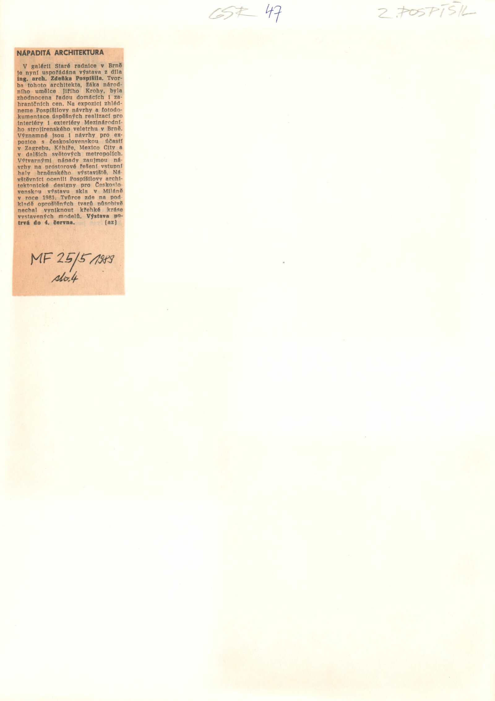 Arch.ing. Zdeněk Pospíšil: Kabinet architektury, Galerie Stará radnice, Kabinet architektury, 26. 4. – 4. 6. 1989 / Texty: Bedřich Votruba, Emil Drápal. – Brno: Svaz českých architektů, 1989. – [39] s., obr., životní data, seznam projektů, GSR 47