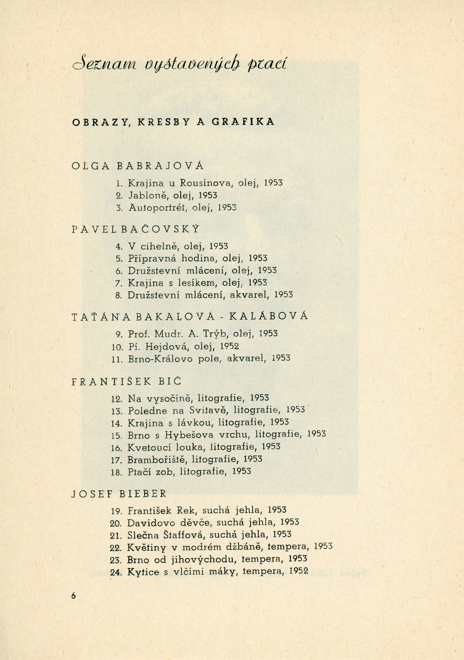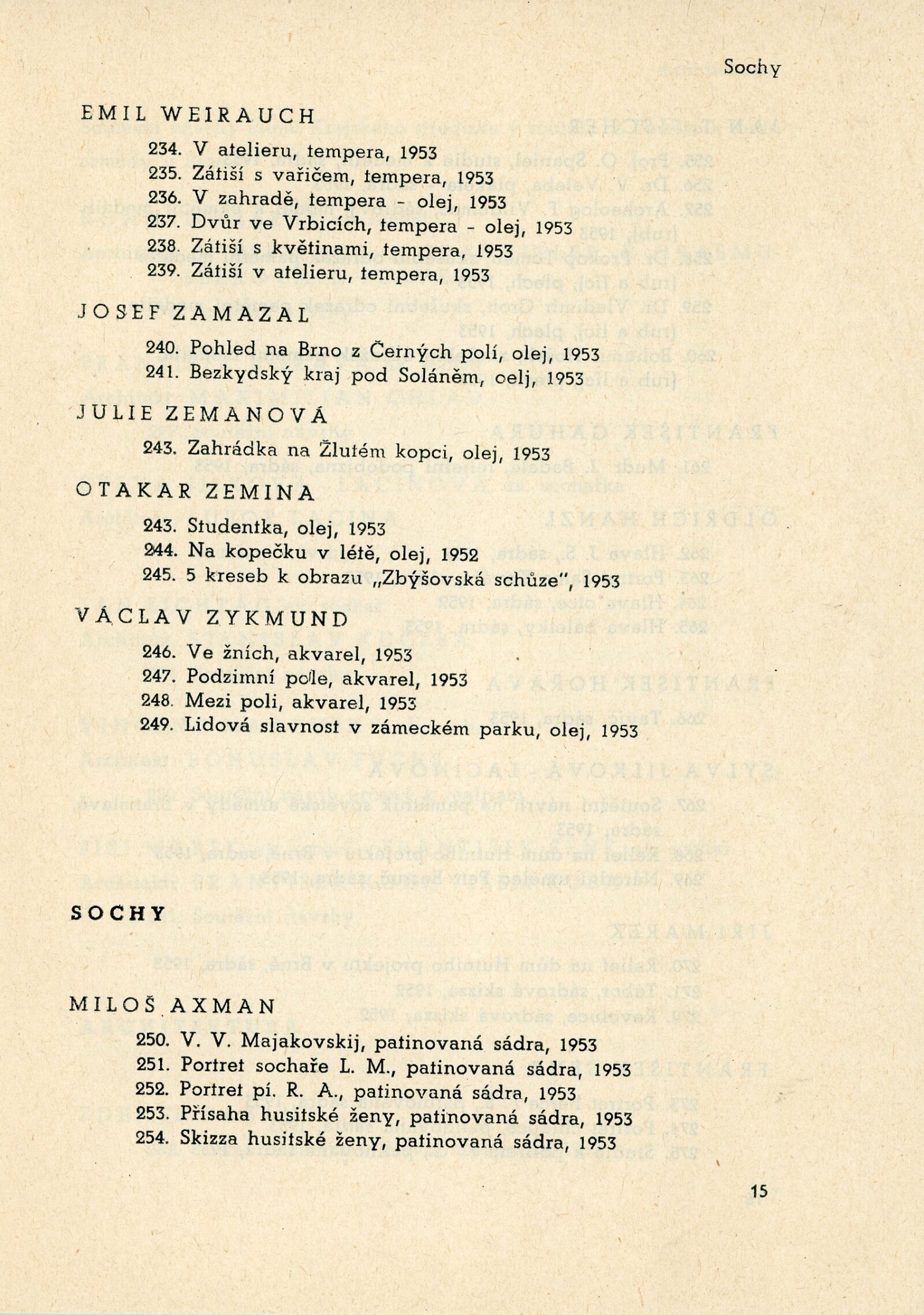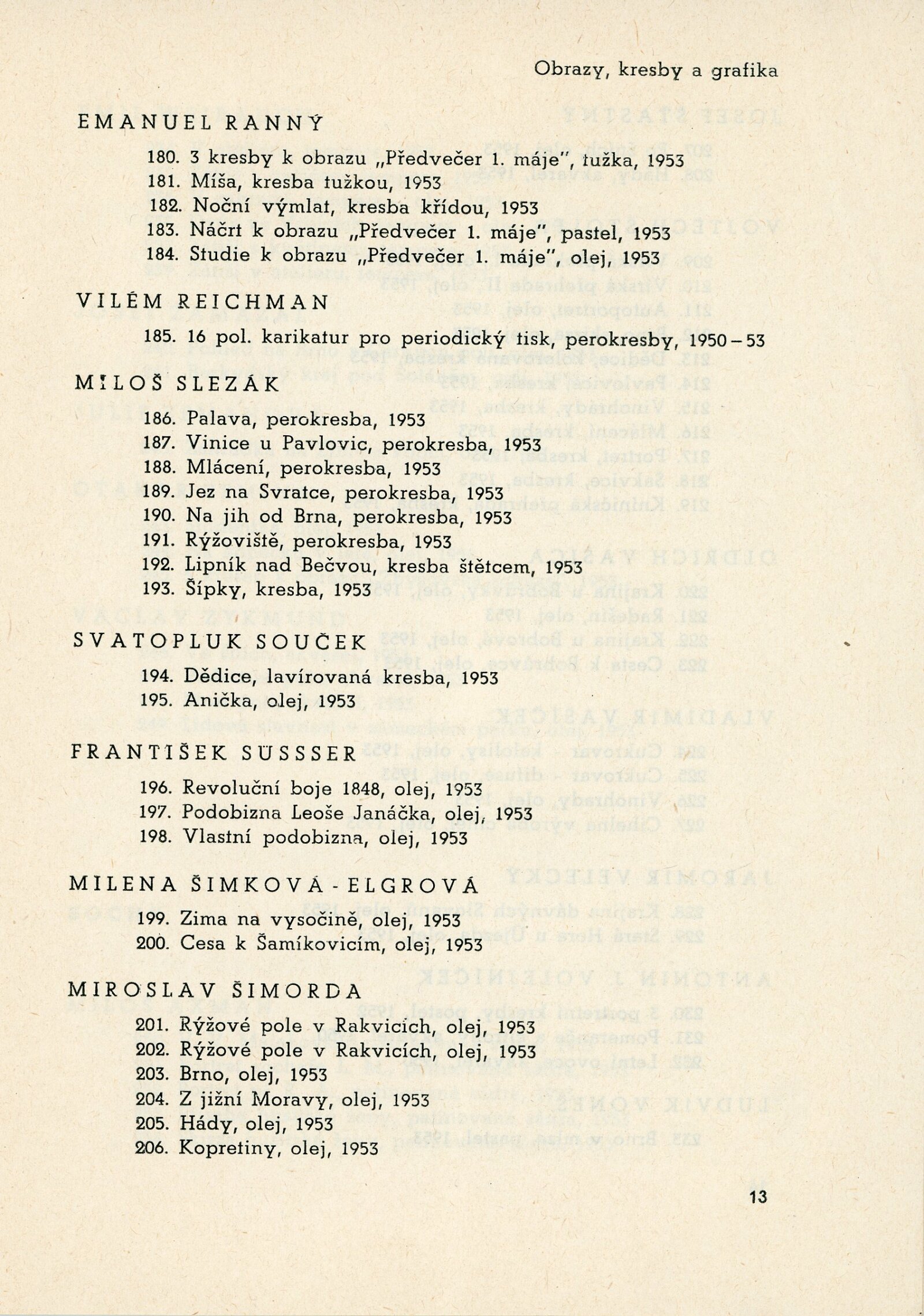 IV. členská výstava krajského střediska ÚSČSVU v Brně: Dům umění, 13. 12. 1953 – 17. 1. 1954 / Text: Václav Zykmund. – Brno: ÚSČSVU, 1953. – 21 s., obr., DU 192. – MZK; MG; MMB