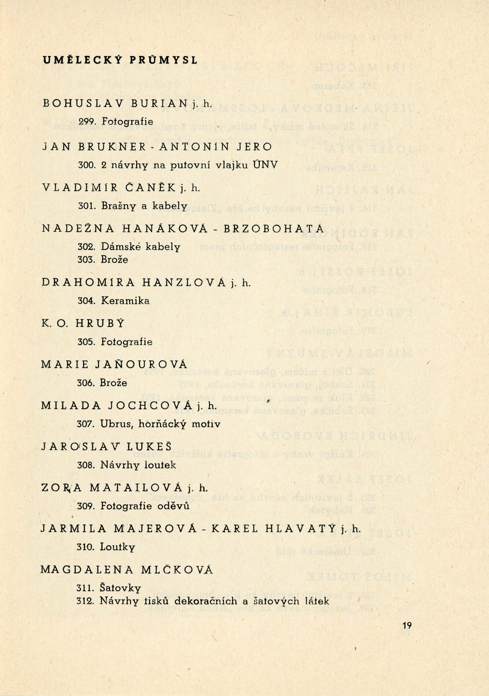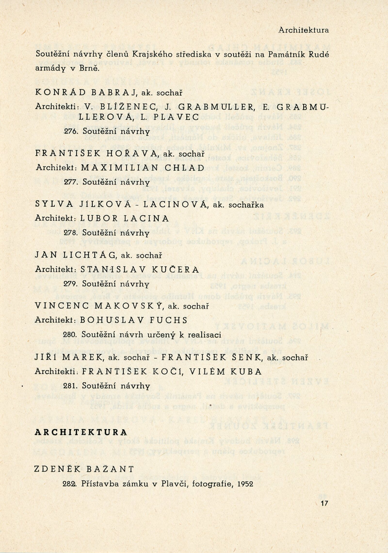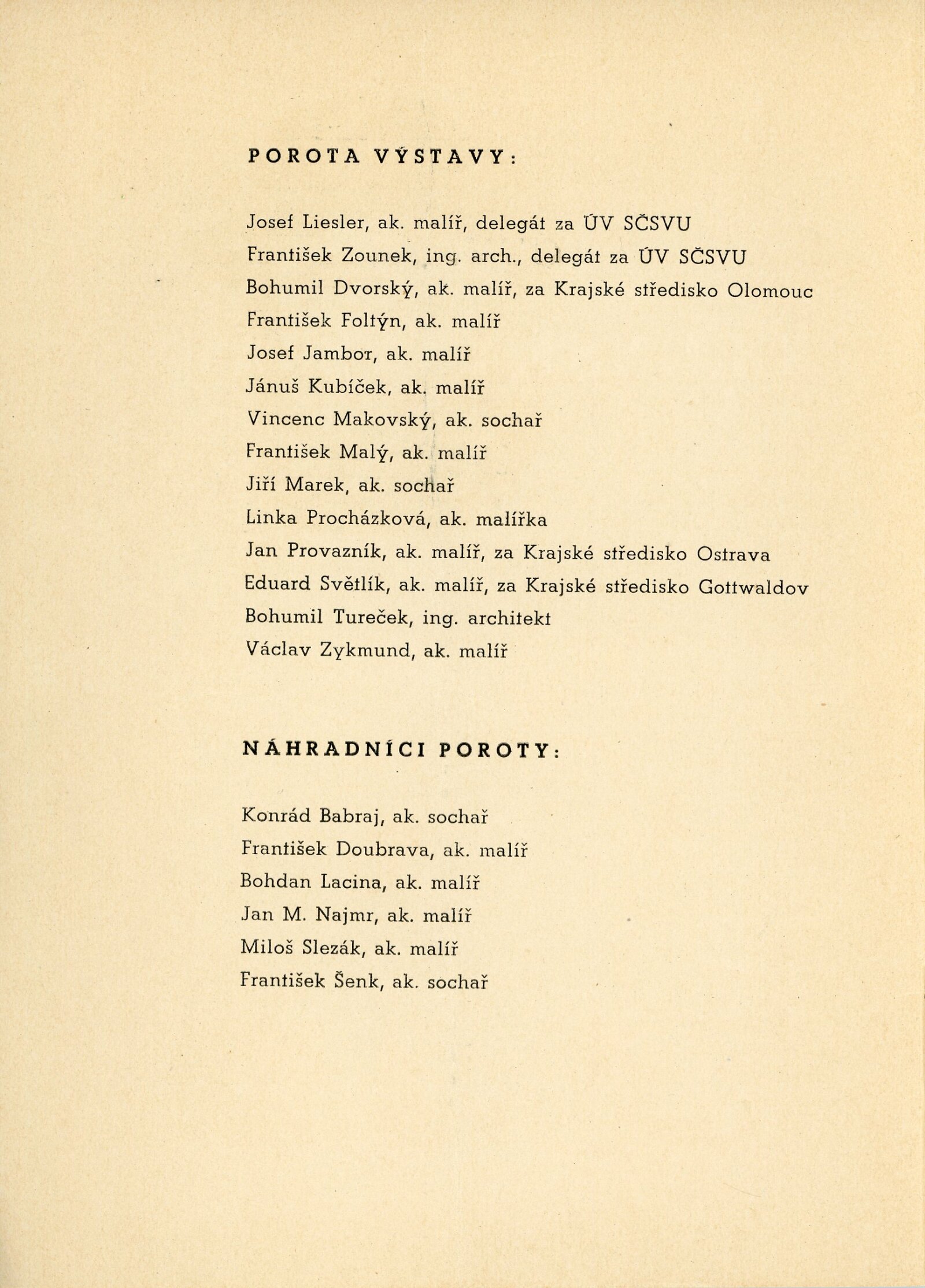 Miloš Axman, Olga Babrajová, Pavel Bačovský, Taťána Bakalová-Kalábová, Zdeněk Bažant, František Bič, Josef Bieber, František Bílkovský, Dobroslava Bílovská, V. Blíženec, Helena Bochořáková, Jan Brukner, Bohuslav Burian, Vladimír Čaněk, Aleš Černý, Vladimír Drápal, Jaroslav Dvořáček, Stanislav Dvořák, František Fiala, Jan T. Fischer, Karel Formánek, Jaroslav Fousek, Miroslav Fridrich, Olga Fridrichová-Steinzová, Věra Friedrichová, Bohuslav Fuchs, František Gahura, Rudolf Gajdoš, Jiří Grabmüller, E. Grabmüllerová, Naděžda Hanáková-Brzobohatá, Oldřich Hanzl, Drahomíra Hanzlová, František Hejč, Karel Hlavatý, František Hořava, Karel Otto Hrubý, Dalibor Chatrný, Maxmilian Chlad, František Chmelař, Ladislav Chobola, Květa Jadrníčková-Železňáková, Josef Jambor, Jan Janča, Marie Jaňourová, Karel Jílek, Sylva Jílková-Lacinová, Milada Jochcová, Zdeněk Juna, Josef Kadula, František Kocourek, František Kočí, Eduard Kostrhon, Hubert Kovařík, Josef Kranz, Zdeněk Kříž, Vilém Kuba, Rudolf Kučera, Stanislav Kučera, Bohdan Lacina, Lubor Lacina, Vilma Lesková, Jan Lichtág, Vlasta Lichtágová, Alois Lukášek, Jaroslav Lukeš, Jarmila Majerová, Vincenc Makovský, František Malý, Jiří Marek, Karel Masařík, Zora Matailová, Miloš Matiovský, Jiřina Medková-Lossmanová, Eduard Milén, Oldřich Míša, Magdalena Mlčková, Jiří Mlčoch, Vilém Mužík, Jan Maria Najmr, Miroslav Netík, Feodor Petrikovský, Josef Pěta, L. Plavec, František Přeček, Jan Rajlich, Emanuel Ranný, Vilém Reichmann, Jan Rodinger, Josef Rossi, Lubomír Říha, Miloš Slezák, Miloslav Smutný, Svatopluk Souček, František Süsser, Jindřich Svoboda, Josef Šálek, František Šenk, Milena Šimková-Elgrová, Miroslav Šimorda, Josef Šťastný, Evžen Šteflíček, Josef Štika, Vojtěch Štofla, Miloš Tomek, Oldřich Vašica, Vladimír Vašíček, Jindřich Vašut, Jaromír Velecký, Antonín Jan Volejníček, Ludvík Voneš, Emil Weirauch, Josef Zamazal, Julie Zemánová, Otakar Zemina, Milan Zezula, František Zounek, Václav Zykmund
