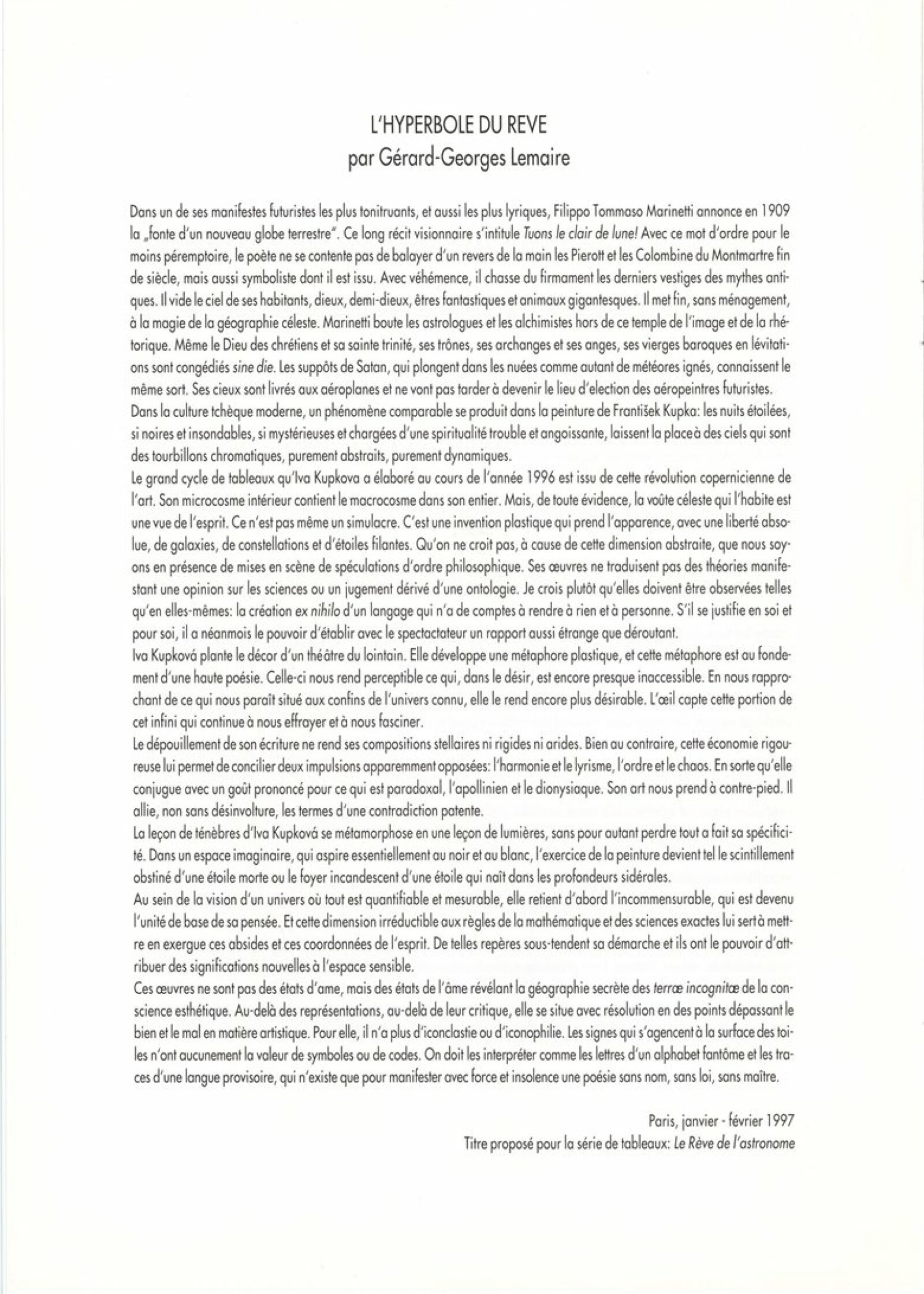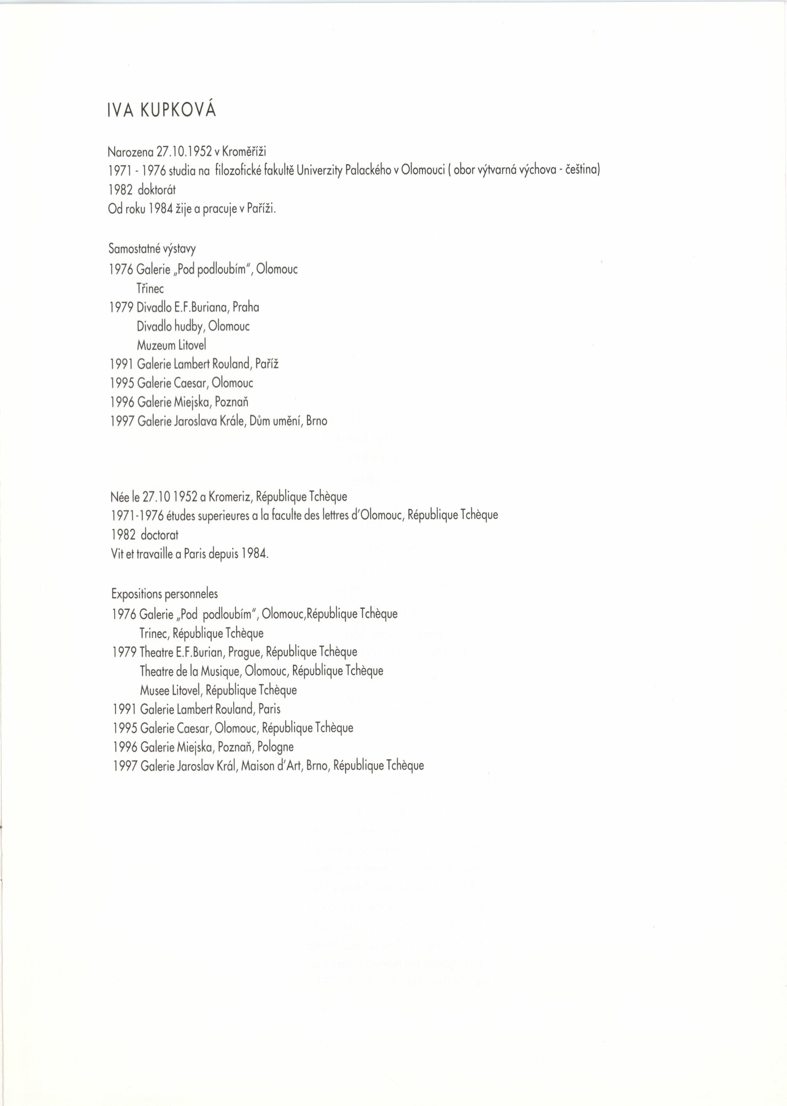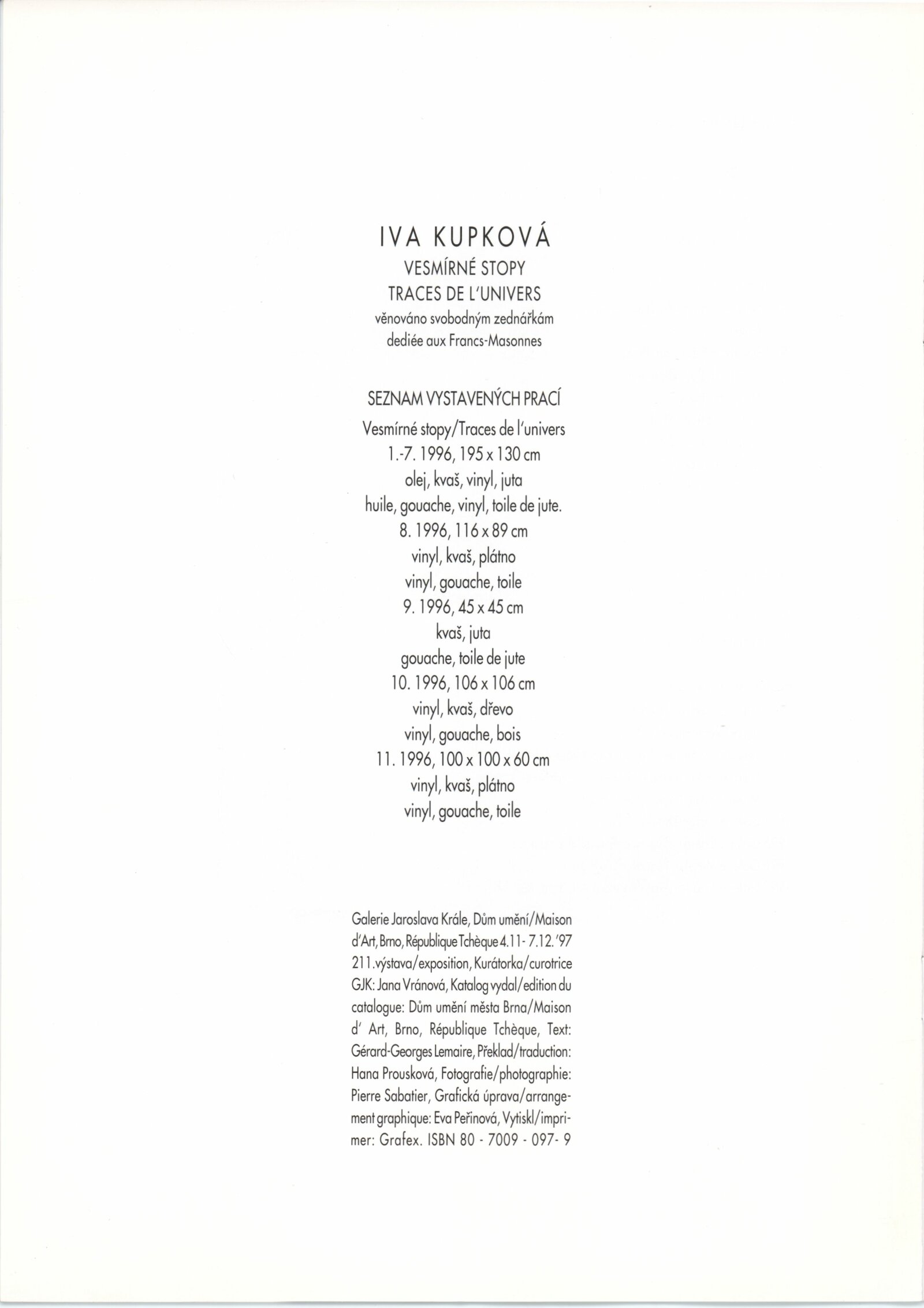 Iva Kupková. Vesmírné stopy: Dům umění města Brna, 211. výstava v Galerii Jaroslava Krále, 4. 11. – 7. 12. 1997 / Text: Gérard-Georges Lemaire. – Brno: DUmB, 1997. – [8] s., obr., životní data, výstavy, DU 1064. – MZK