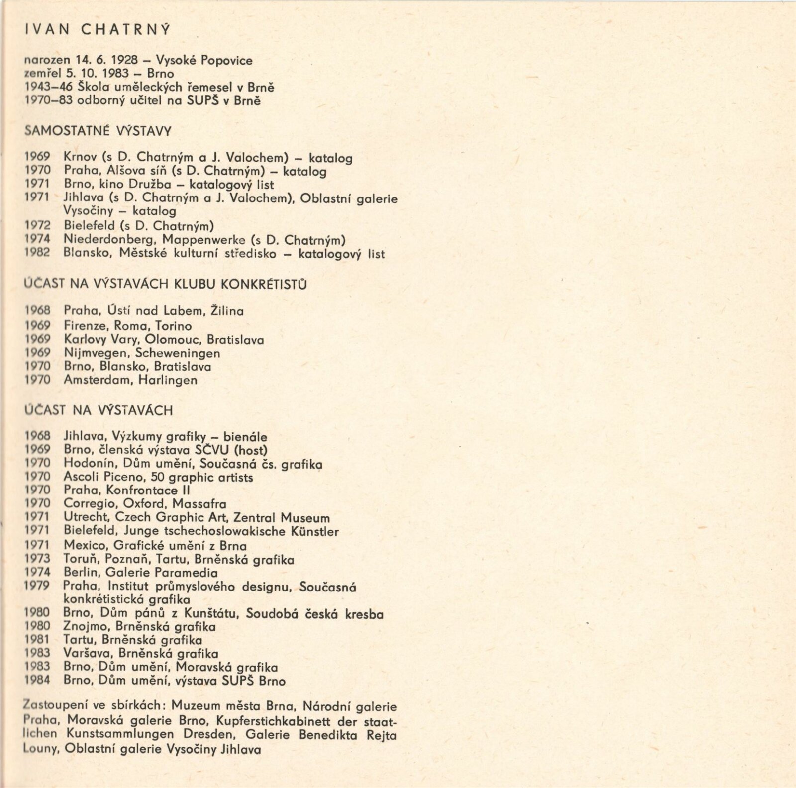 Ivan Chatrný. Kresby, grafika: Dům umění / Dům pánů z Kunštátu, Kabinet grafiky, 11. 11. – 7. 12. 1986 / Text: Jiří Valoch. – Brno: DUmB, 1986. – [33] s., obr., životní data, výstavy, zastoupení ve sbírkách, DPK 874. – MZK; MMB