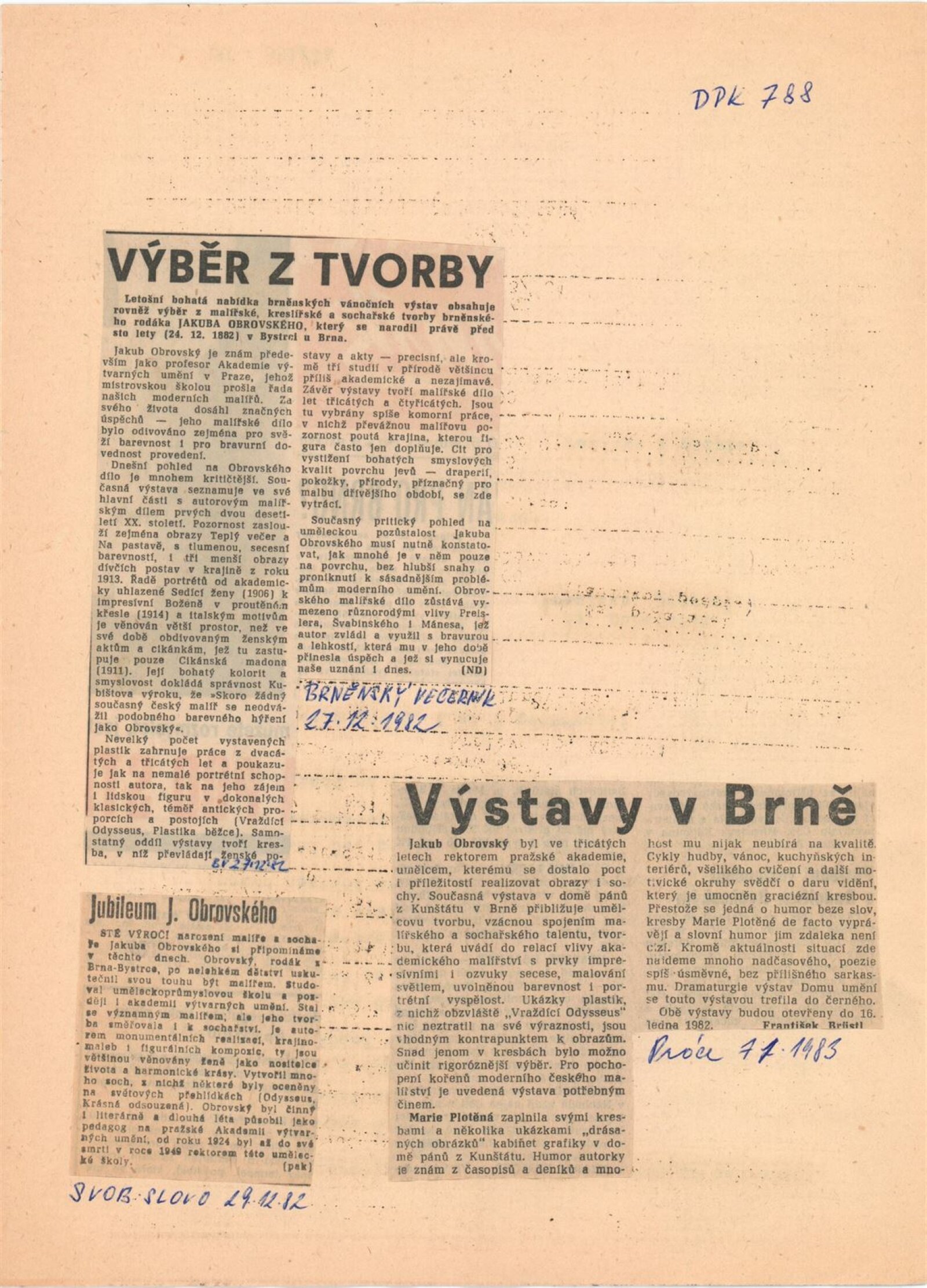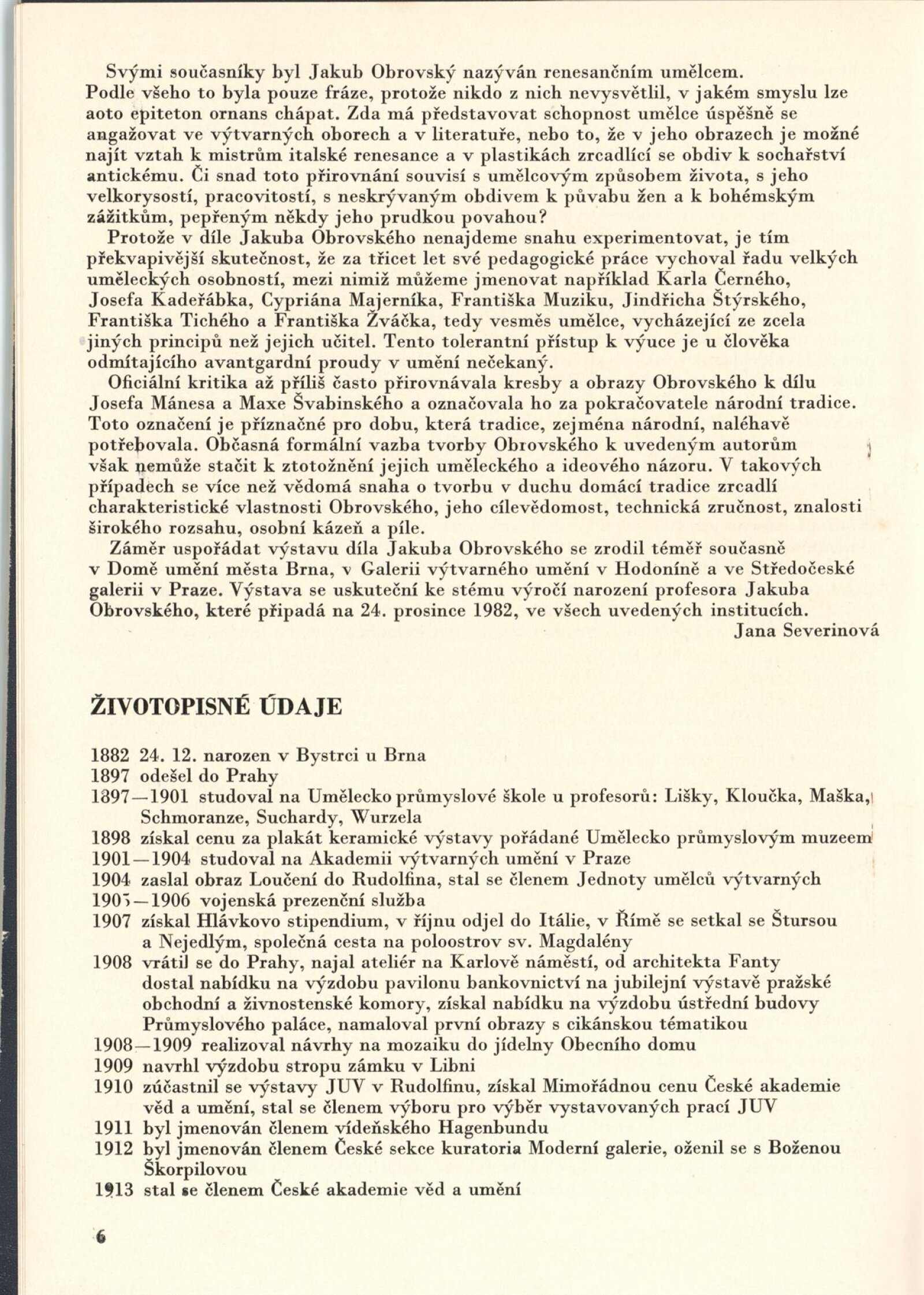 Jakub Obrovský. Výběr z tvorby: Dům umění / Dům pánů z Kunštátu, 10. 12. 1982 – 16. 1. 1983 / Text: Jana Severinová. – Hodonín: Galerie výtvarného umění, 1983. – 51 s., obr., životní data, výstavy, seznam prací J. O. v majetku galerií, bibliografie, DPK 788. – MZK