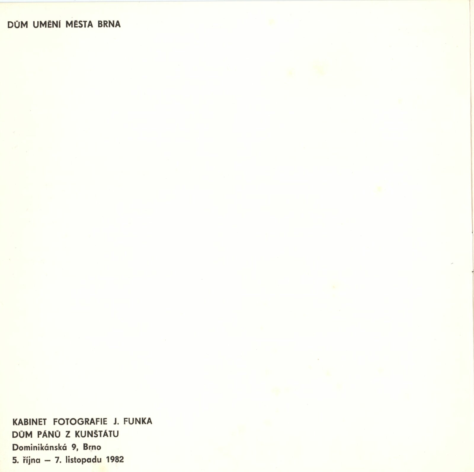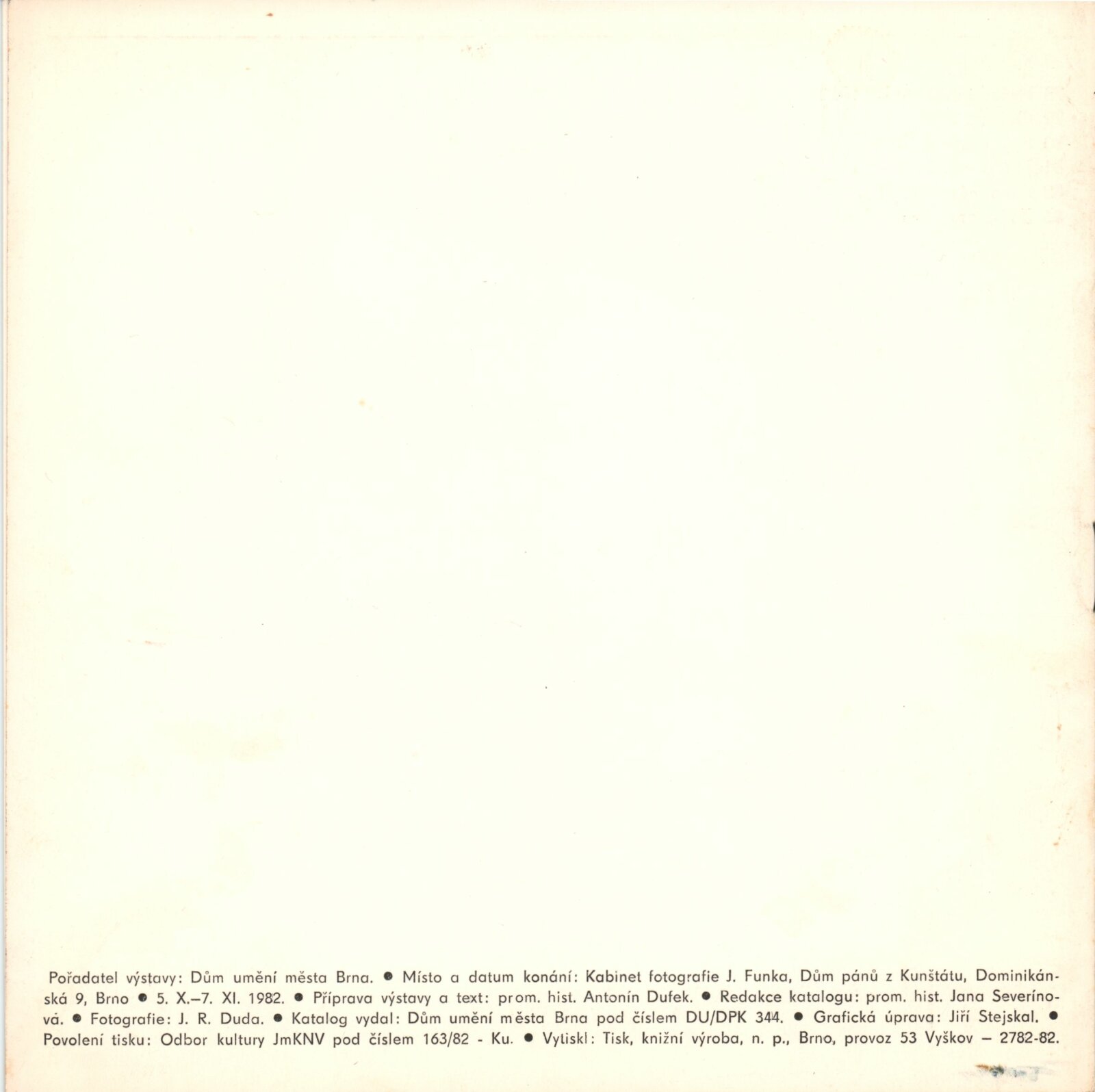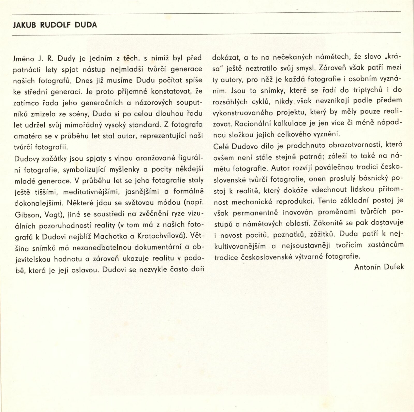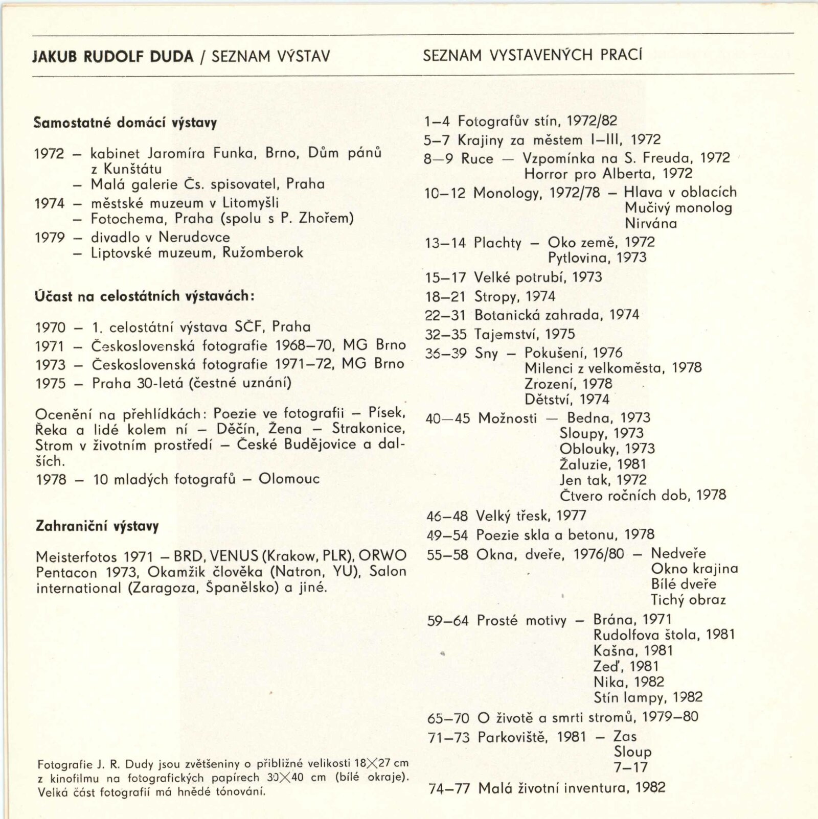 Jakub Rudolf Duda. Fotografie: Dům umění / Dům pánů z Kunštátu, Kabinet fotografie Jaromíra Funka, 5. 10. – 7. 11. 1982 / Text: Antonín Dufek. – Brno: DUmB, 1982. – 8 s., obr., výstavy, DPK 783. – MZK; MG