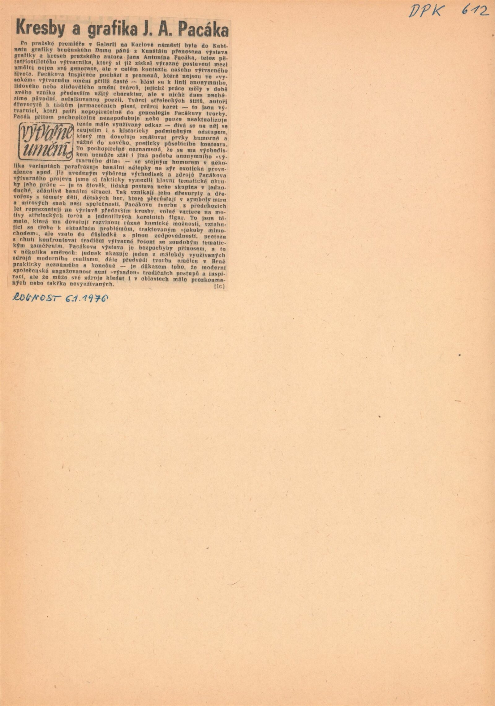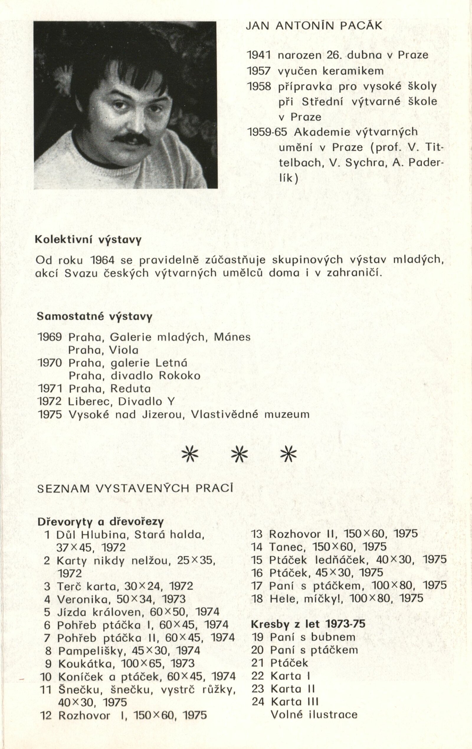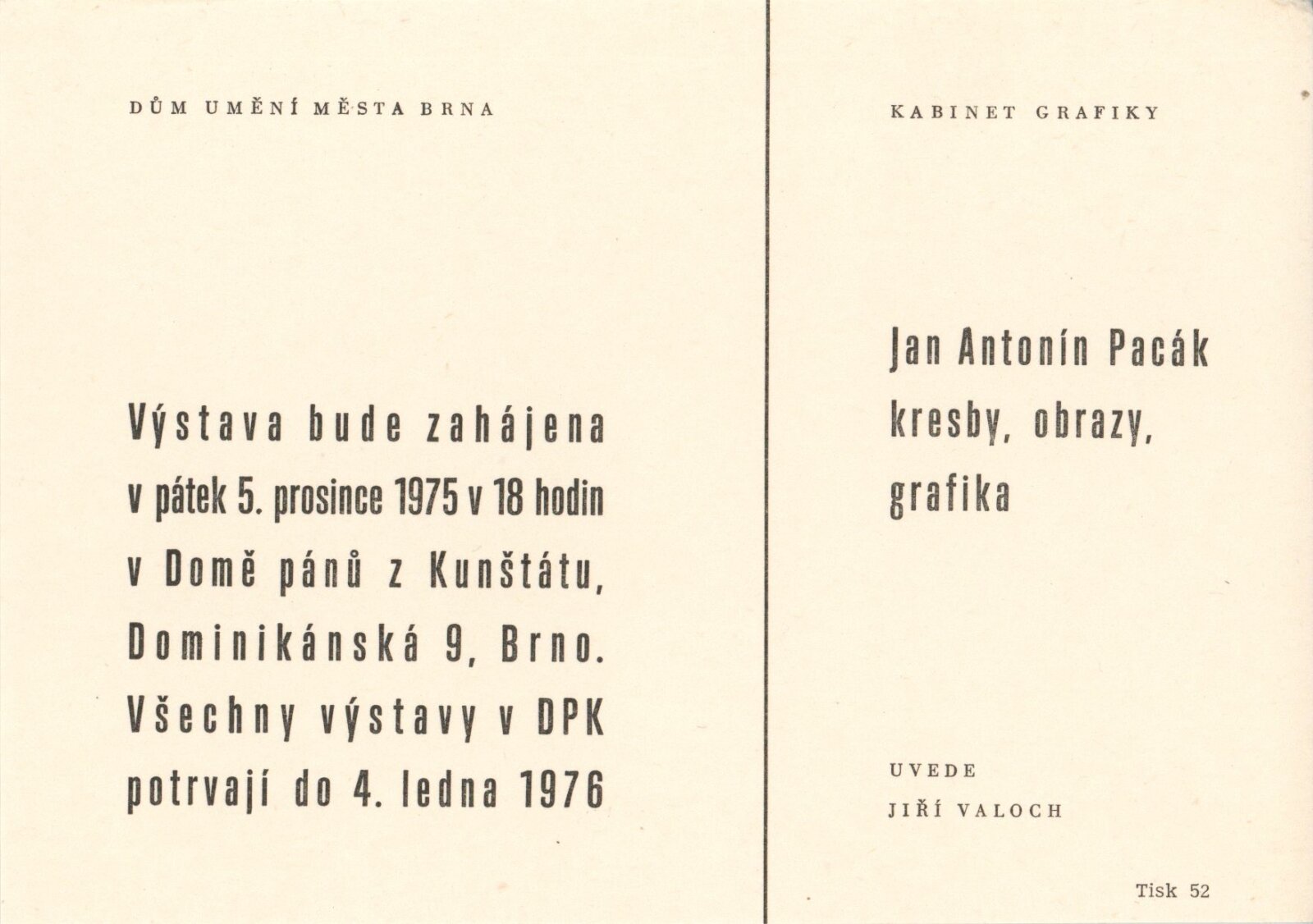Jan Antonín Pacák. Kresby, obrazy, grafika: Dům umění / Dům pánů z Kunštátu, 153. výstava Kabinetu grafiky, 5. 12. 1975 – 4. 1. 1976 / Převzatý katalog. Jan Ant. Pacák. Grafika, kresby: Galerie na Slovanech, Praha, 1. 10. – 2. 11. 1975 / Text: Dušan Konečný. – Praha: SČVU, 1975. – skládačka 6 s., obr., DPK 612. – MG
