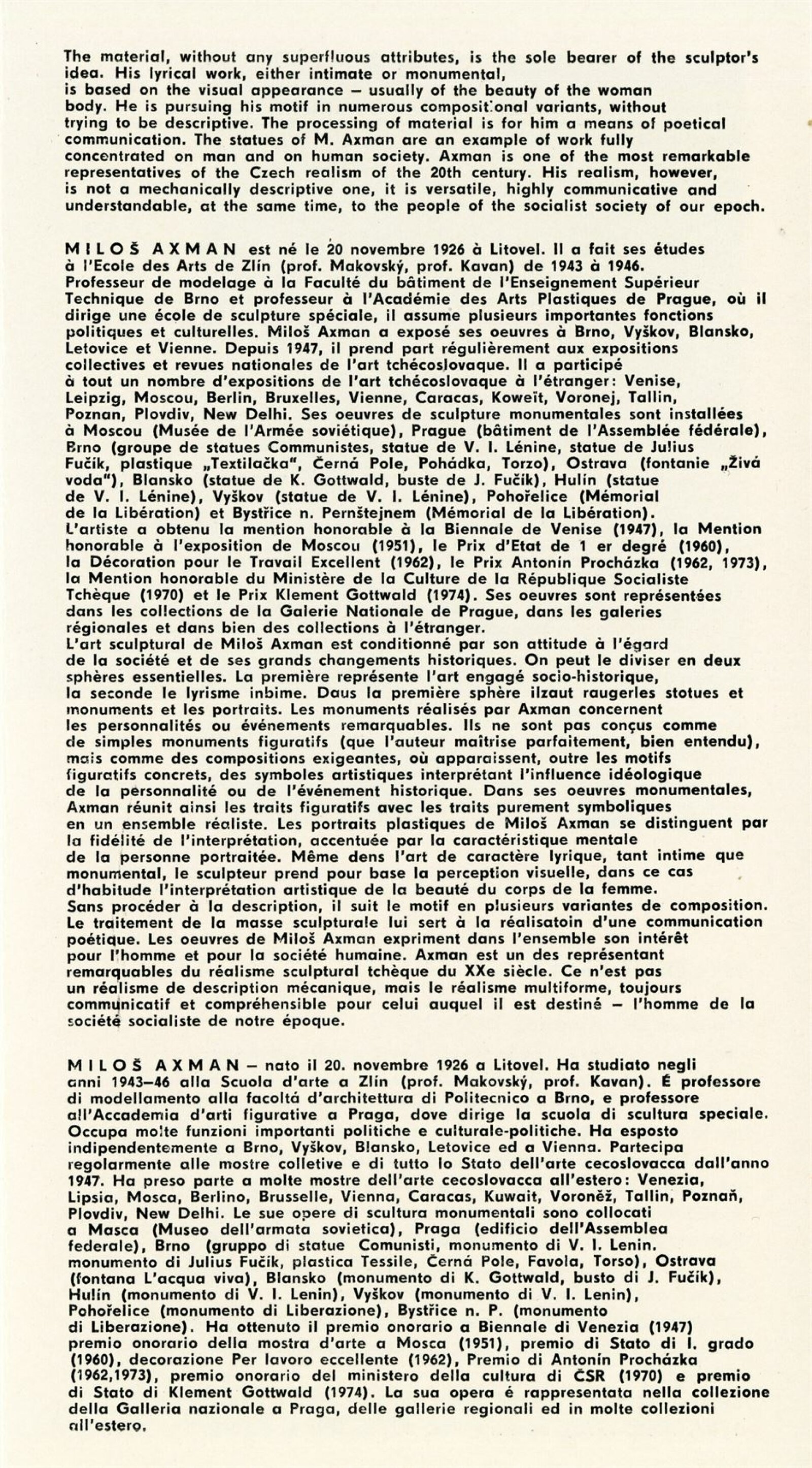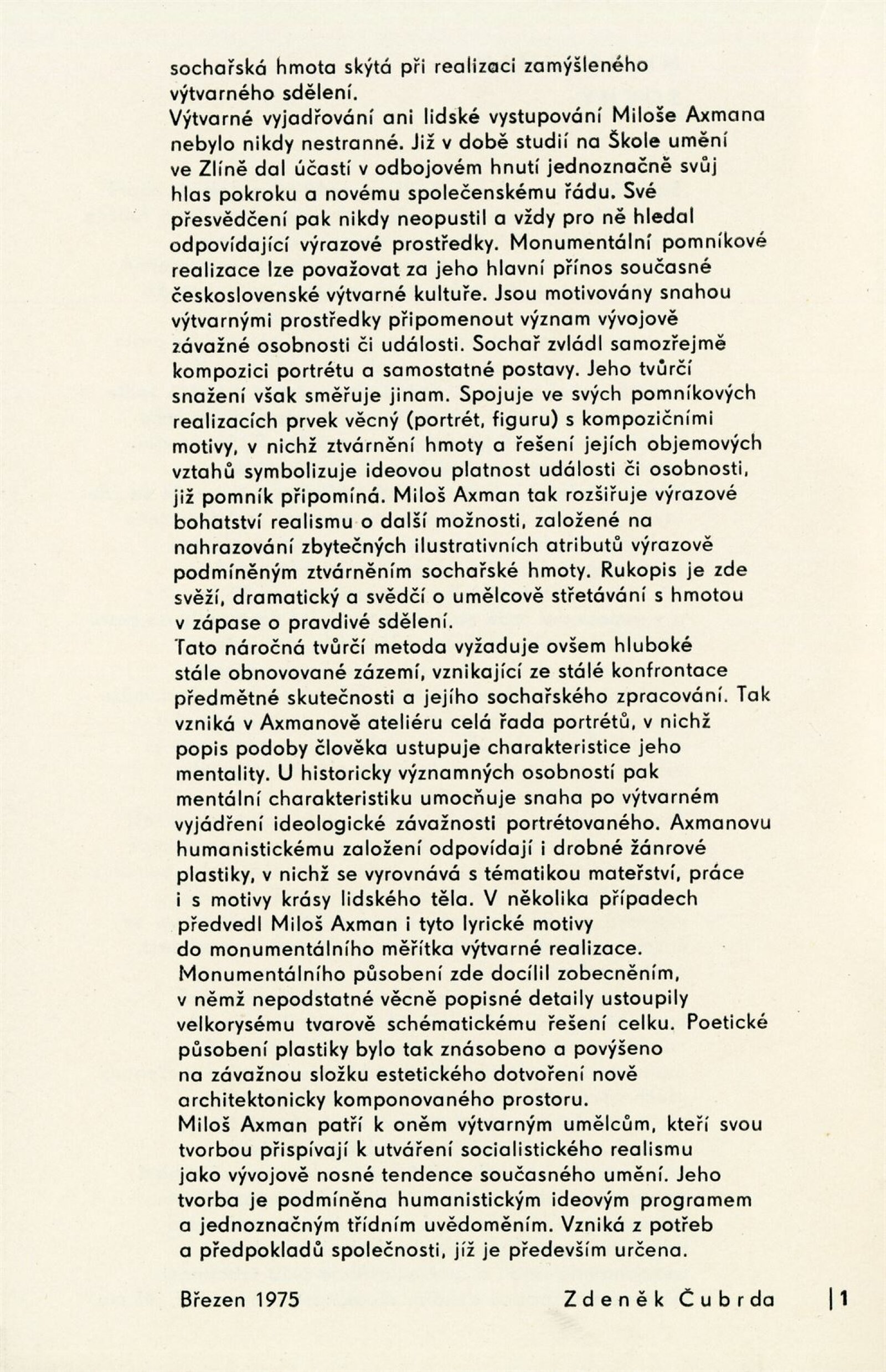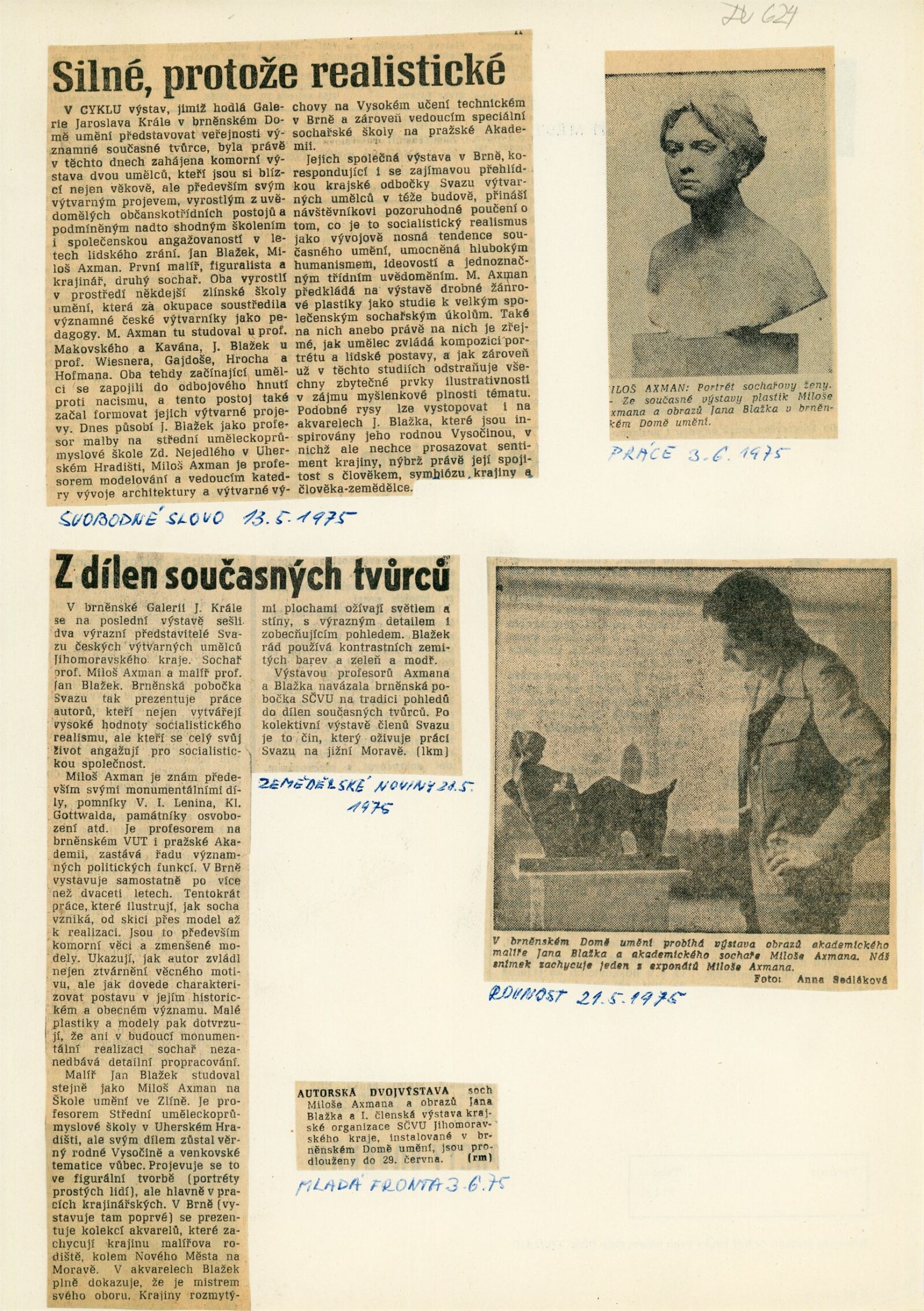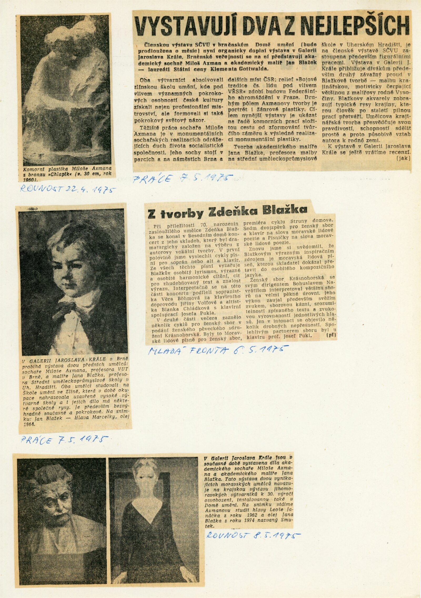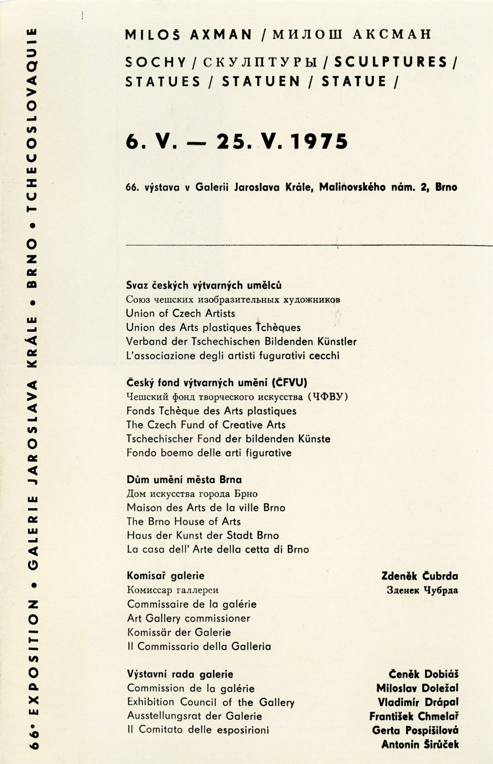 Miloš Axman. Sochy: Dům umění, 66. výstava v Galerii Jaroslava Krále, 6. 5. – 25. 5. 1975 / Text: Zdeněk Čubrda. – Brno: ČFVU, 1975. – 14 s., obr.. seznam vystavených prací 1 s., portrét, životopis, monumentální realizace, ceny, DU 624. – MZK; MG / Jan Blažek: Dům umění, 66. výstava v Galerii Jaroslava Krále, 6. 5. – 25. 5. 1975 / Text: Zdeněk Čubrda. – Brno: ČFVU, 1975. – 14 s., obr., seznam vystavených prací 1 s., portrét, životopis, ceny, DU 624. – MZK; MG