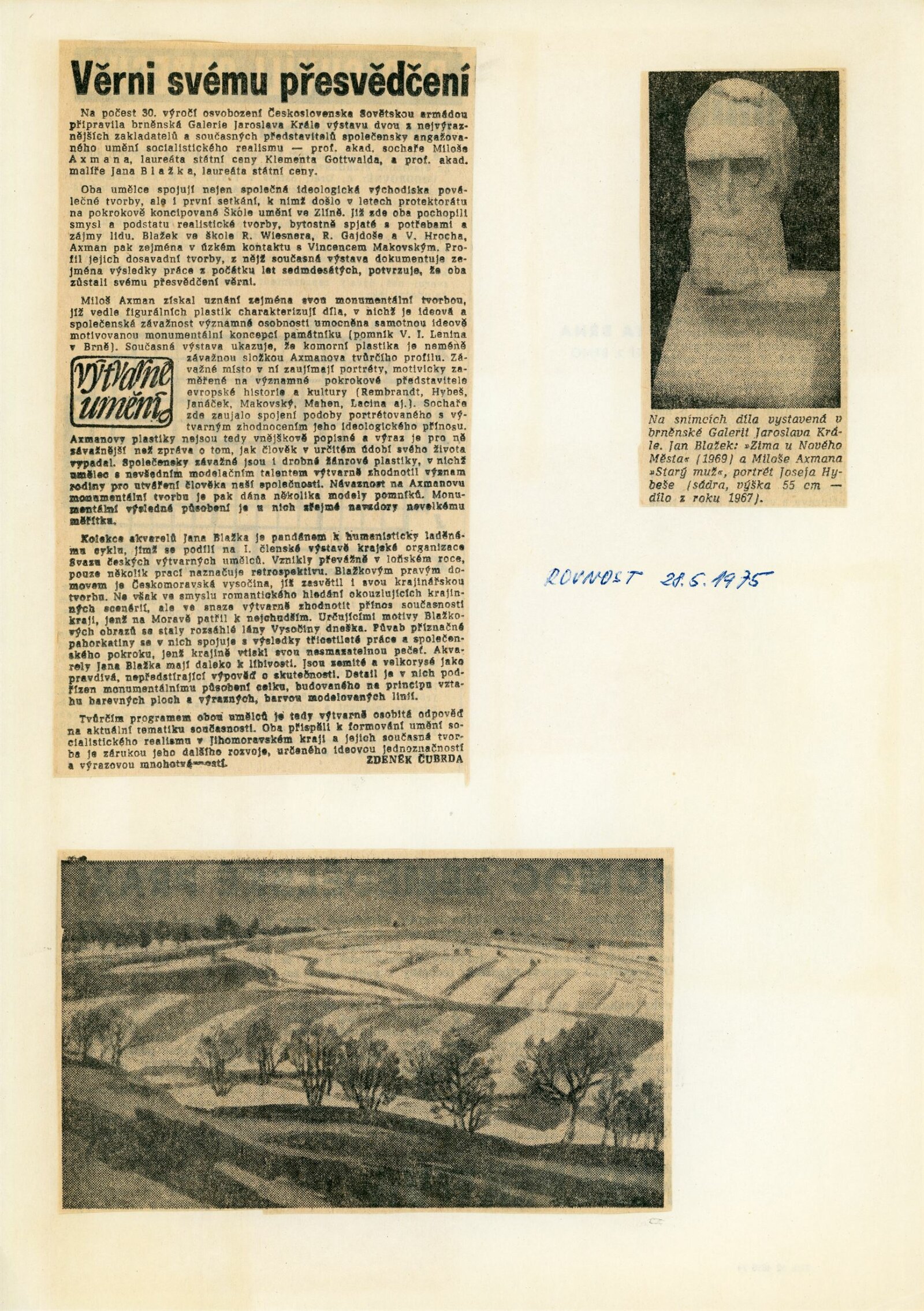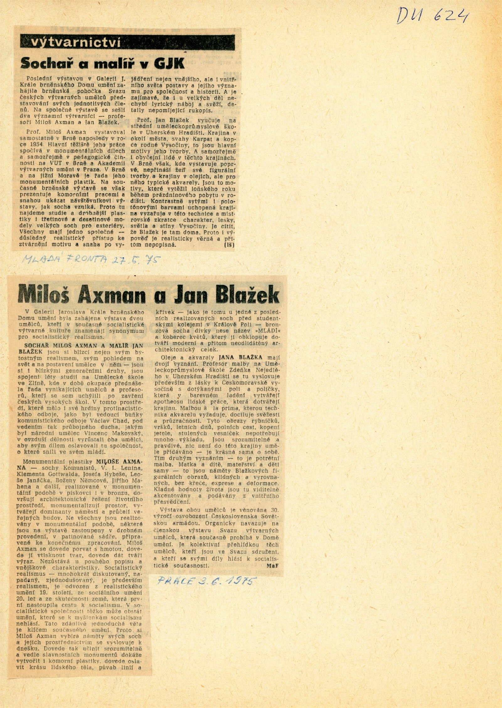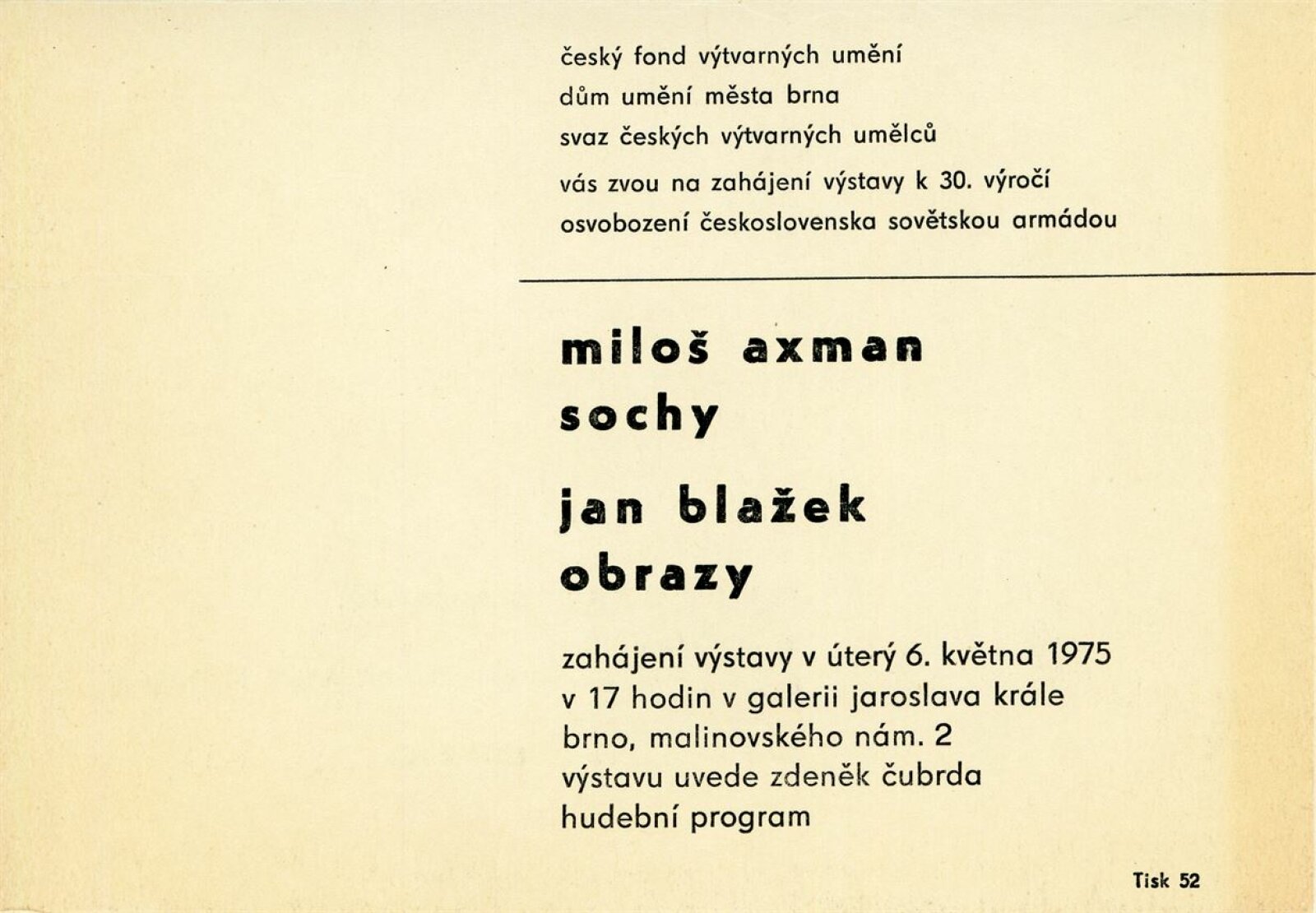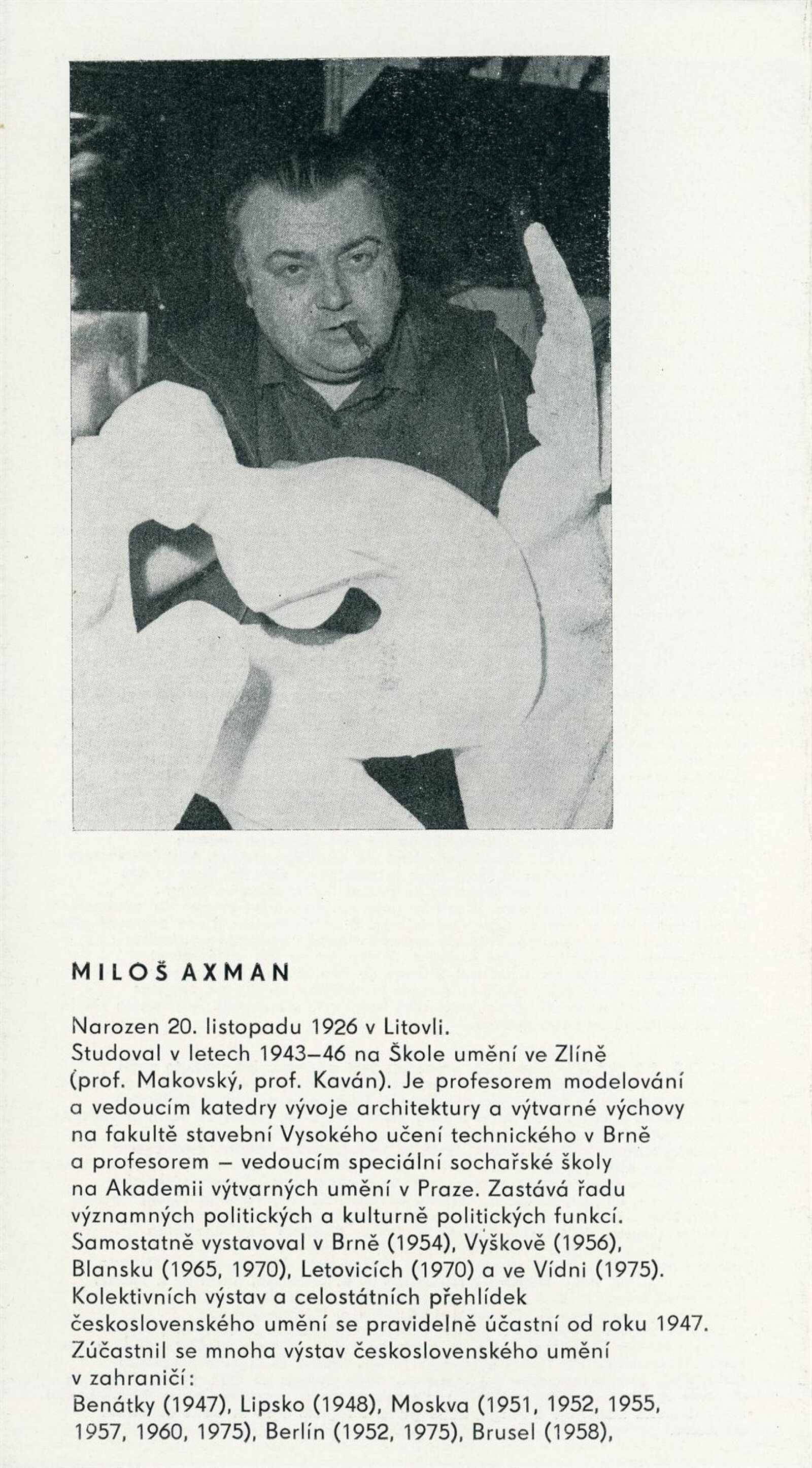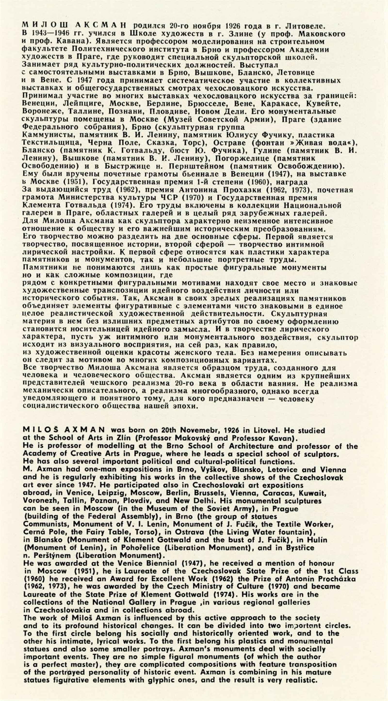 Miloš Axman. Sochy: Dům umění, 66. výstava v Galerii Jaroslava Krále, 6. 5. – 25. 5. 1975 / Text: Zdeněk Čubrda. – Brno: ČFVU, 1975. – 14 s., obr.. seznam vystavených prací 1 s., portrét, životopis, monumentální realizace, ceny, DU 624. – MZK; MG / Jan Blažek: Dům umění, 66. výstava v Galerii Jaroslava Krále, 6. 5. – 25. 5. 1975 / Text: Zdeněk Čubrda. – Brno: ČFVU, 1975. – 14 s., obr., seznam vystavených prací 1 s., portrét, životopis, ceny, DU 624. – MZK; MG