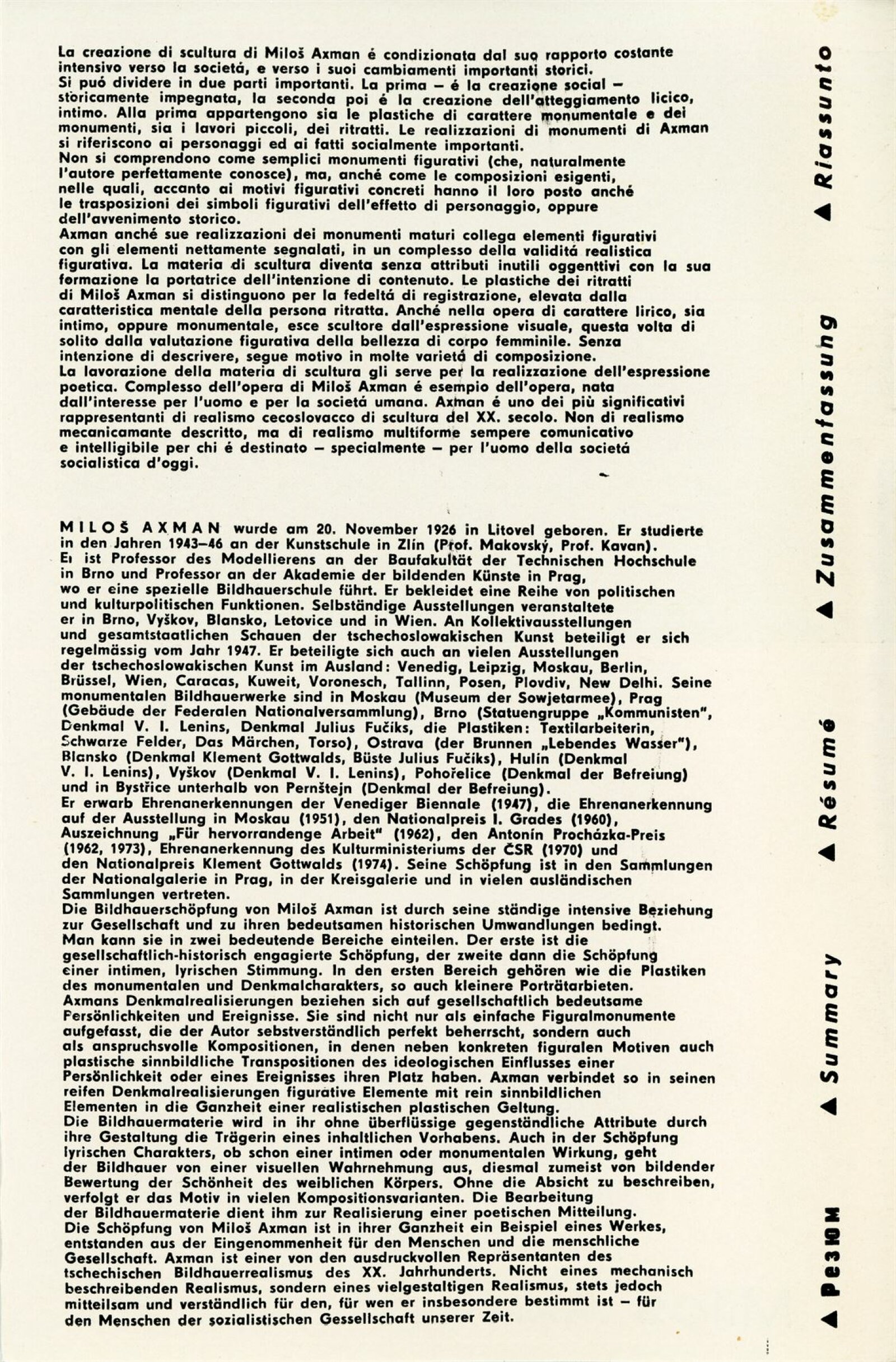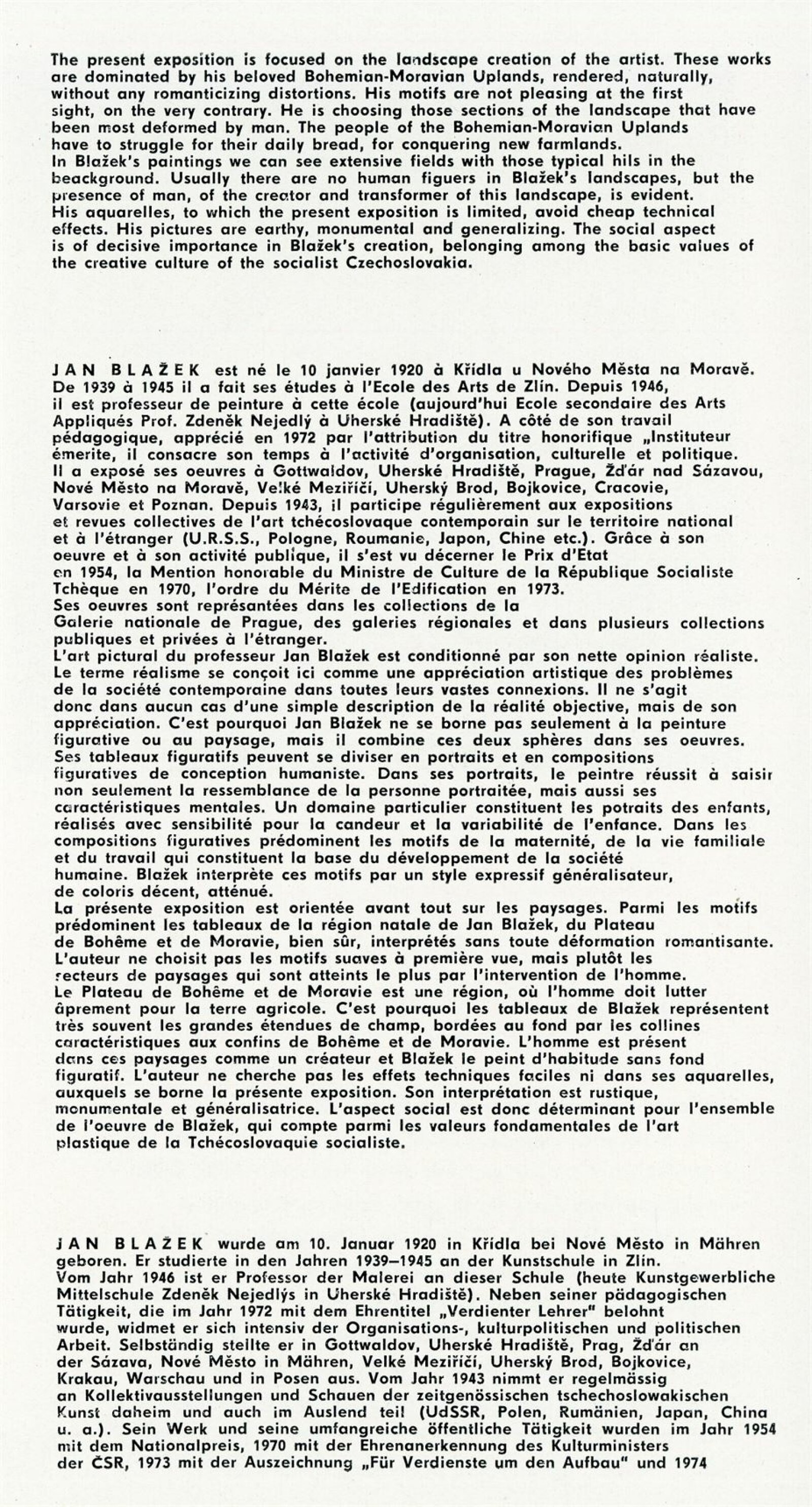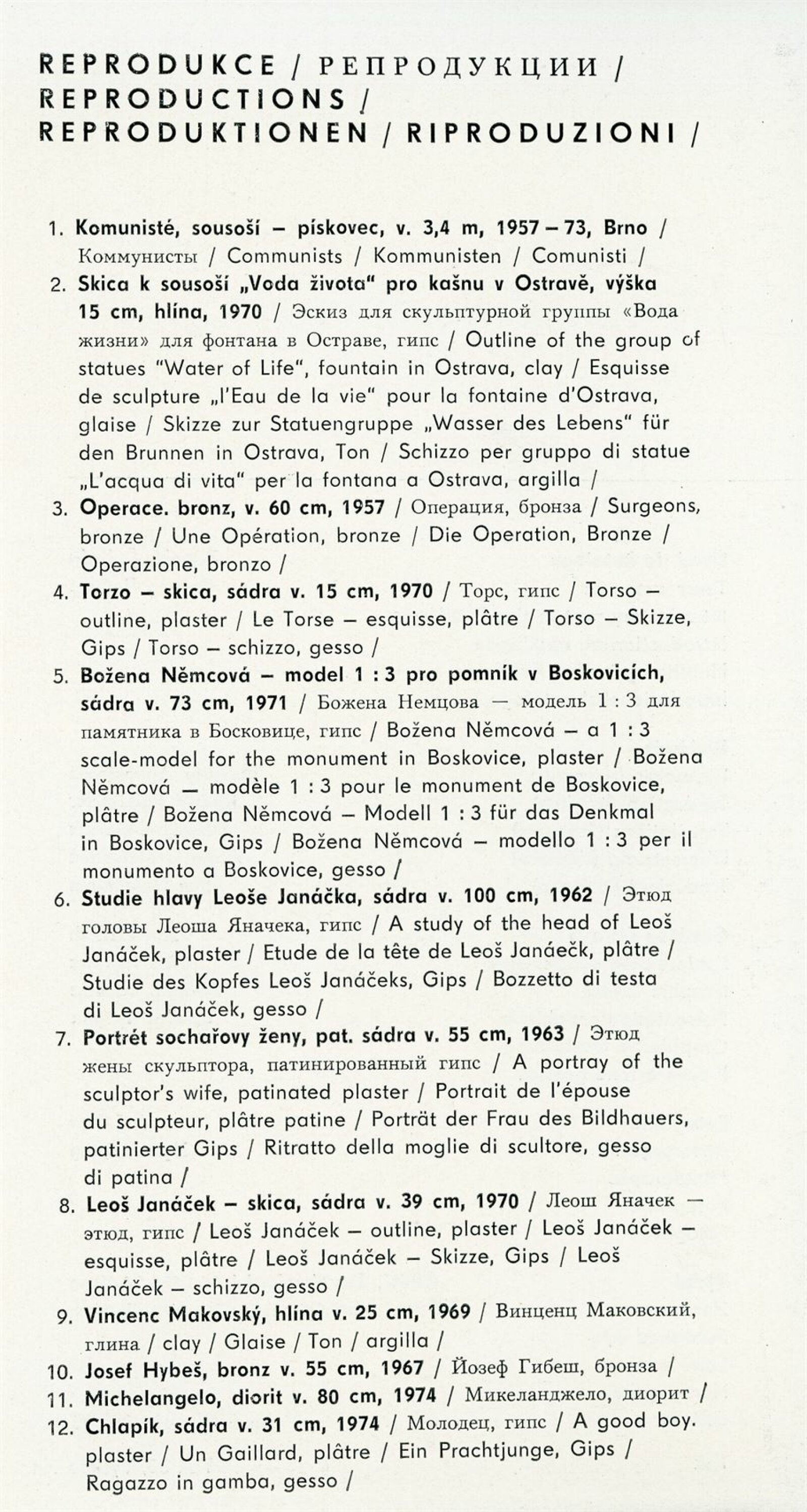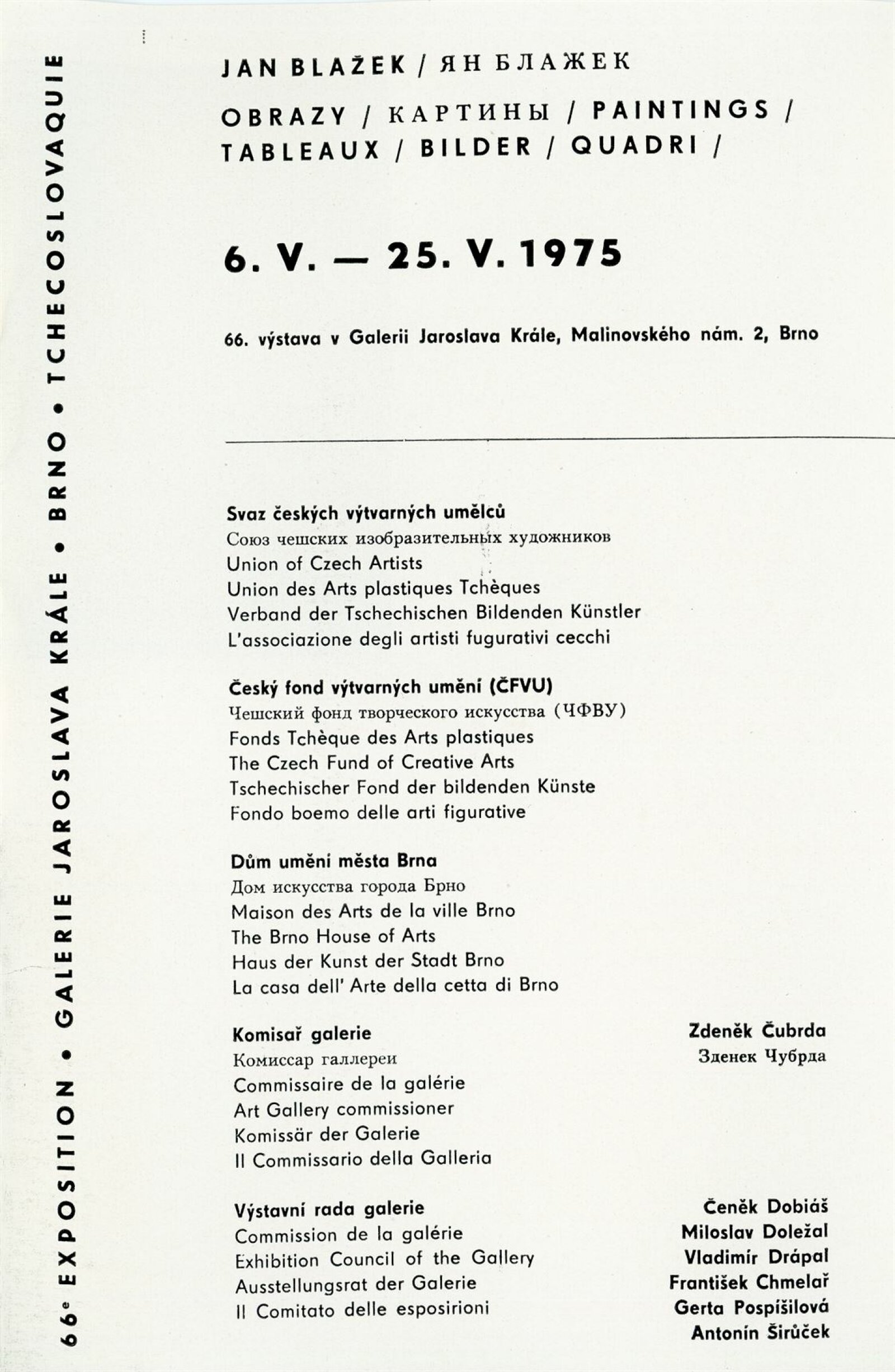 Miloš Axman. Sochy: Dům umění, 66. výstava v Galerii Jaroslava Krále, 6. 5. – 25. 5. 1975 / Text: Zdeněk Čubrda. – Brno: ČFVU, 1975. – 14 s., obr.. seznam vystavených prací 1 s., portrét, životopis, monumentální realizace, ceny, DU 624. – MZK; MG / Jan Blažek: Dům umění, 66. výstava v Galerii Jaroslava Krále, 6. 5. – 25. 5. 1975 / Text: Zdeněk Čubrda. – Brno: ČFVU, 1975. – 14 s., obr., seznam vystavených prací 1 s., portrét, životopis, ceny, DU 624. – MZK; MG