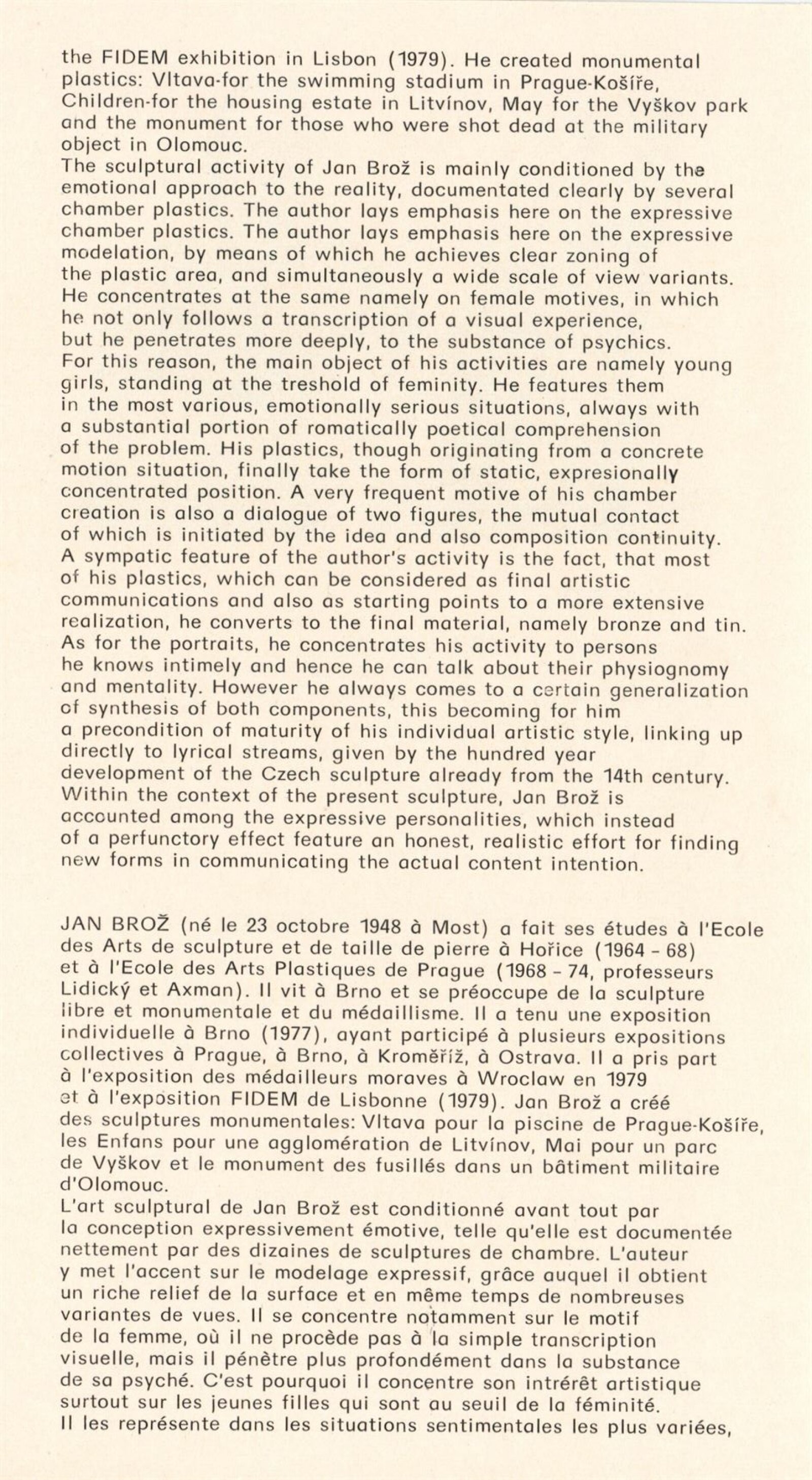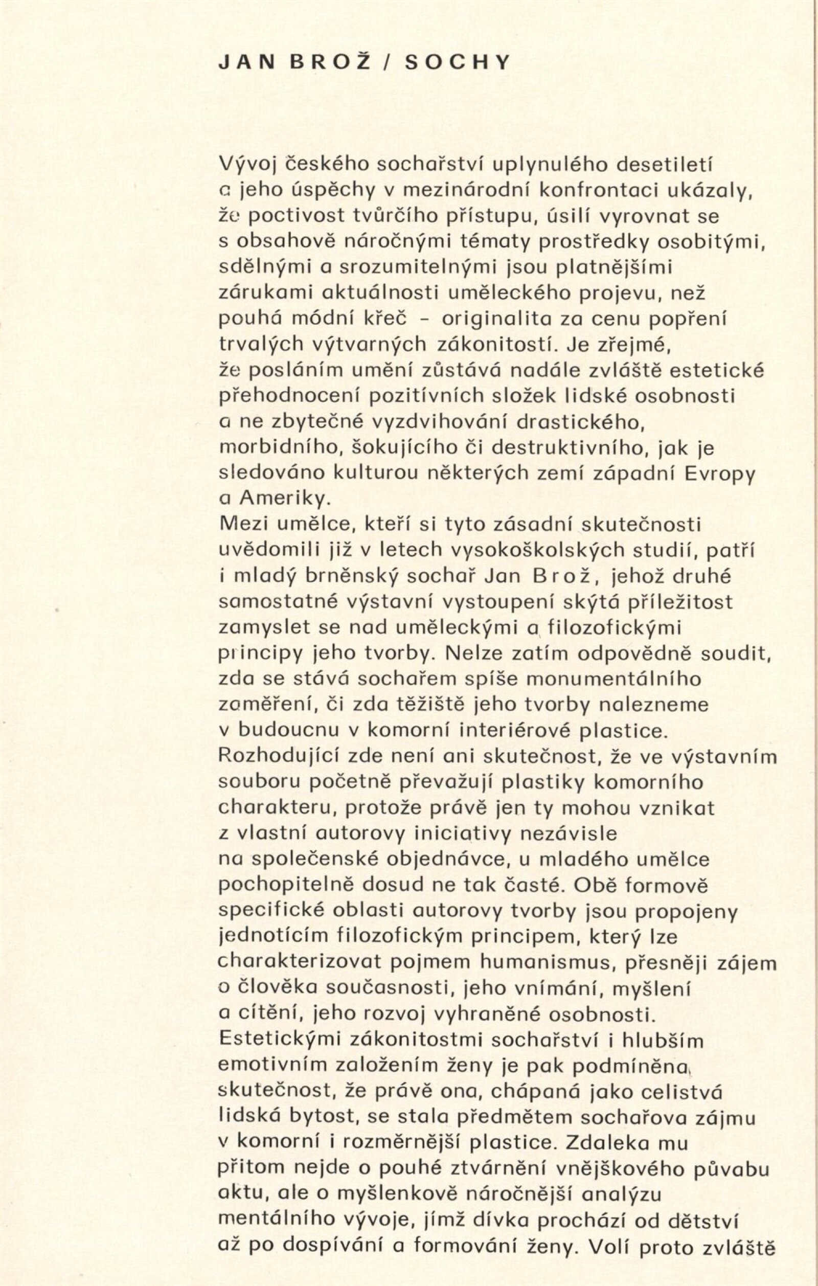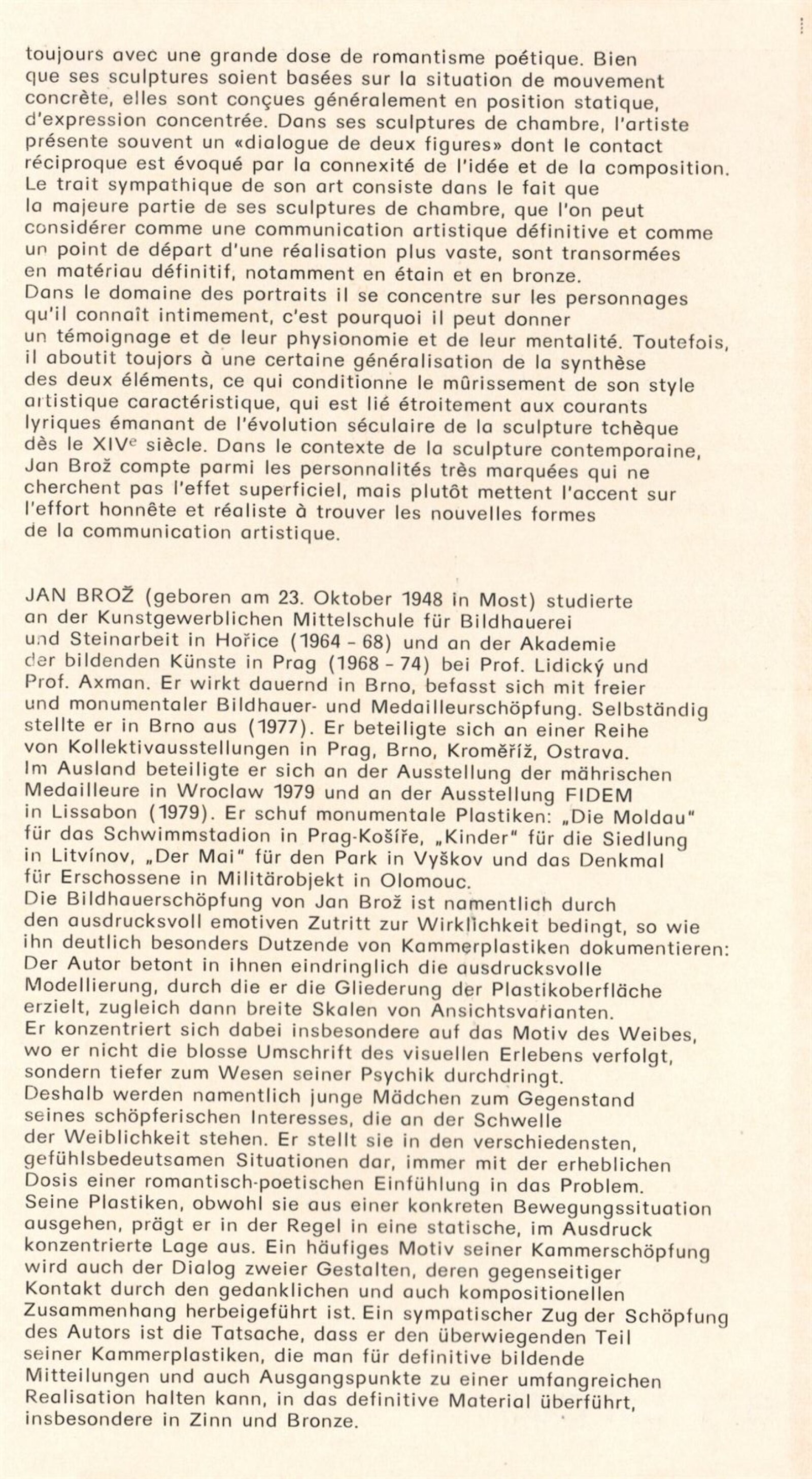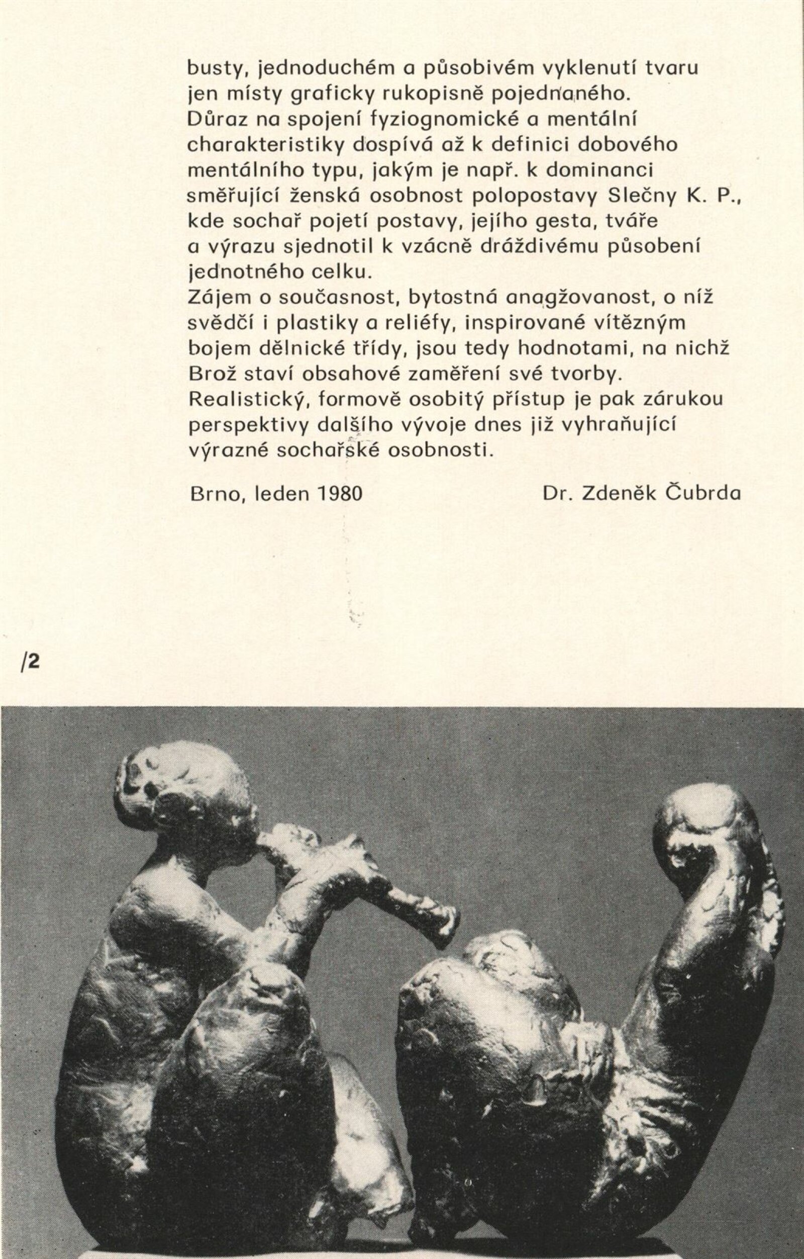 Jan Brož. Sochy: Dům umění, 98. výstava v Galerii Jaroslava Krále, 21. 2. – 23. 3. 1980 / Text: Zdeněk Čubrda. – Brno: ČFVU, 1980. – 10 s., obr., seznam vystavených prací 2 s., portrét, životní data, výstavy, realizace, DU 710. – MZK; MG