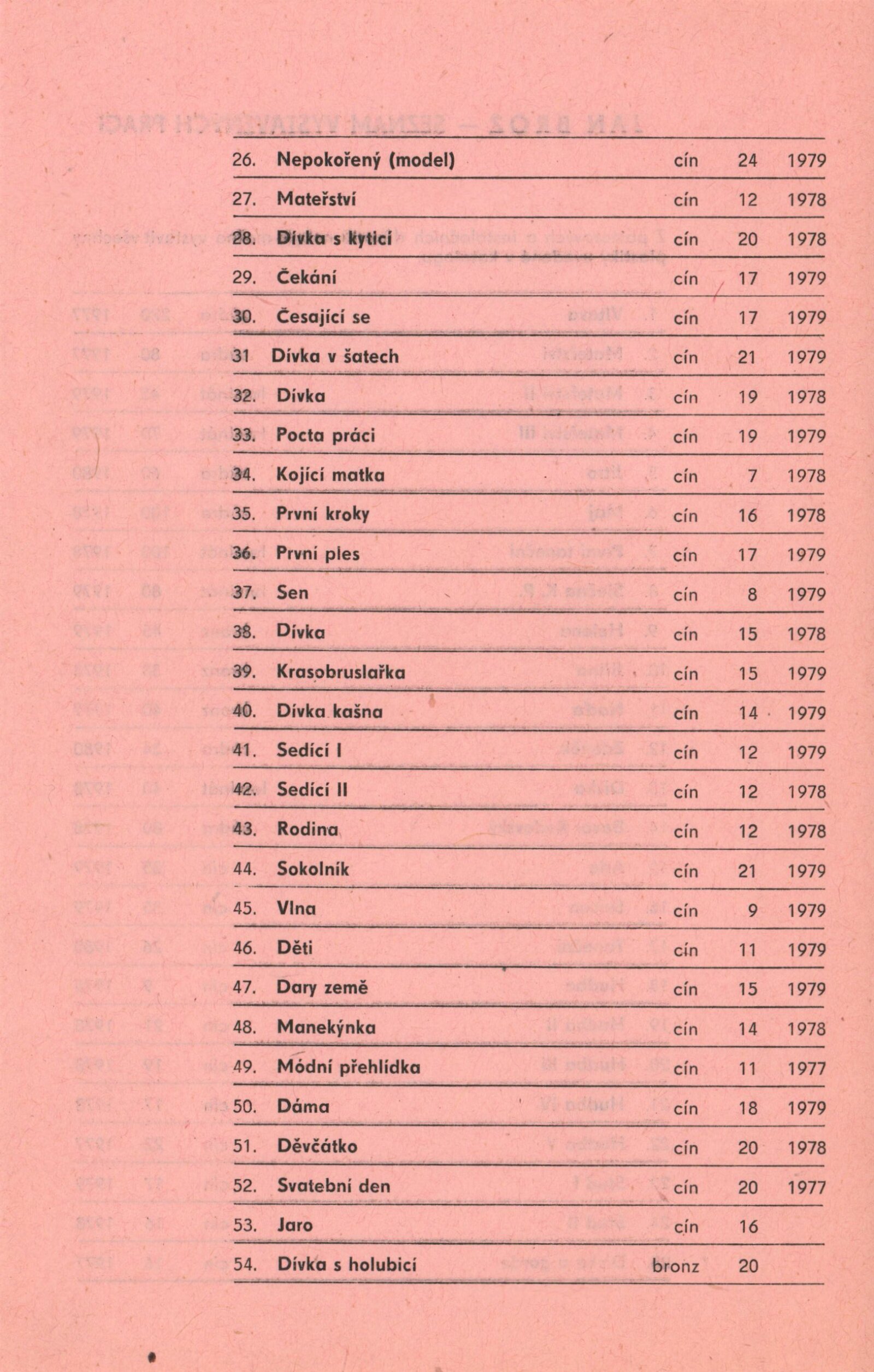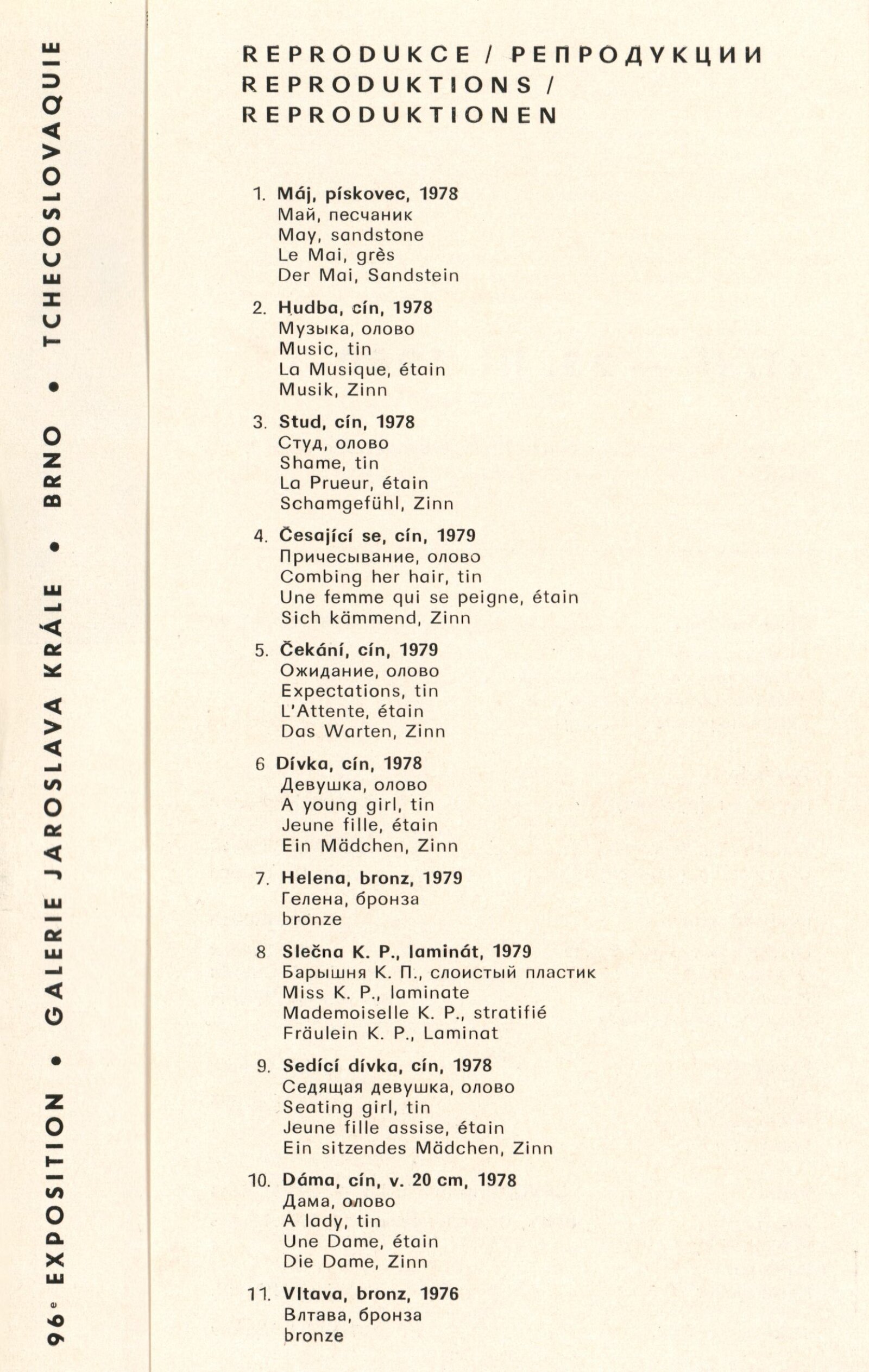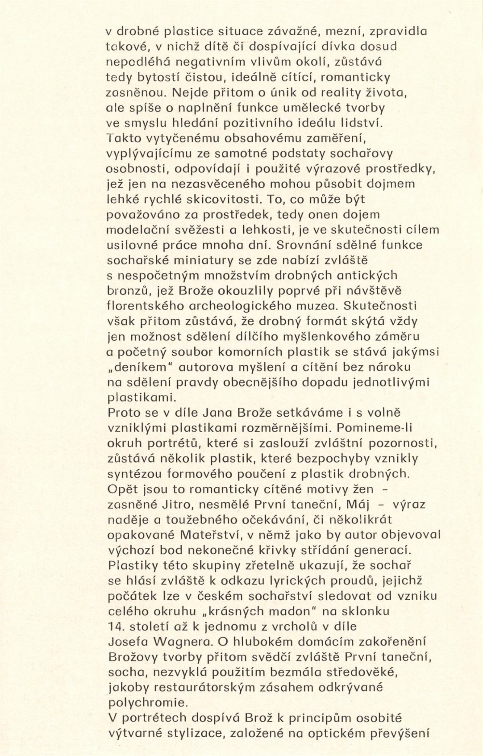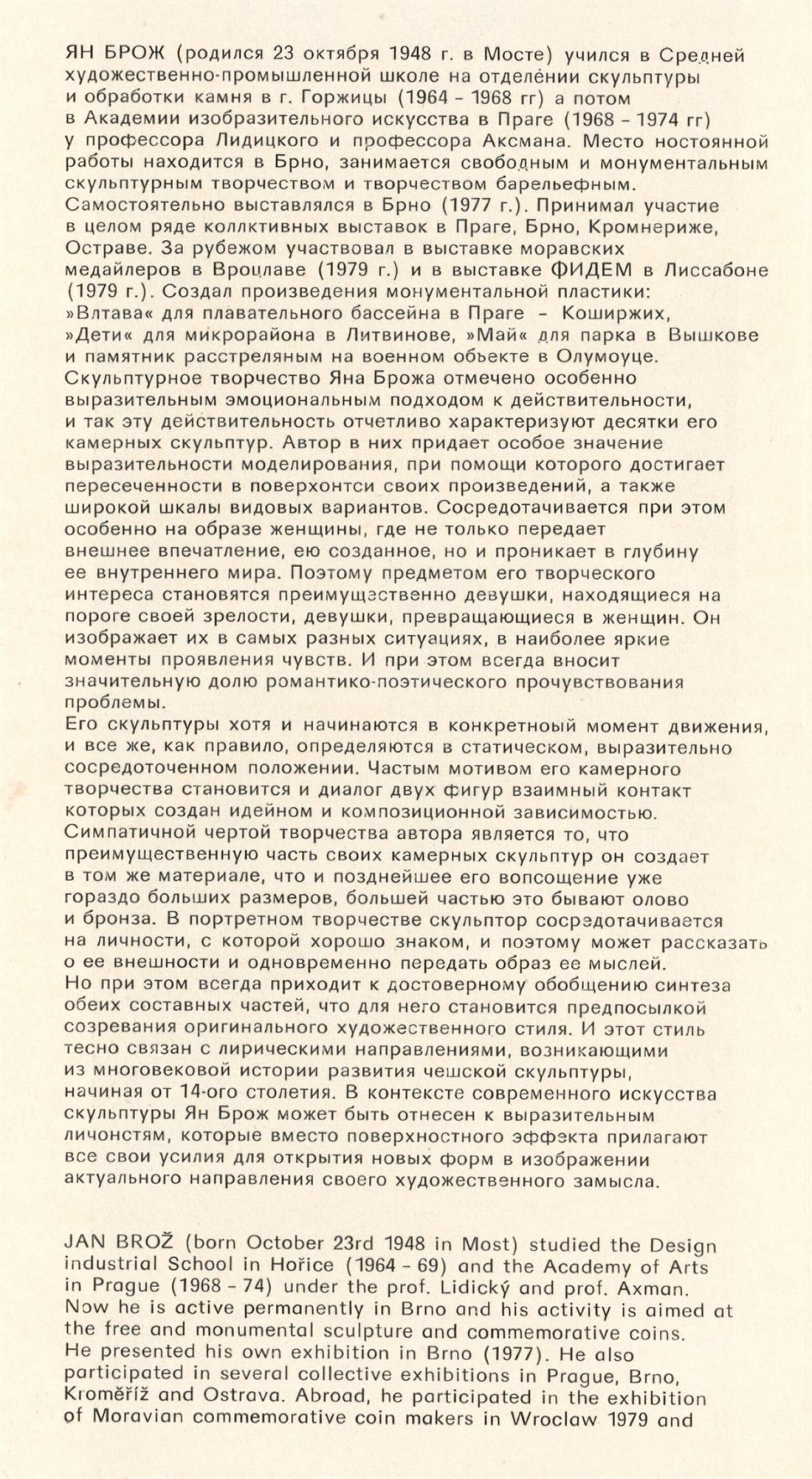 Jan Brož. Sochy: Dům umění, 98. výstava v Galerii Jaroslava Krále, 21. 2. – 23. 3. 1980 / Text: Zdeněk Čubrda. – Brno: ČFVU, 1980. – 10 s., obr., seznam vystavených prací 2 s., portrét, životní data, výstavy, realizace, DU 710. – MZK; MG