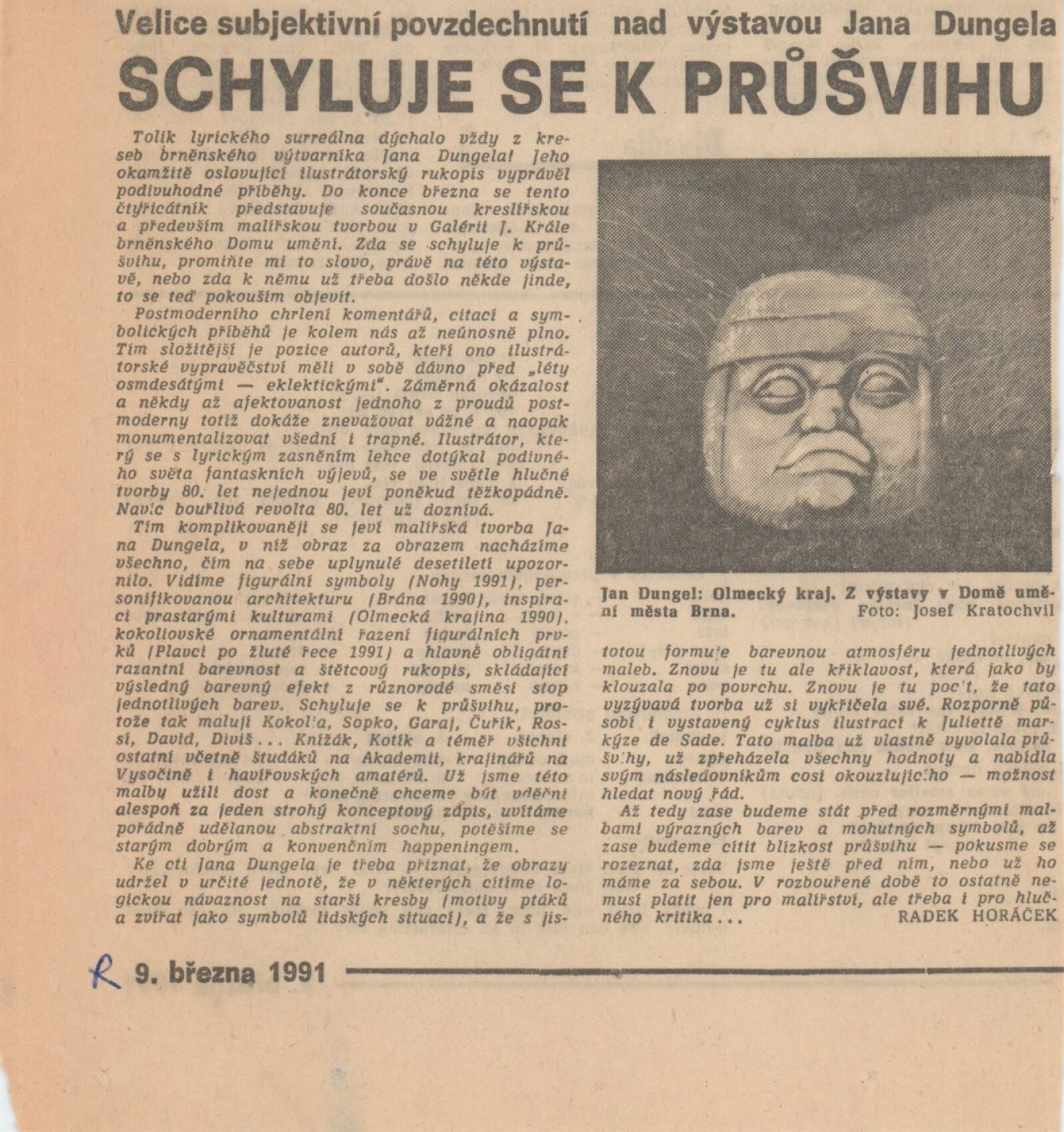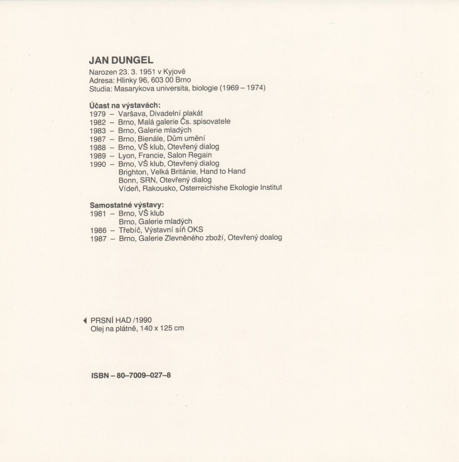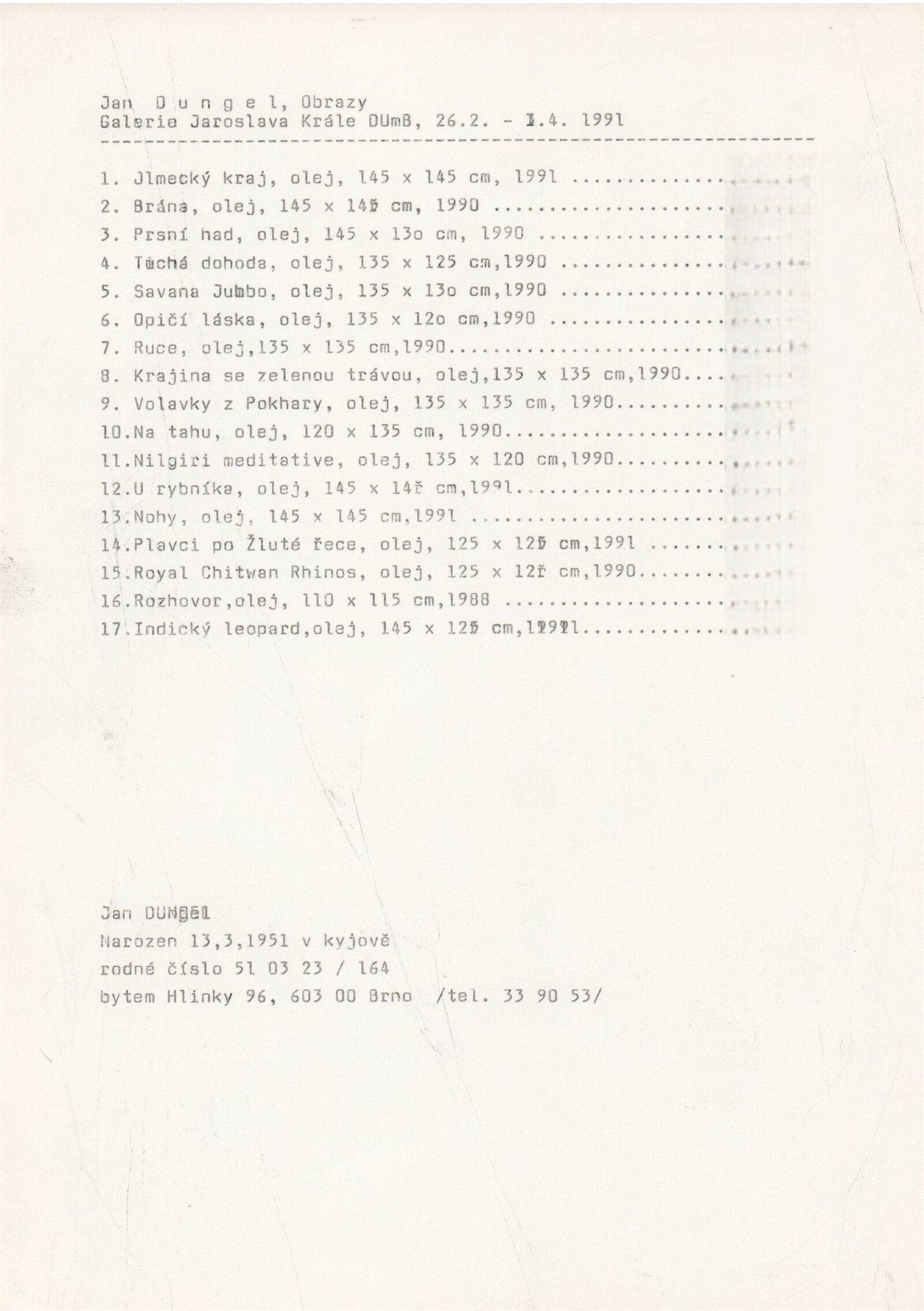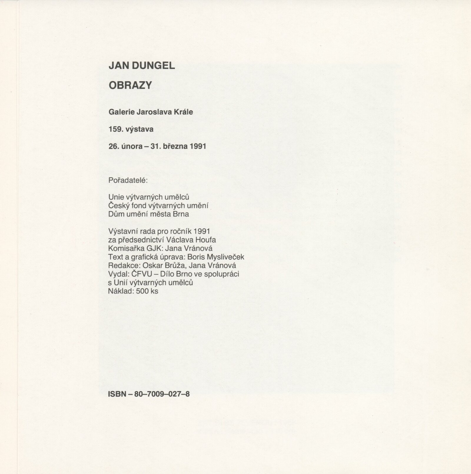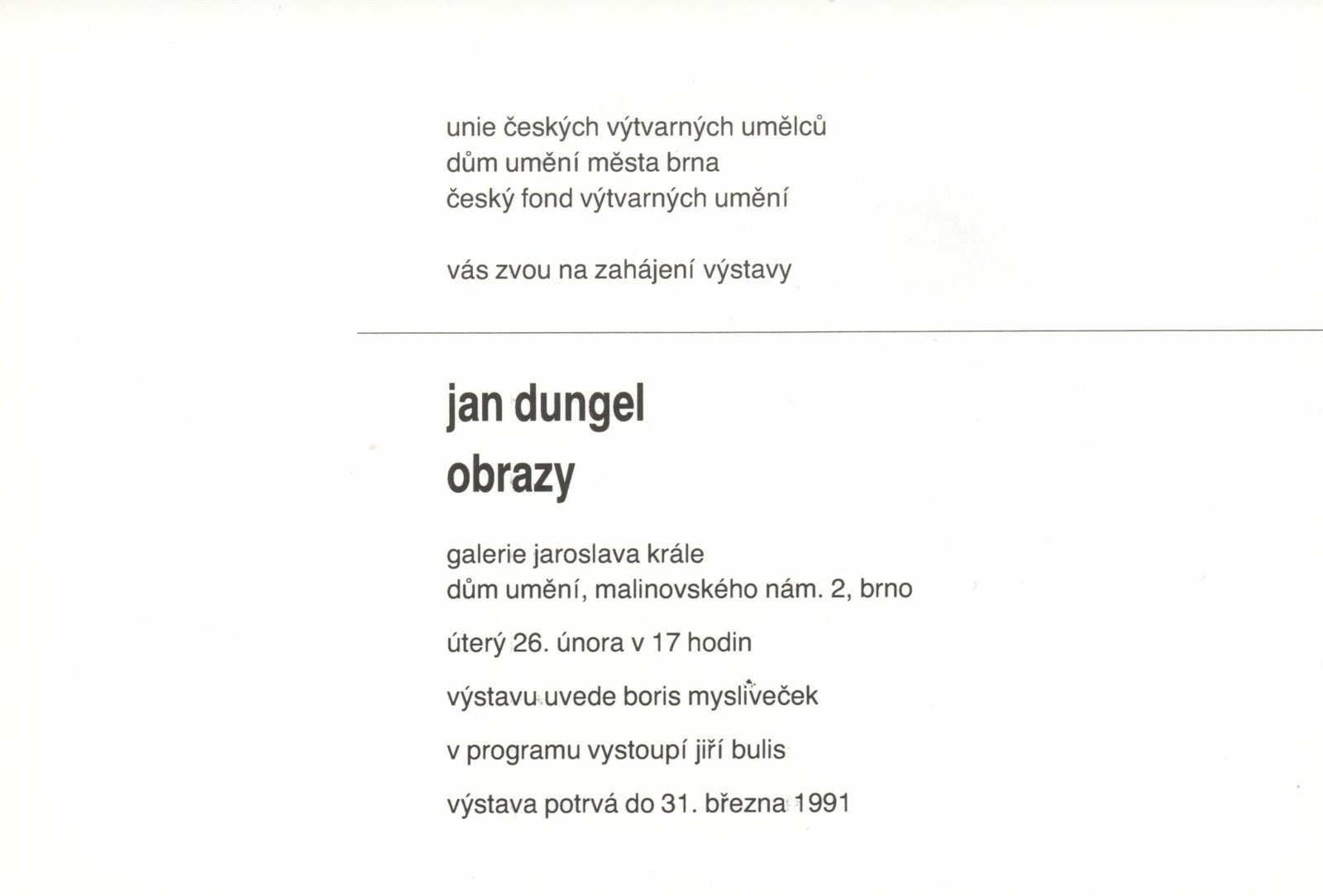 Jan Dungel. Obrazy: Dům umění měst Brna, 159. výstava v Galerii Jaroslava Krále, 26. 2. – 31. 3. 1991 / Text: Boris Mysliveček. – Brno: ČFVU-Dílo, 1991. – [4] s., obr., obr. na obalu [4] s., životní data, výstavy, DU 896. – MZK; MG