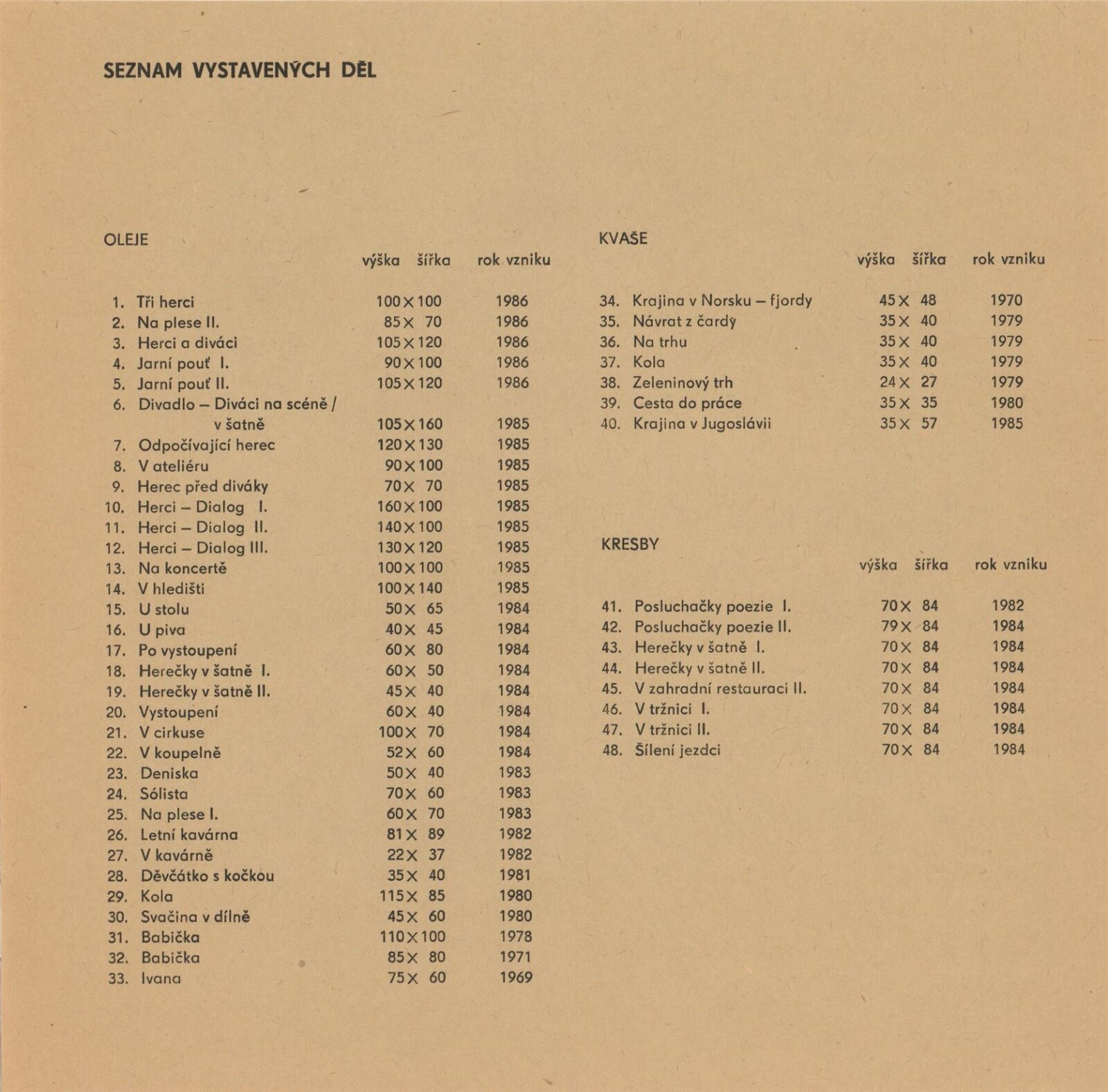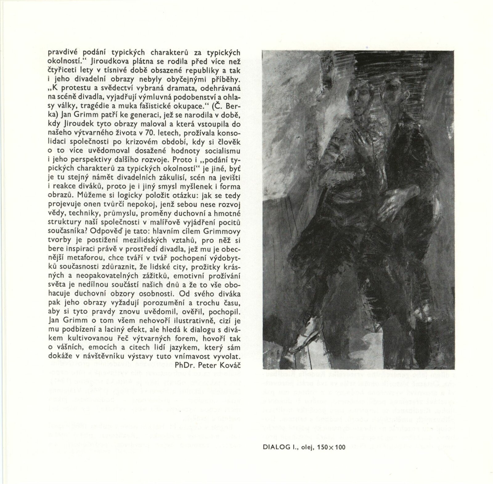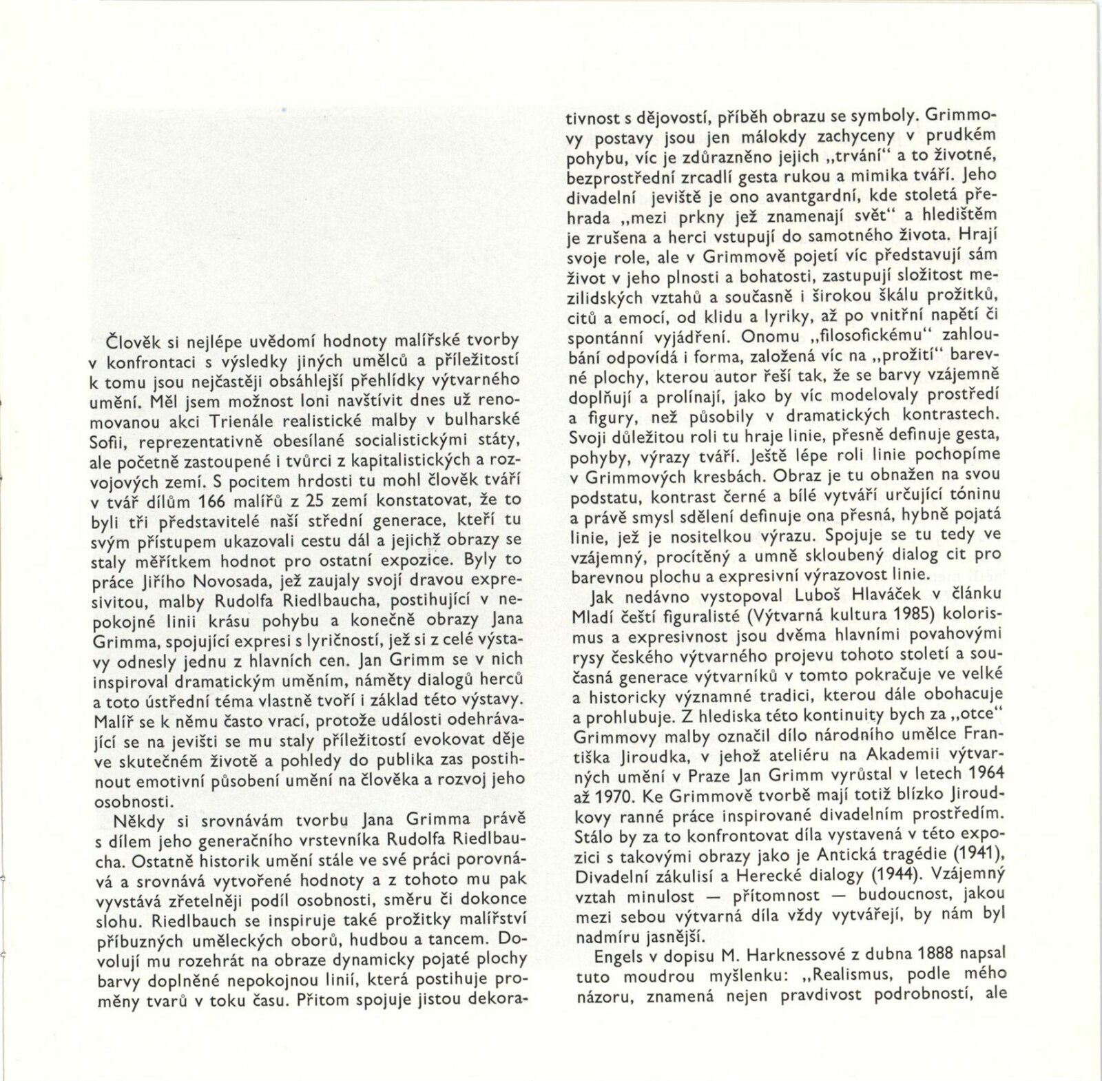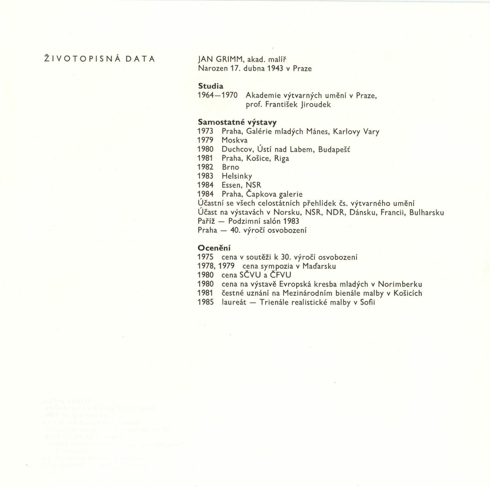 Jan Grimm. Obrazy a kresby: Dům umění, Galerie Jaroslava Krále, 3. 10. – 26. 10. 1986 / Text: Peter Kováč. – Litoměřice: Severočeská galerie, 1986. – [12] s., obr., seznam vystavených děl [1] s., životopisná data, výstavy, ceny, DU 823. – MZK; MG