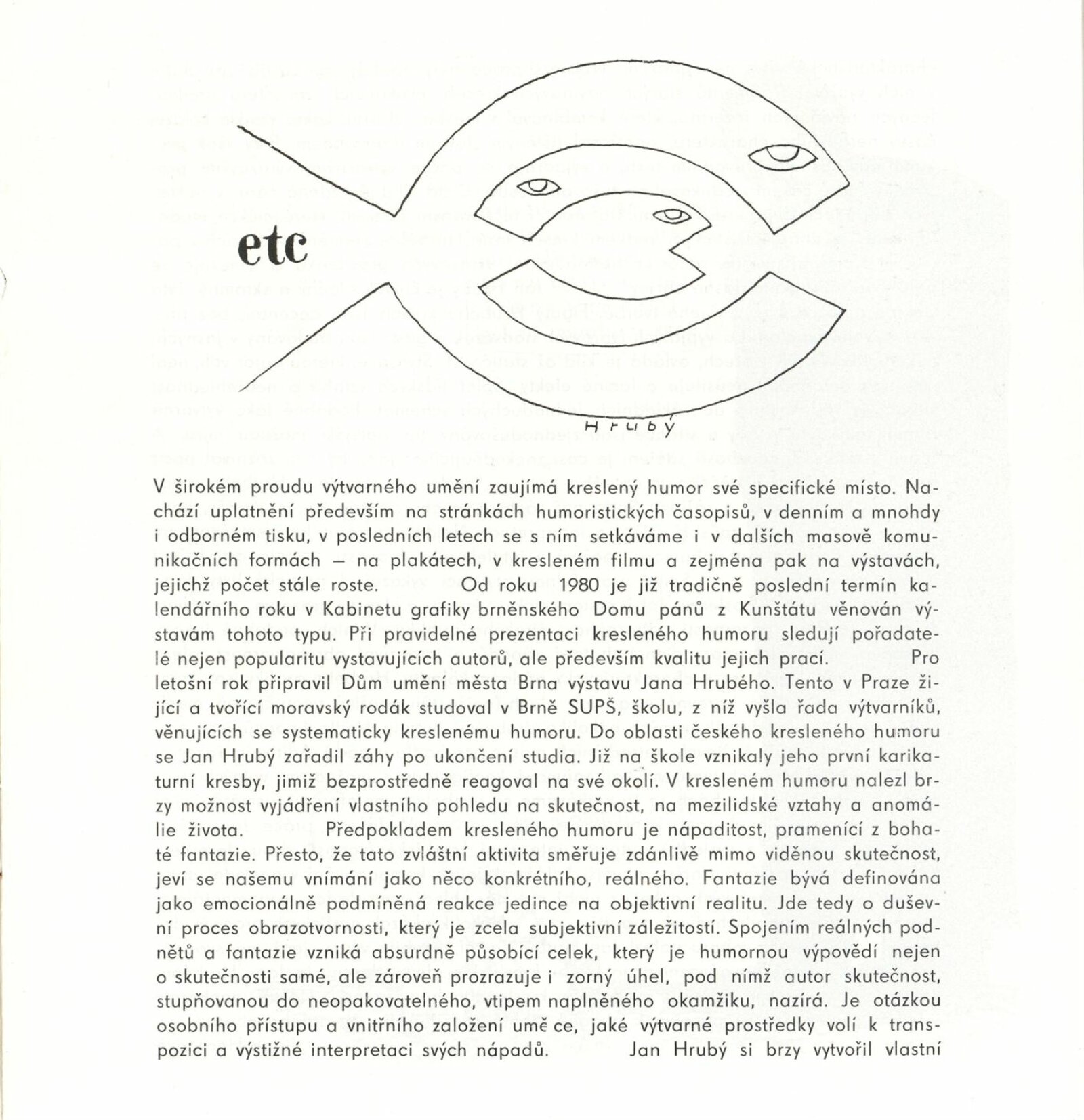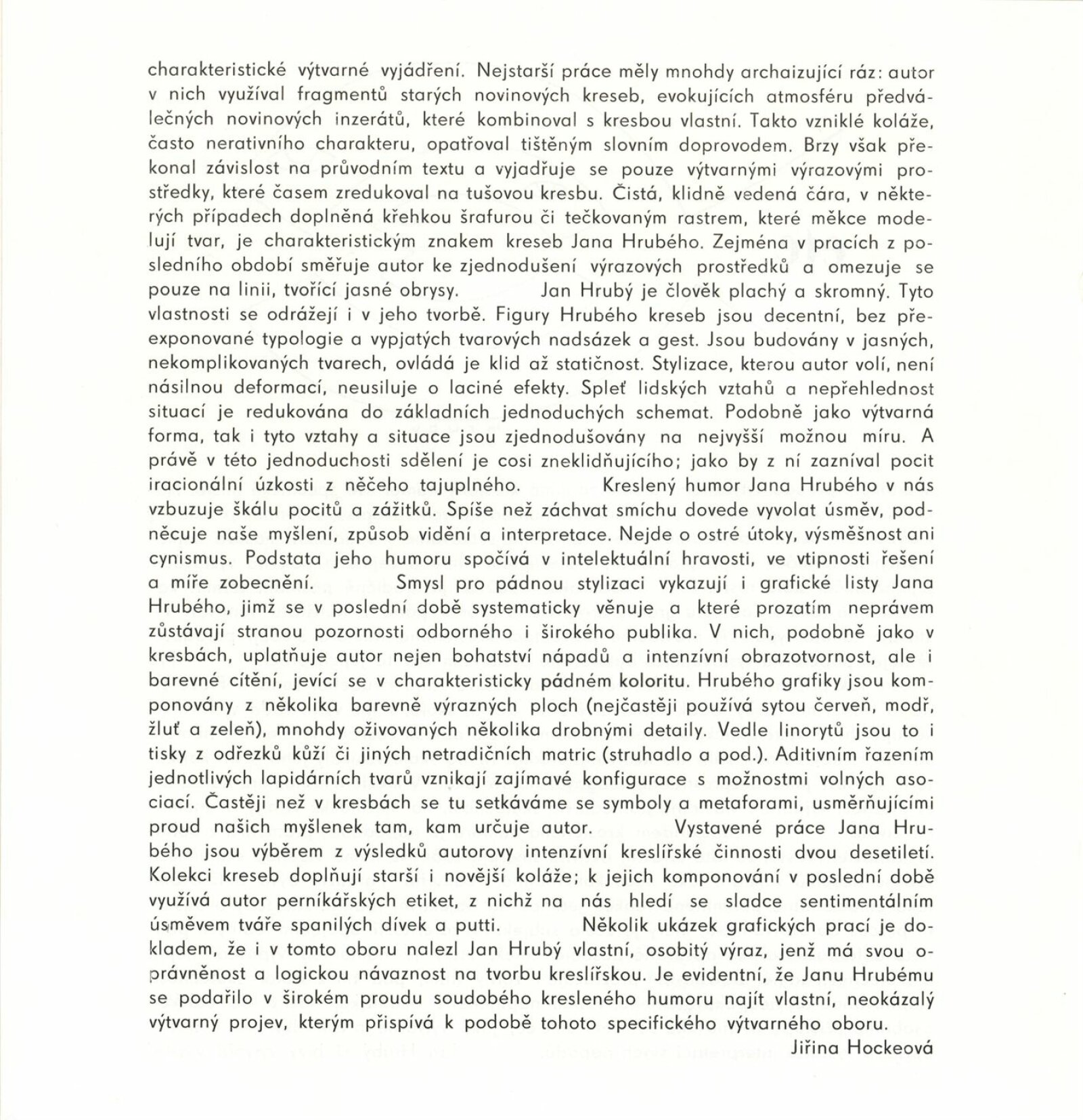 Jan Hrubý. Kreslený humor: Dům umění / Dům pánů z Kunštátu, Kabinet grafiky, 30. 11. 1988 – 1. 1. 1989 / Text: Jiřina Hockeová. – Brno: DUmB, 1988. – [12] s., obr., životní data, výstavy, ceny, ilustrace, DPK 913. – MZK; MG; MMB
