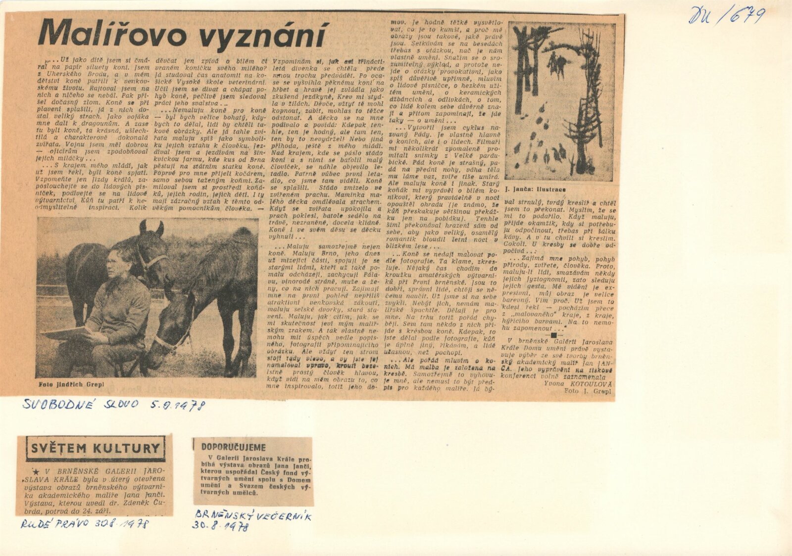 Jan Janča. Obrazy a kresby: 88. výstava v Galerii Jaroslava Krále 29. 8. – 24. 9. 1978 / Text Zdeněk Čubrda. - Brno: ČFVU, - 10 s., obr. Portrét, životní data, výstavy DU 679