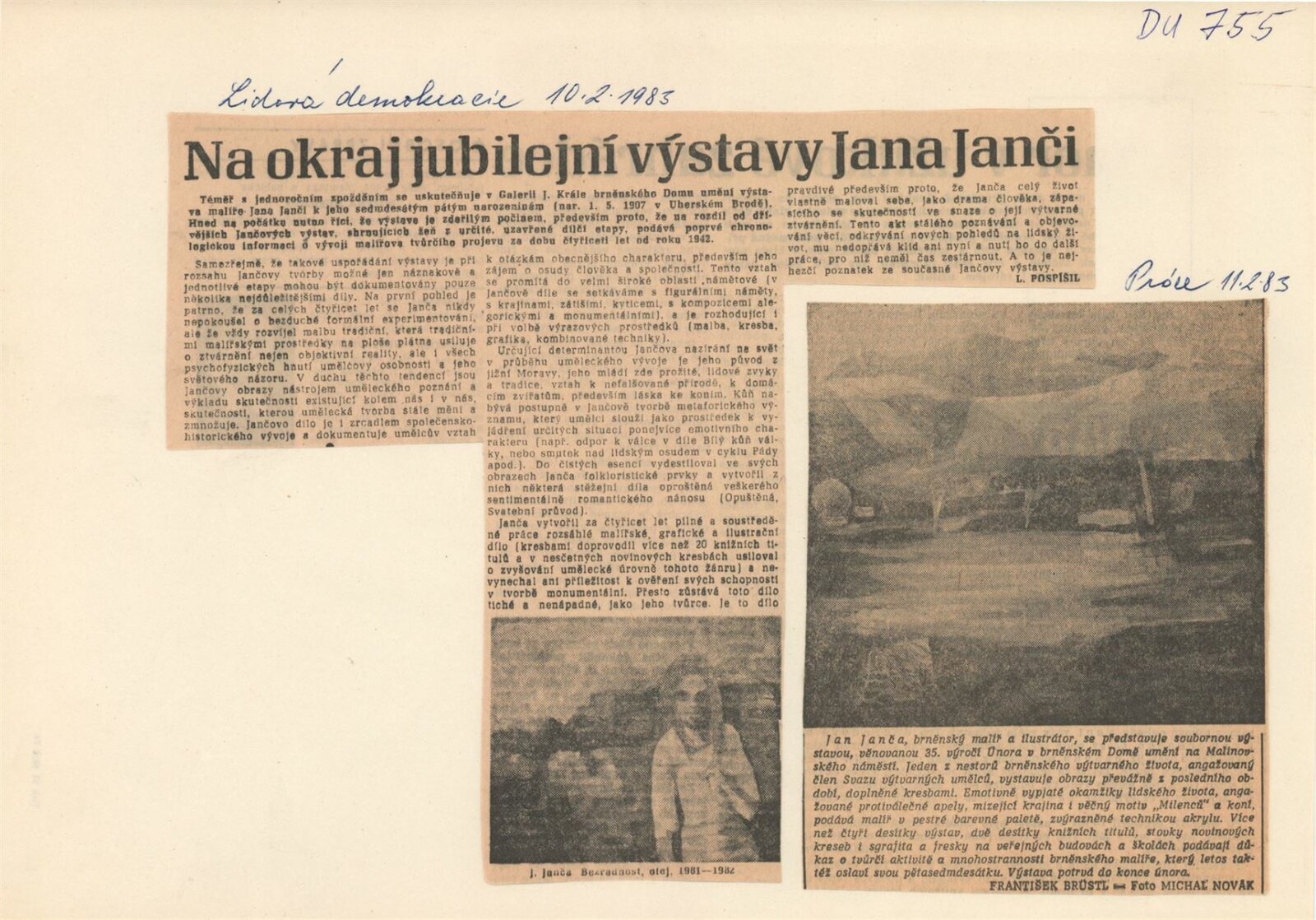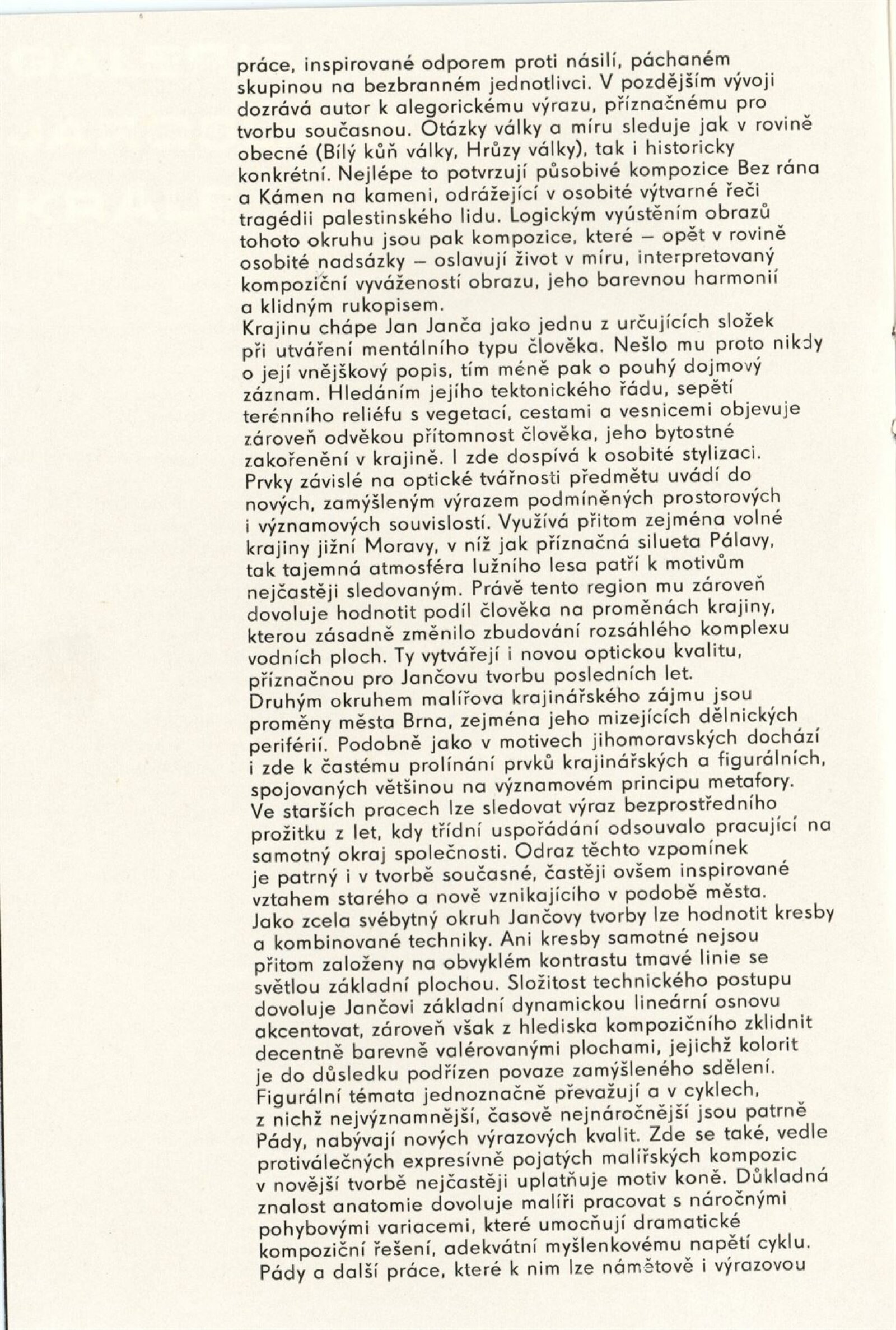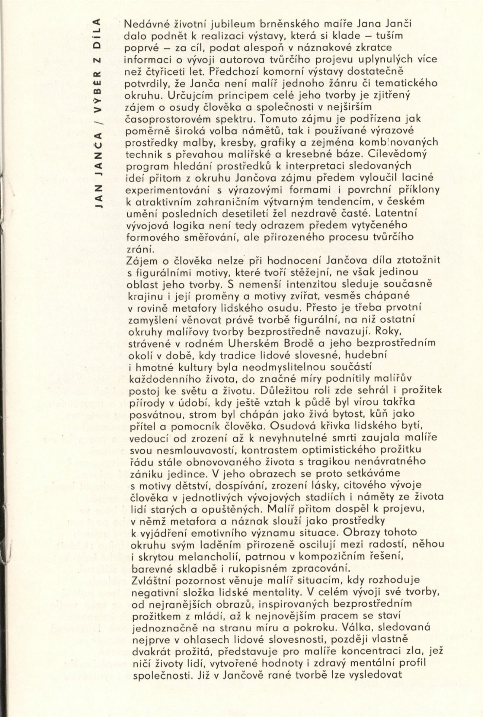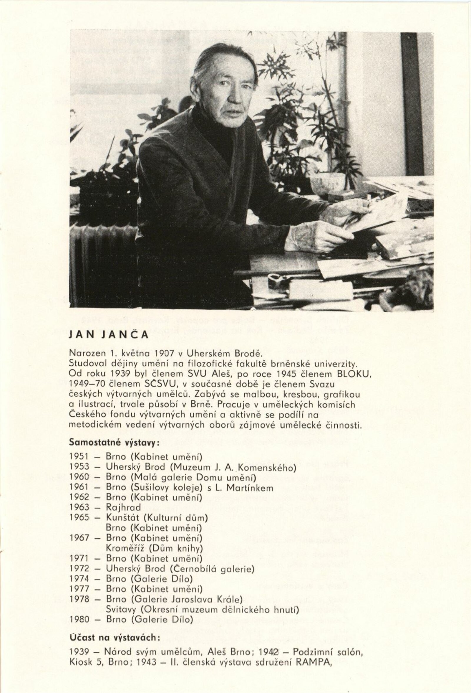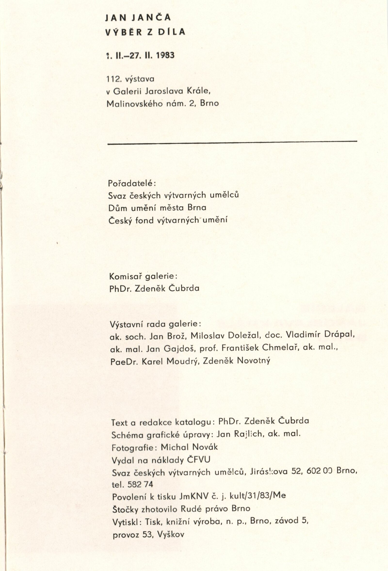 Jan Janča. Výběr z díla: Dům umění, 112. výstava v Galerii Jaroslava Krále, 1. 2. – 27. 2. 1983 / Text: Zdeněk Čubrda. – Brno: ČFVU, 1983. – 16 s., obr., seznam vystavených prací 4 s., portrét, životopis, knižní ilustrace, práce pro architekturu, ceny. – DU 755