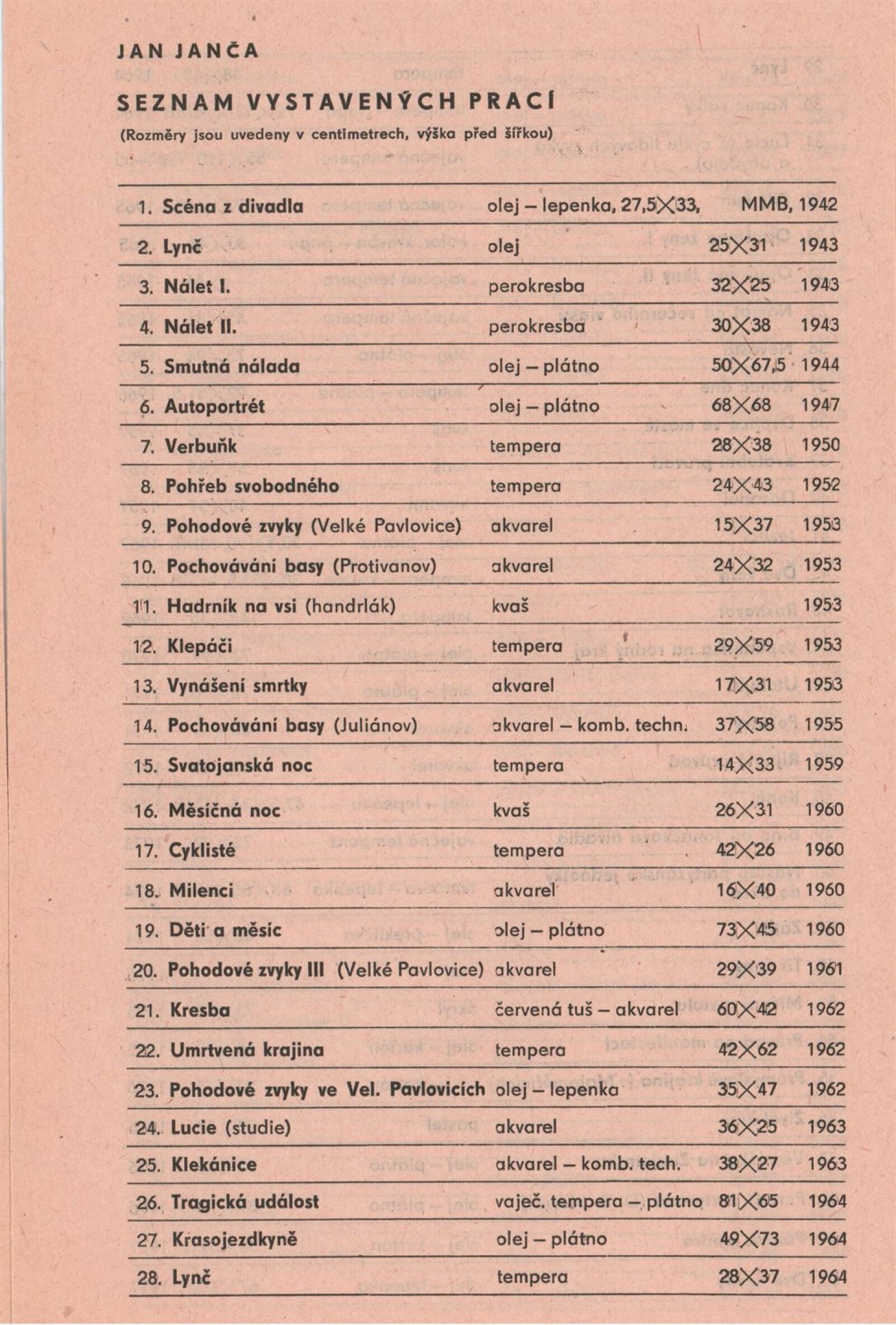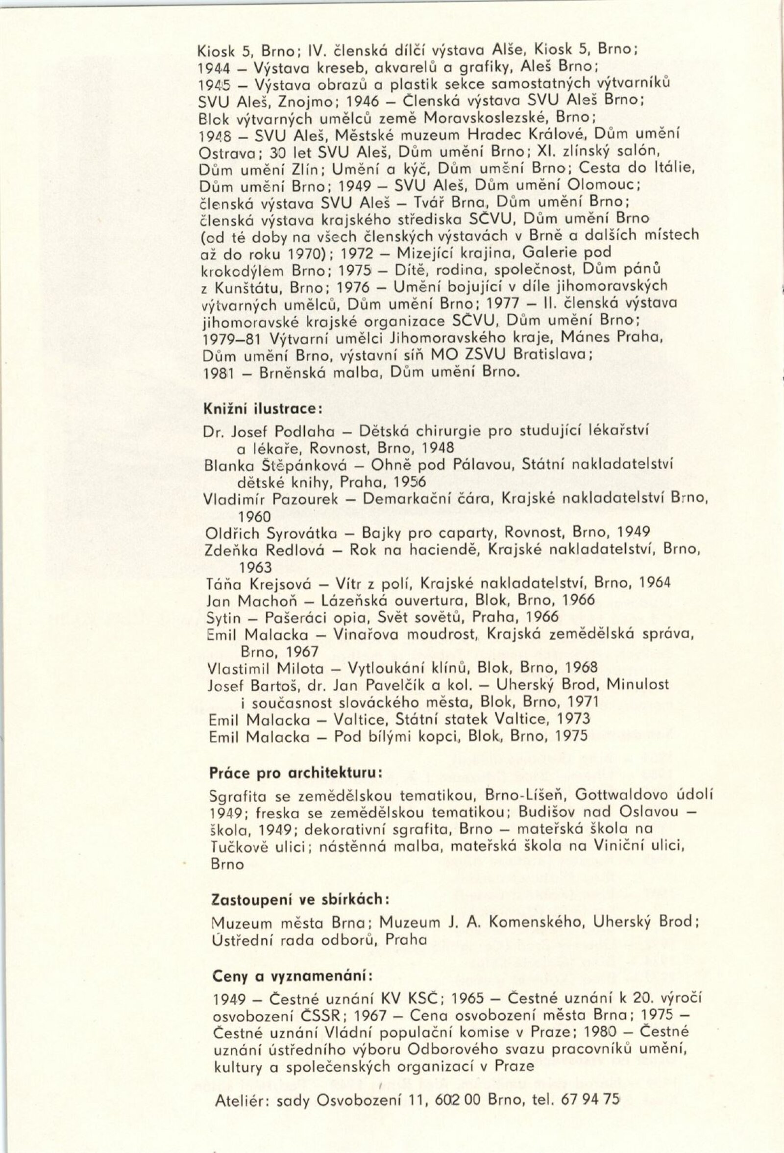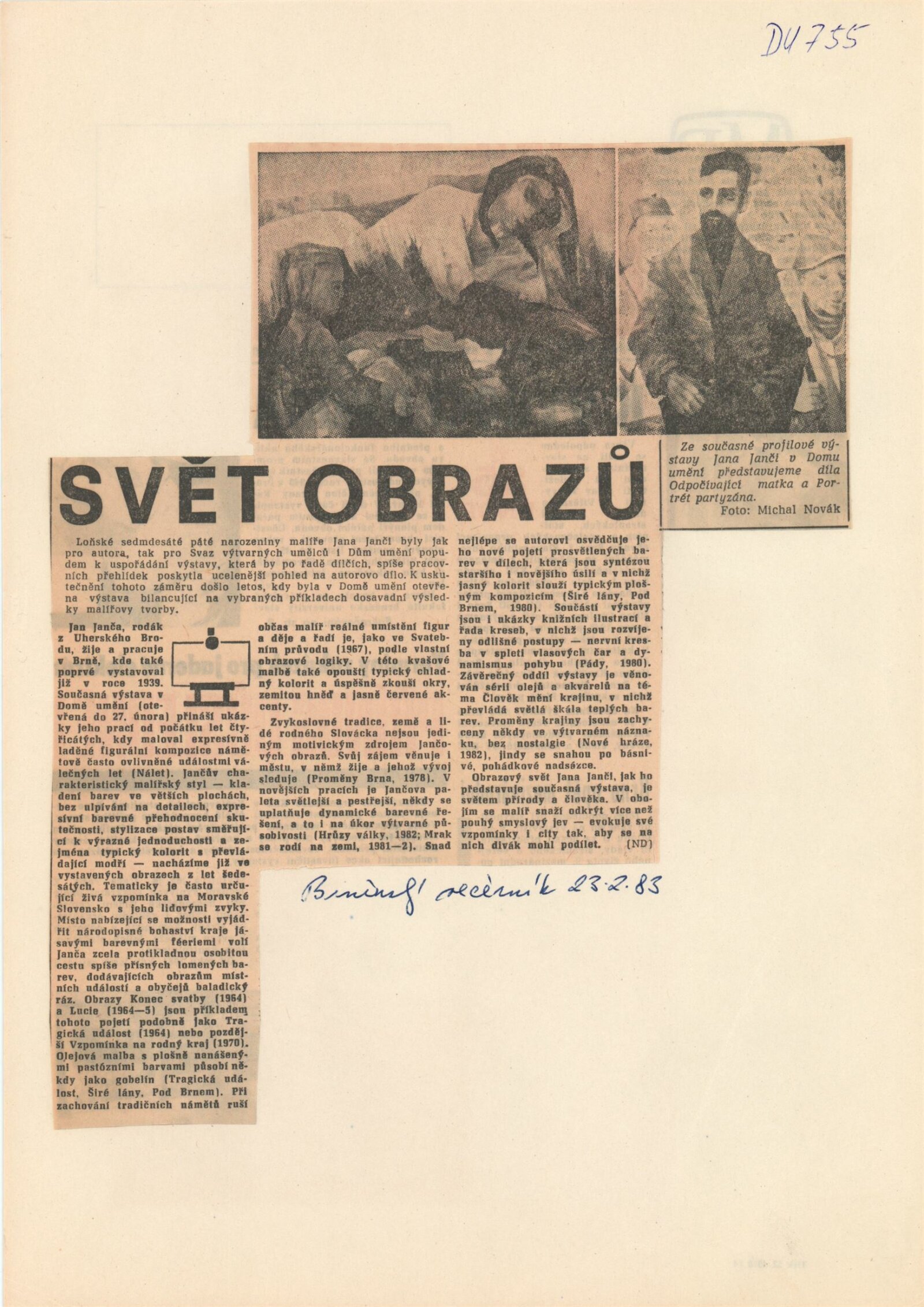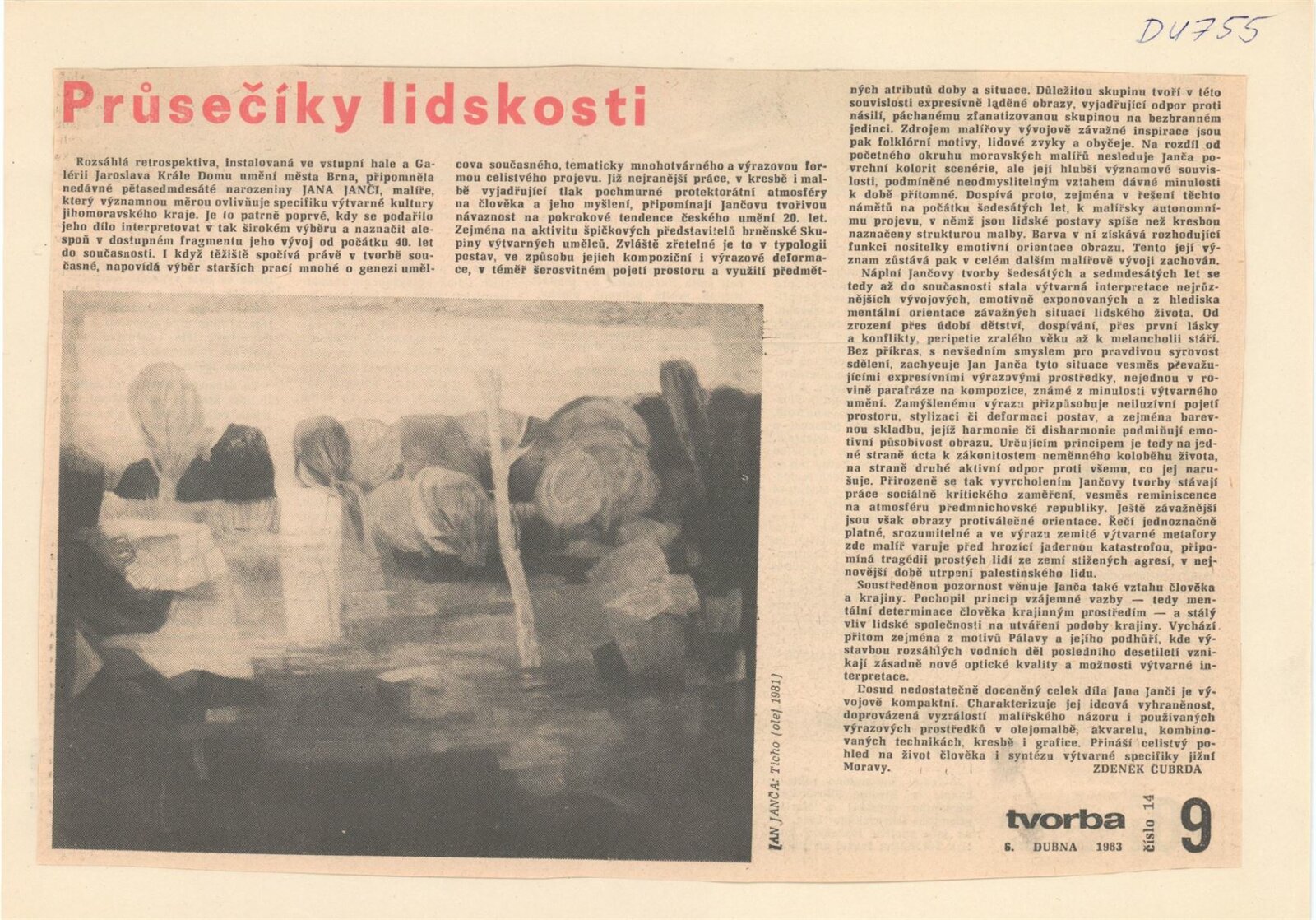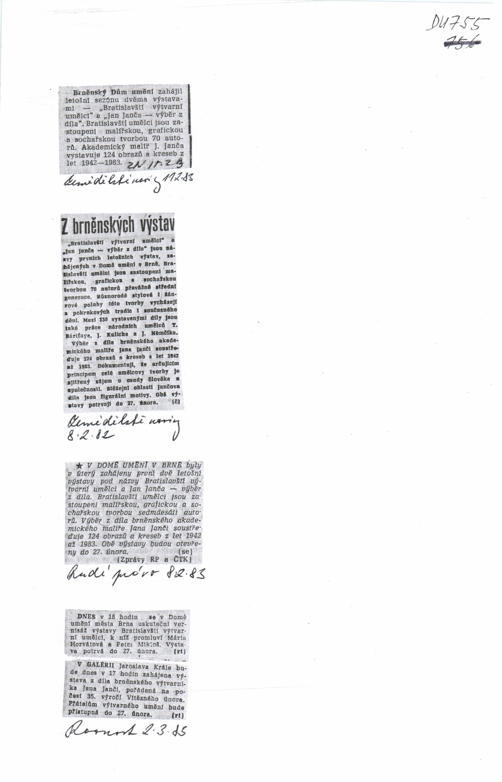 Jan Janča. Výběr z díla: Dům umění, 112. výstava v Galerii Jaroslava Krále, 1. 2. – 27. 2. 1983 / Text: Zdeněk Čubrda. – Brno: ČFVU, 1983. – 16 s., obr., seznam vystavených prací 4 s., portrét, životopis, knižní ilustrace, práce pro architekturu, ceny. – DU 755