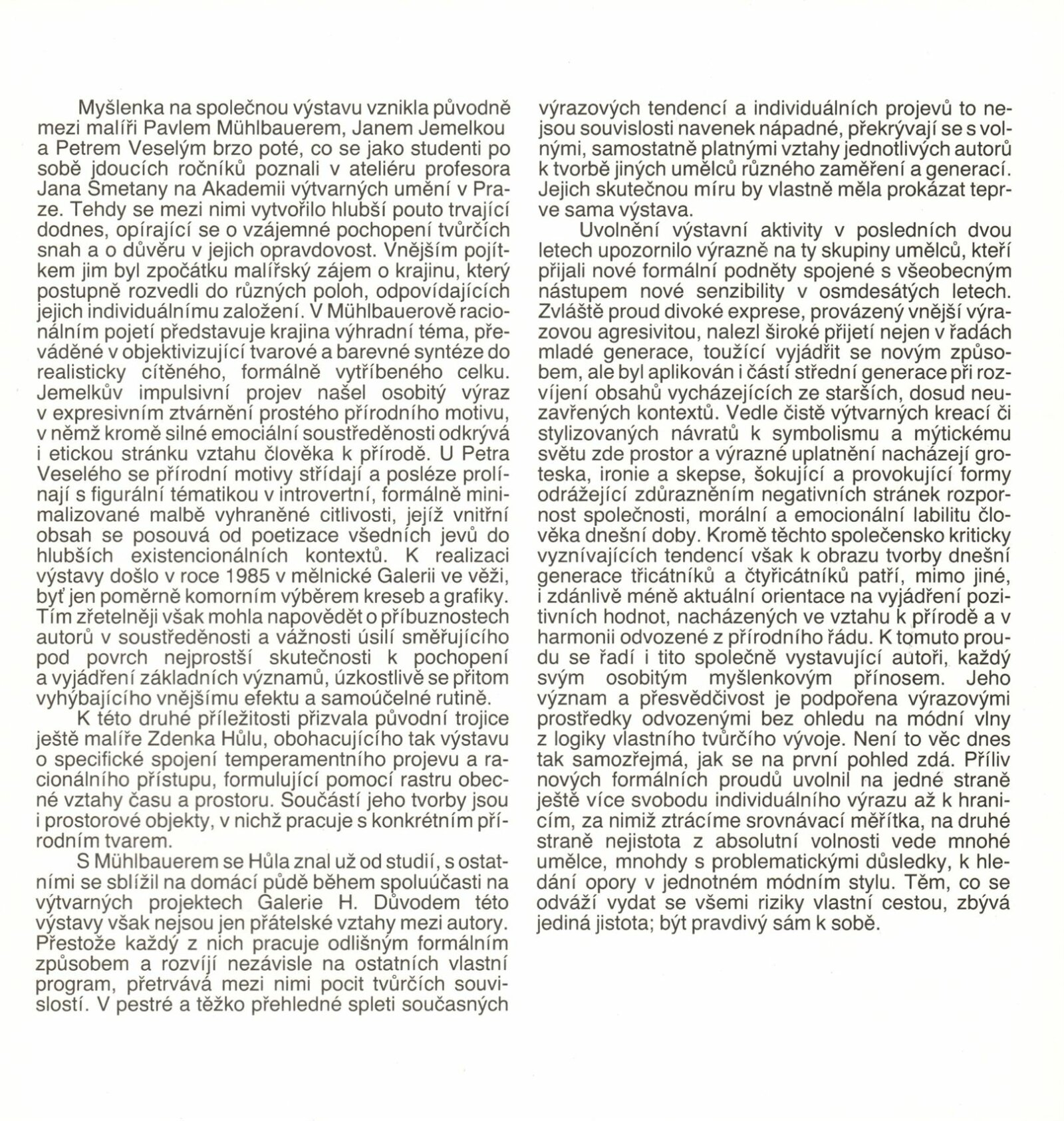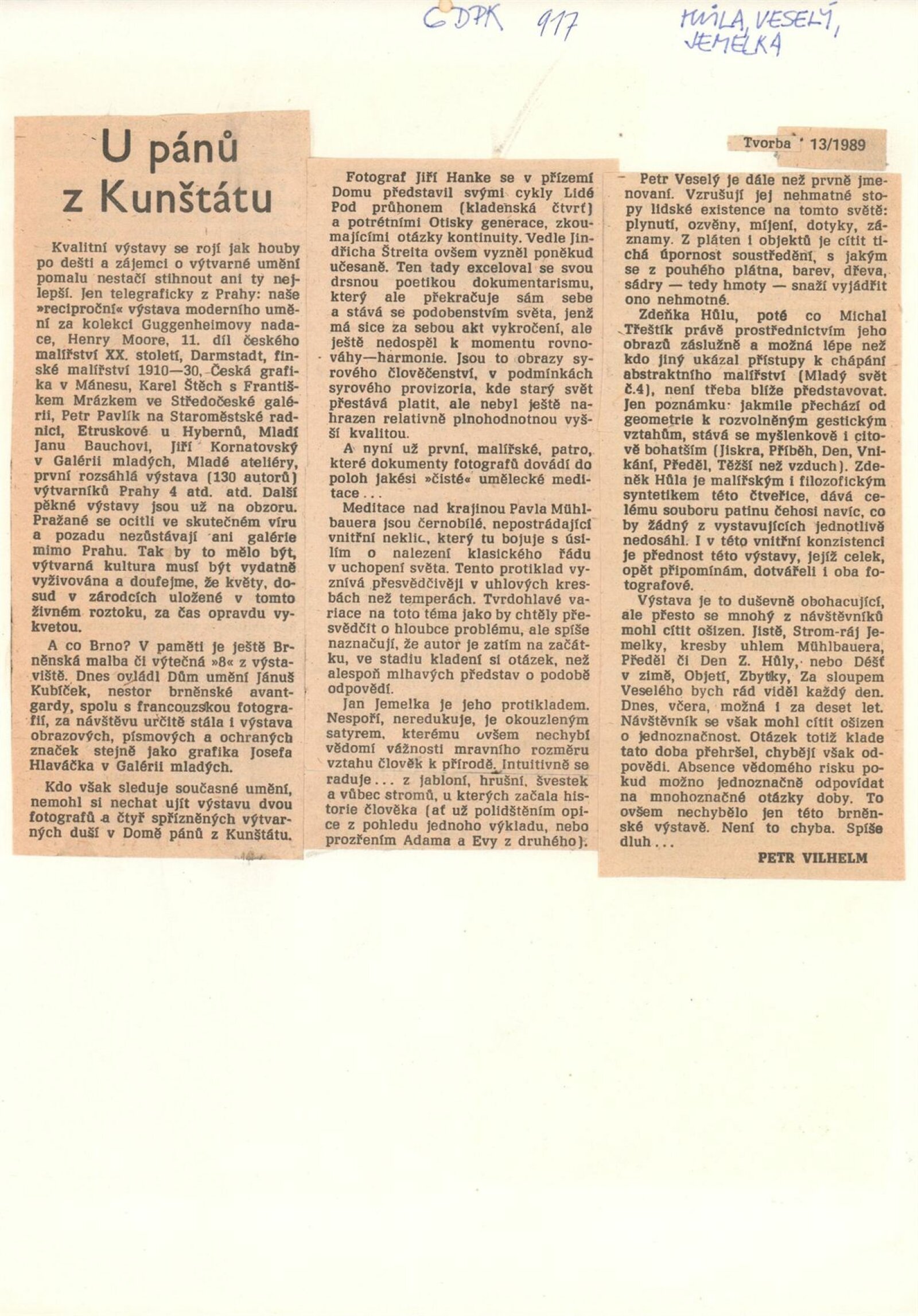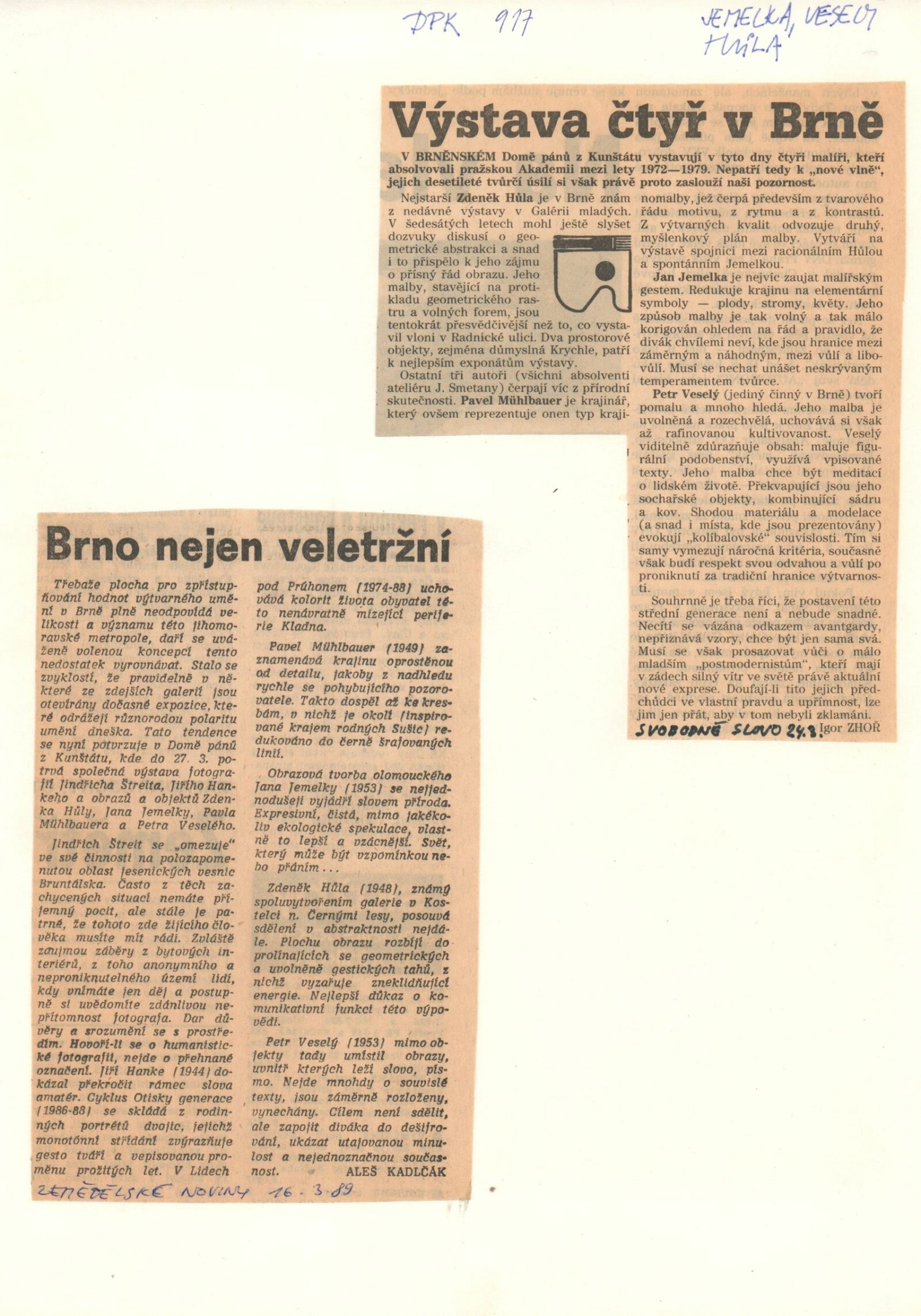 Jan Jemelka. Pavel Mühlbauer. Zdeněk Hůla. Petr Veselý. Malba, kresba, grafika, objekty : Dům umění / Dům pánů z Kunštátu, 21. 2. – 27. 3. 1989 / Texty: Michal Gregor, Jiří Hůla. – Brno: DUmB, 1989. – [42] s., obr., životní data, výstavy, zastoupení ve sbírkách, realizace, DPK 917. – MZK; MG; MMB
