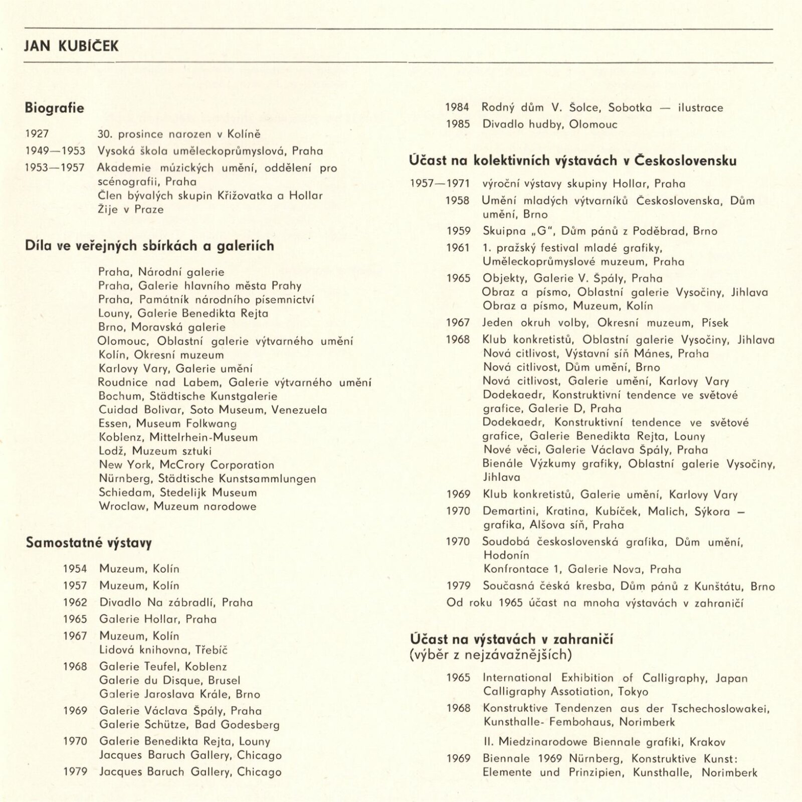 Jan Kubíček. Fotografie a fotogramy: Dům umění / Dům pánů z Kunštátu, Kabinet fotografie Jaromíra Funka, 5. 3. – 7. 4. 1985 / Brno: DUmB, 1985. – 20 s., obr., seznam prací 1 s., životní data, výstavy, zastoupení ve sbírkách, ceny, DPK 838. – MZK; MG; MMB
