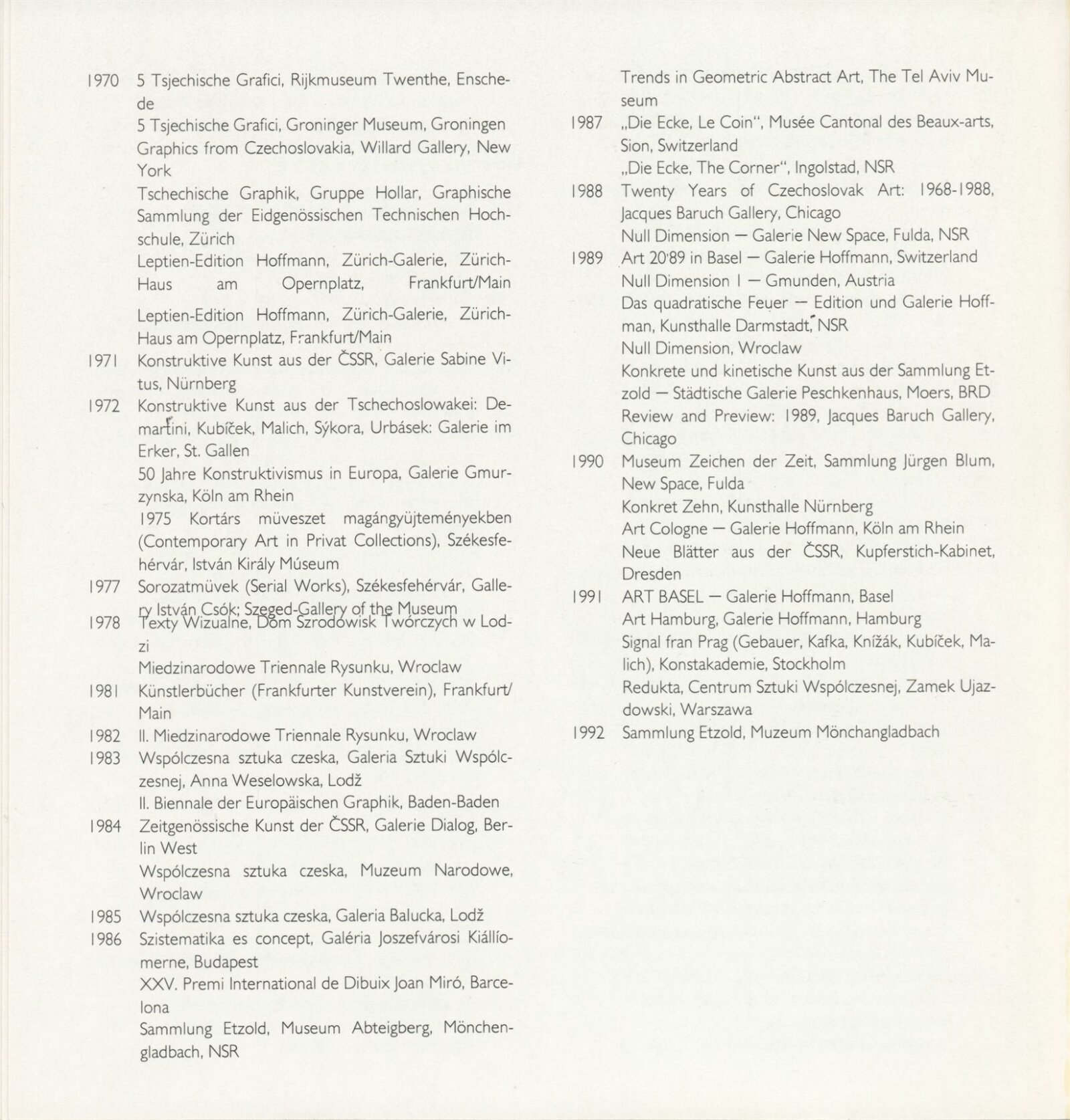 pozvánka, katalog, strojopis, časová osa s charakteristikou jednotlivých tvůrčích období od 1957 do 1989, rukopis umělce, fotografie instalace výstavy, seznam vystavených děl, pojistný seznam, žádost o zapůjčení, smlouva o zápůjčce, recenze v tisku, poznámky