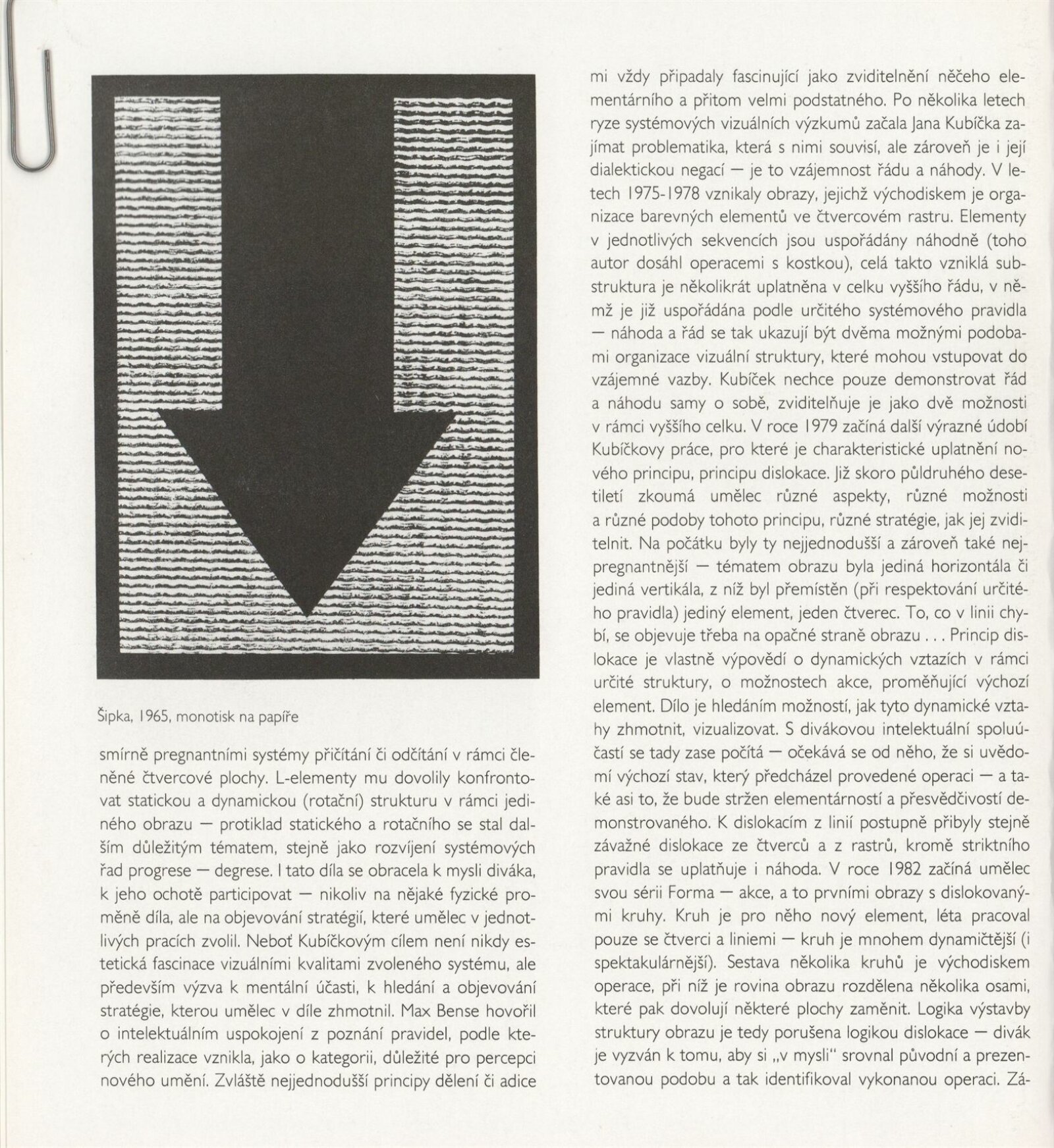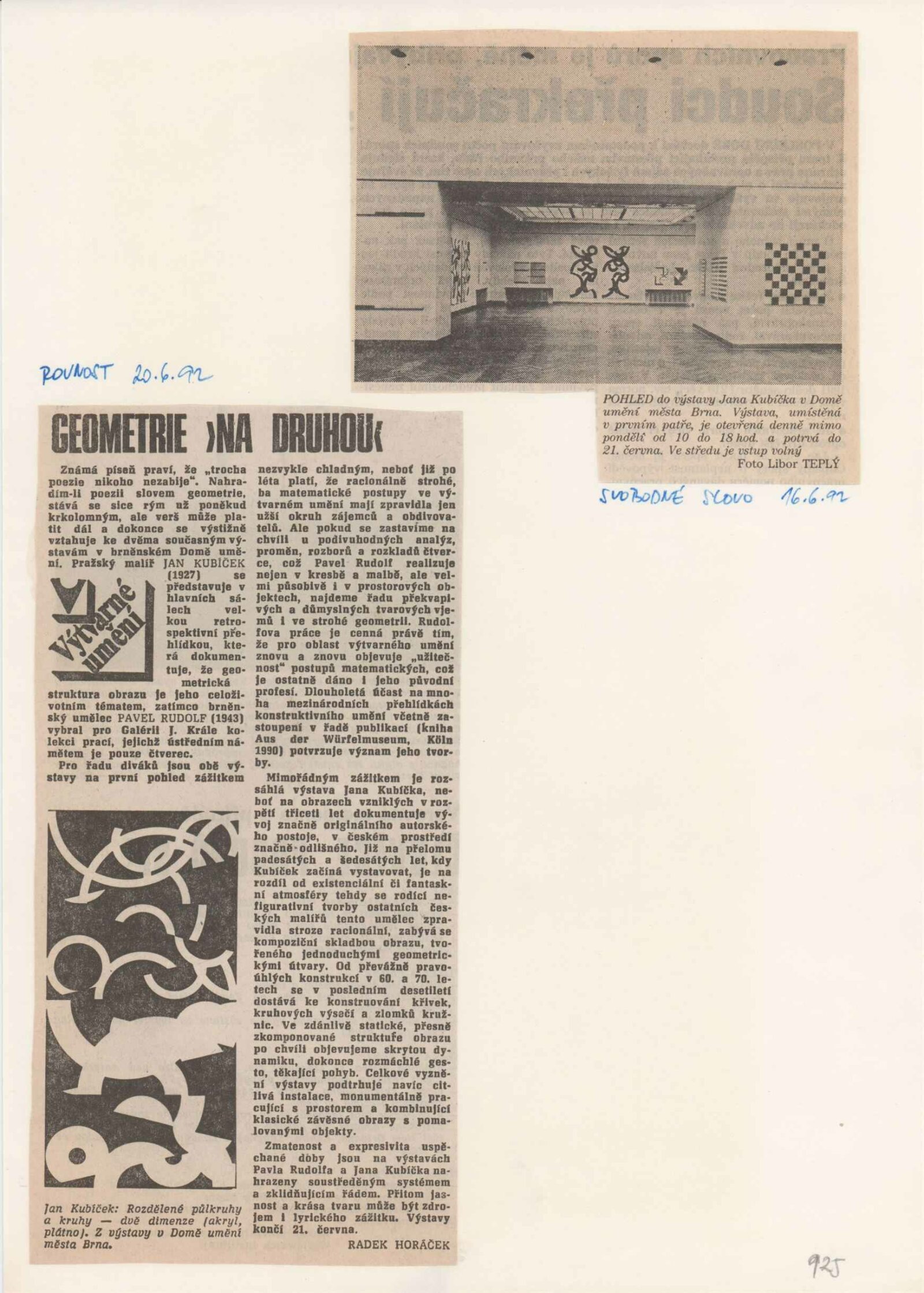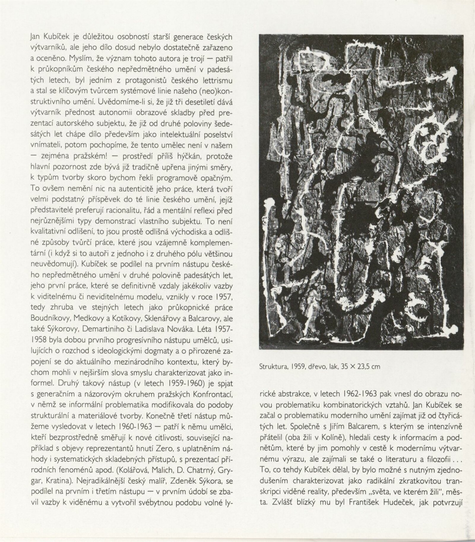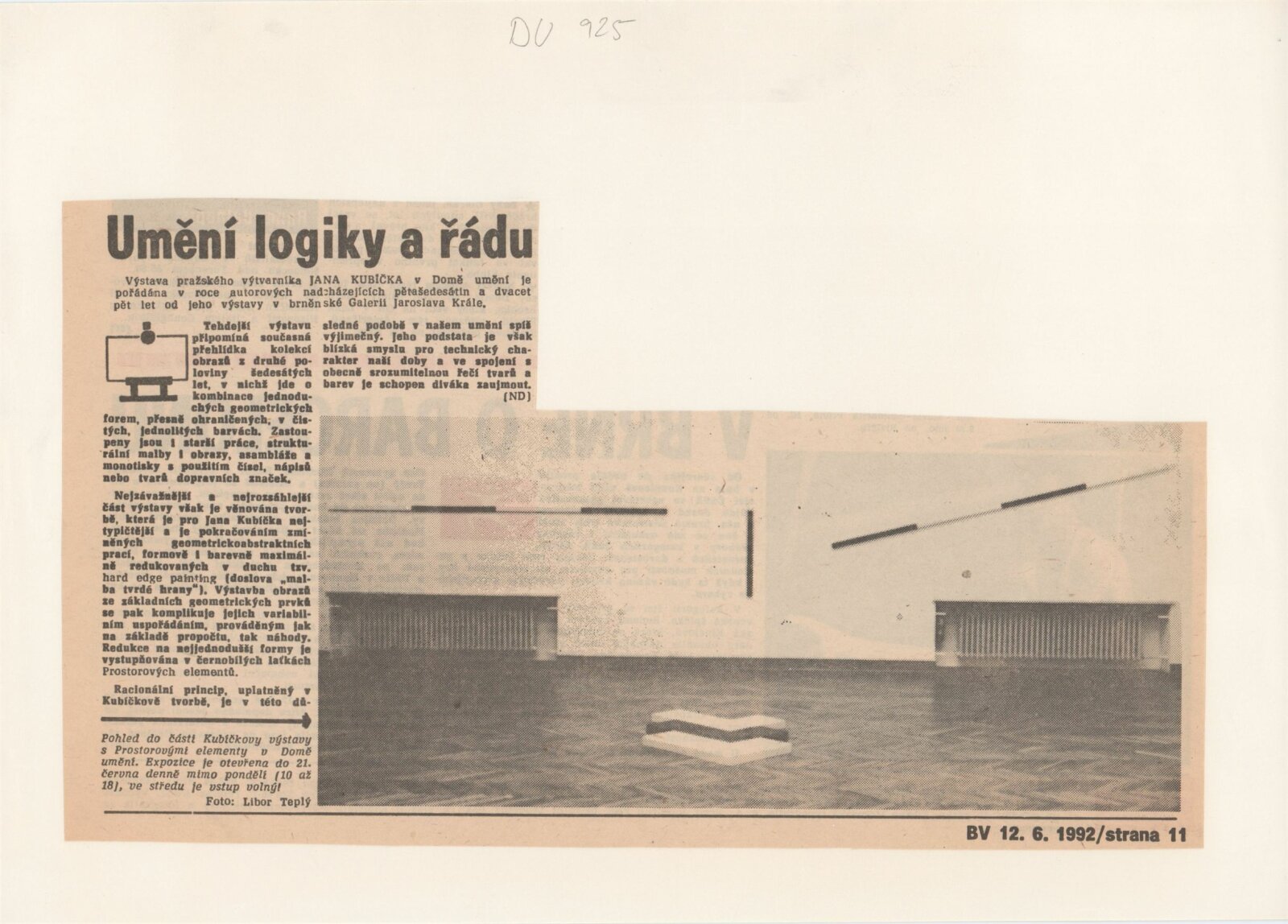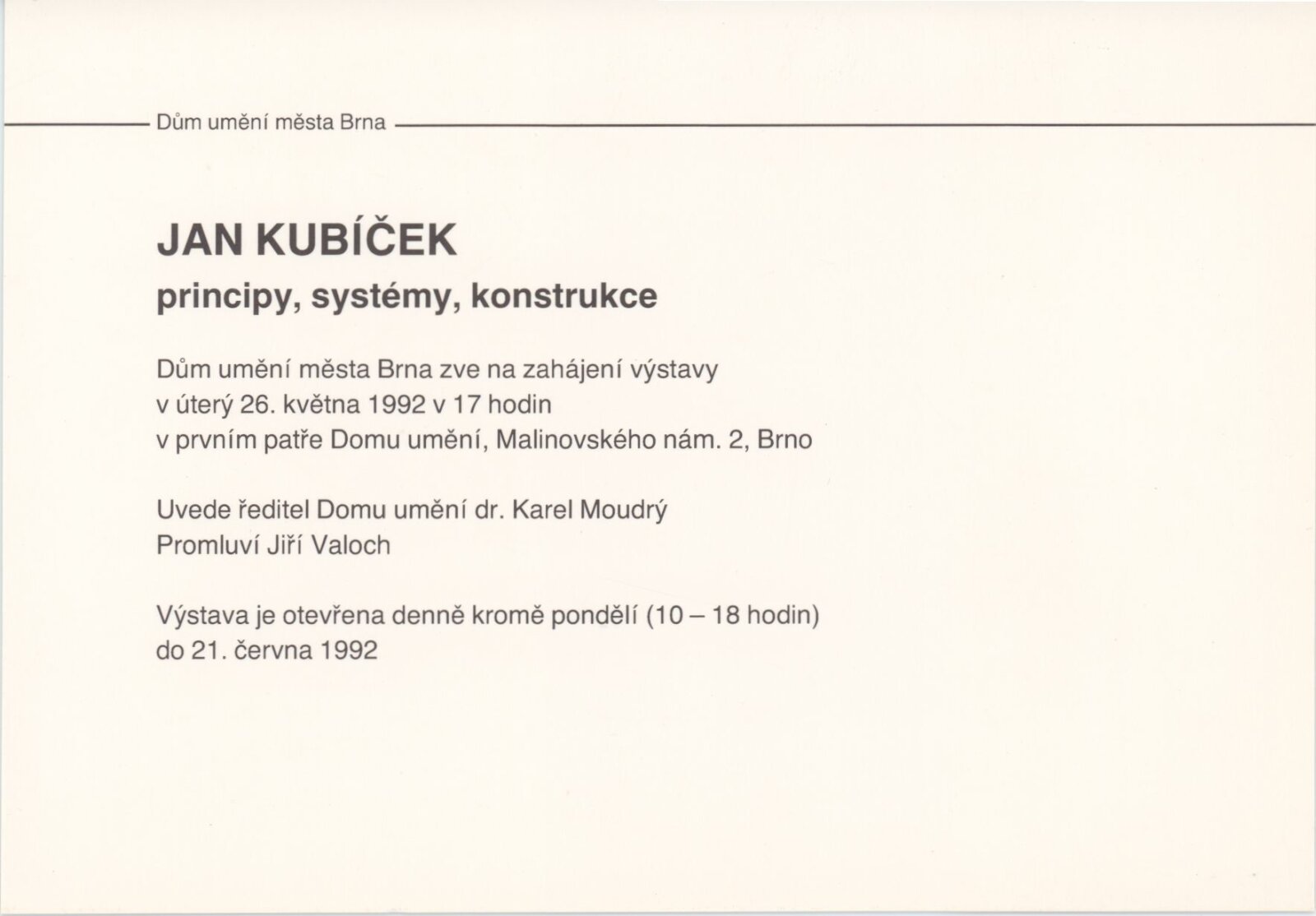 Jan Kubíček. Principy, systémy, konstrukce: Dům umění města Brna, 26. 5. – 21. 6. 1992 / Text: Jiří Valoch. – Brno: DUmB, 1992. – [30] s., obr., životní data, výstavy, díla ve sbírkách, DU 925