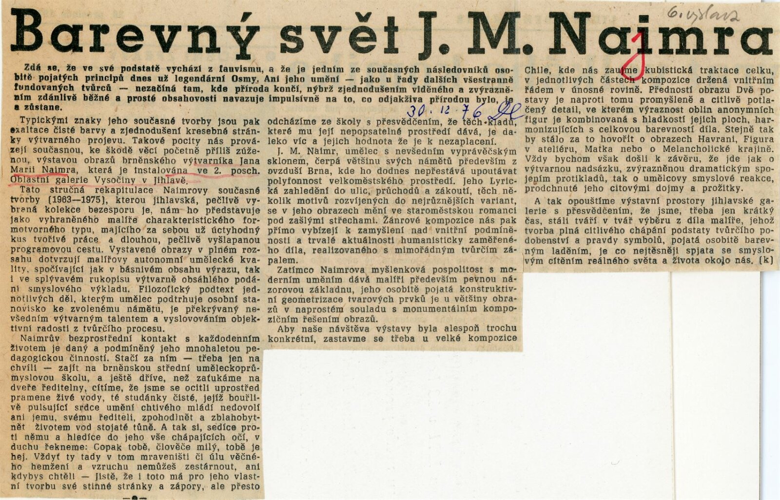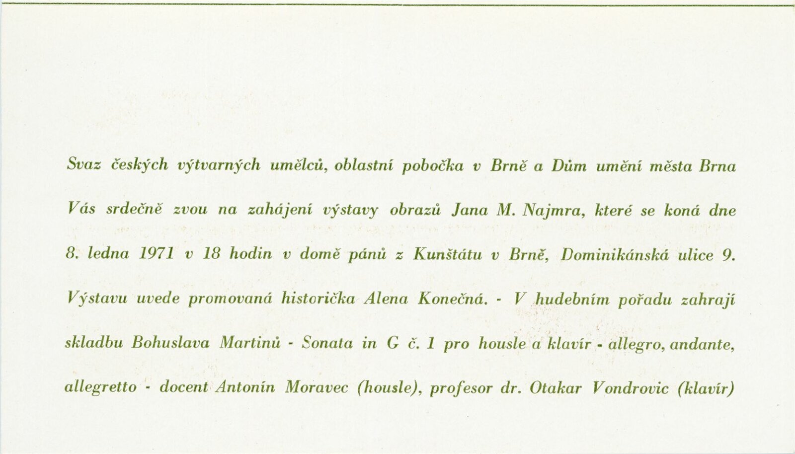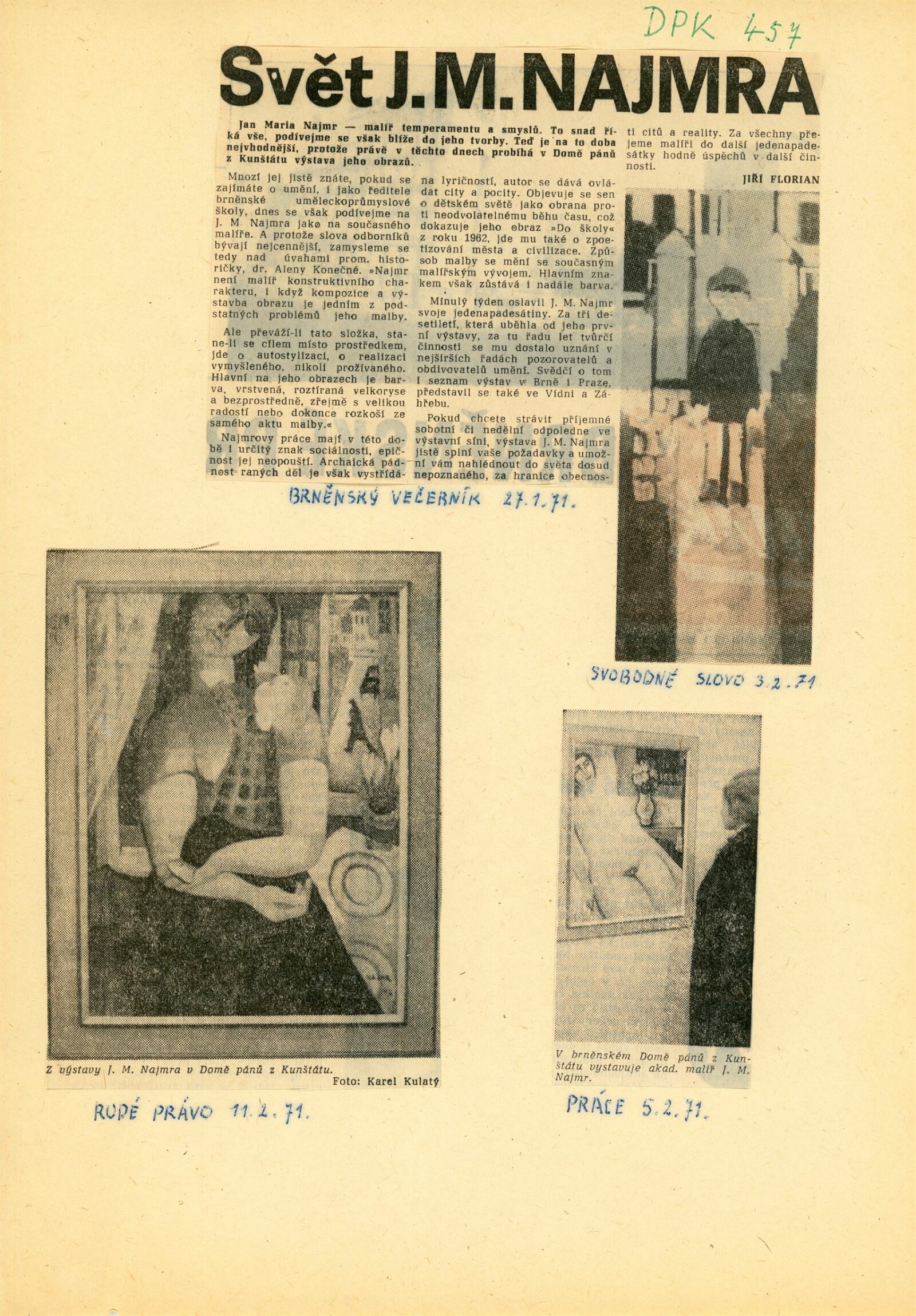 Jan Maria Najmr. Obrazy: Dům umění města Brna / Dům pánů z Kunštátu, 8. 1. – 31. 1. 1971 / Text: Alena Konečná. – Brno: DUmB, 1971. – 18 s., obr., životní data, výstavy, monumentální tvorba, DPK 457. – MZK; MG; MMB
