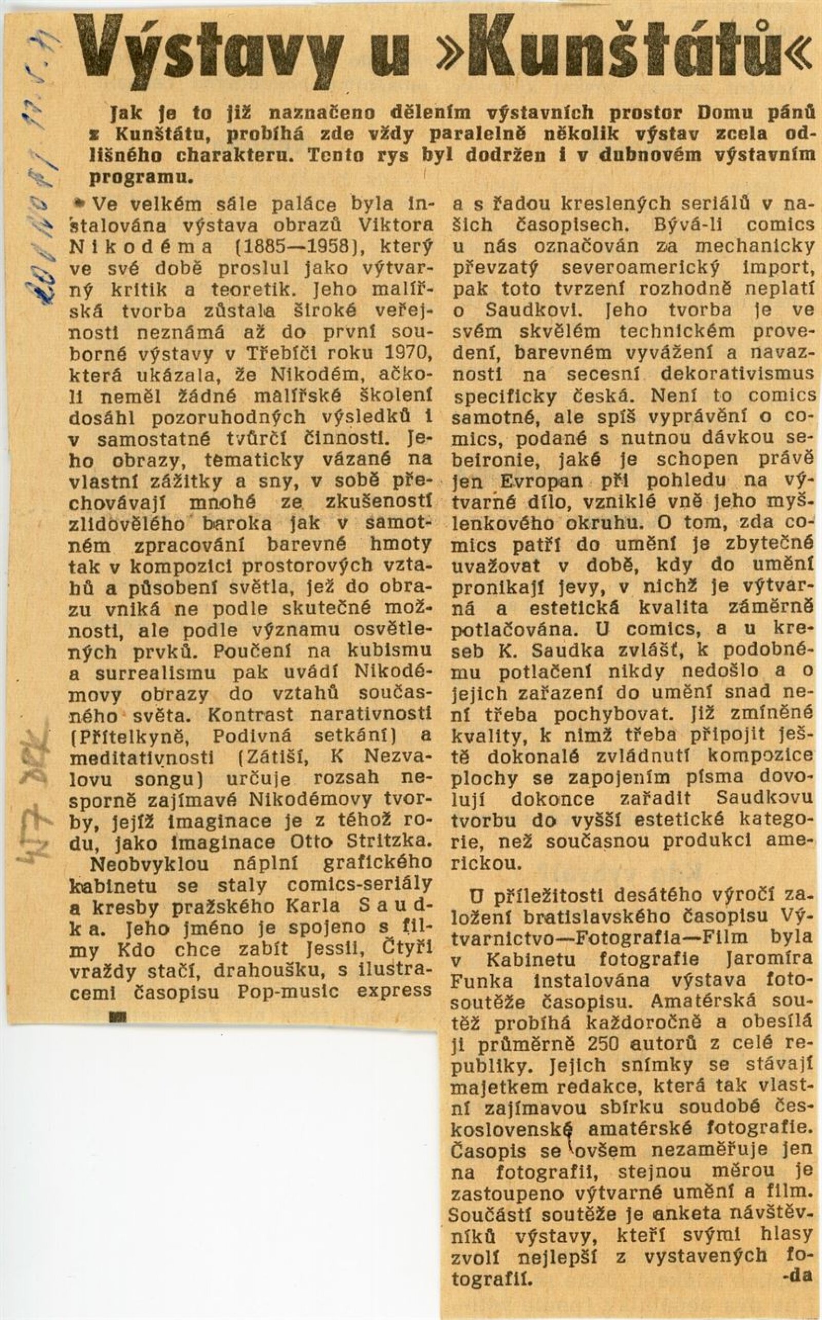 pozvánka, katalog, fotografie výstavy a z vernisáže, negativy fotografií DPK 455–457, plakát, provozní korespondence, smlouva výstavy, žádost o povolení výstavy, recenze v tisku, pozvánka (Brno MG Knihkupectví Čs. spisovatele, 1974), katalog „Umění doby“ (pozn. první samostatná výstavy umělce)