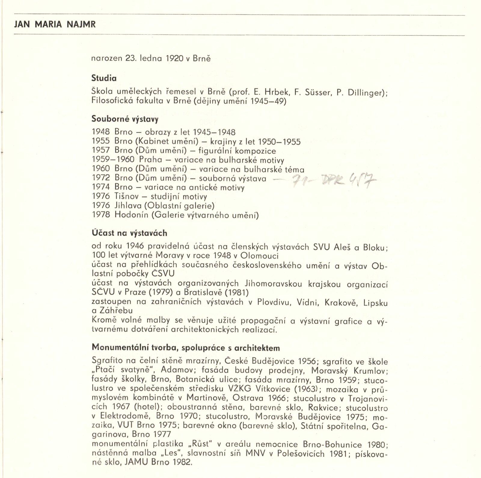 Jan Maria Najmr. Obrazy: Dům umění / Dům pánů z Kunštátu, Kabinet grafiky, 24. 5. – 26. 6. 1983 / Text: Alena Konečná. – Brno: DUmB, 1983. – 16 s., obr., životní data, výstavy, monumentální tvorba, DPK 799. – MZK; MG; MMB