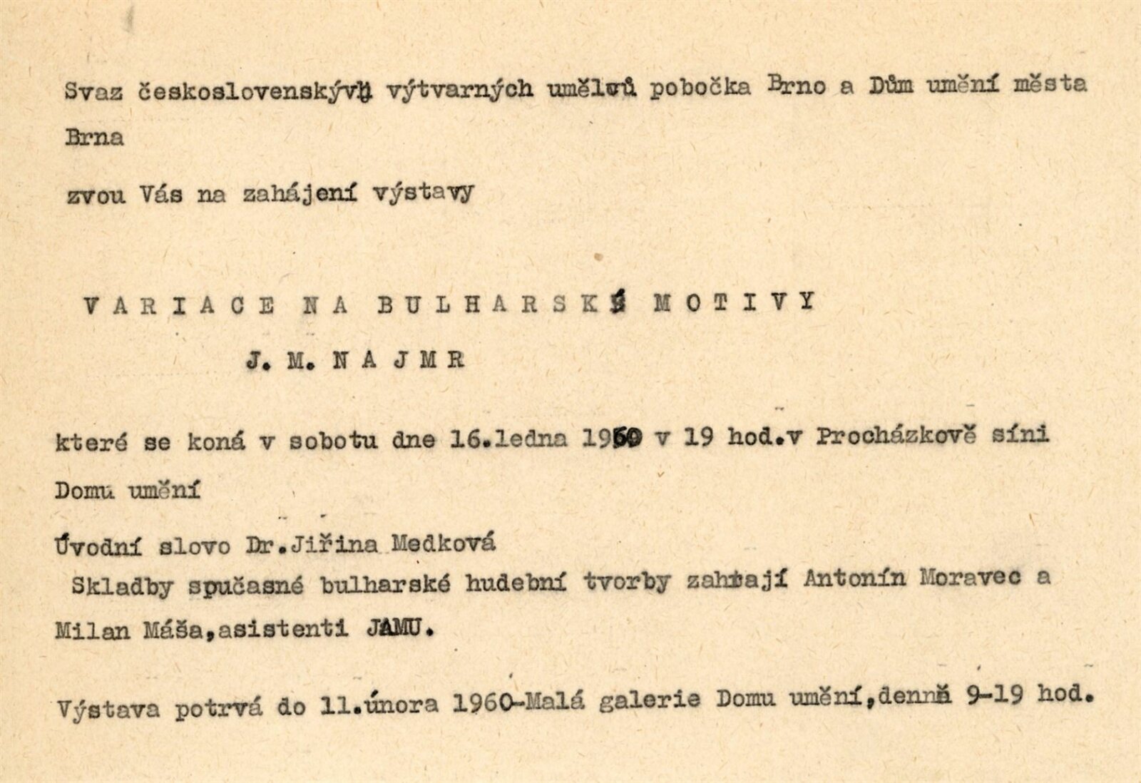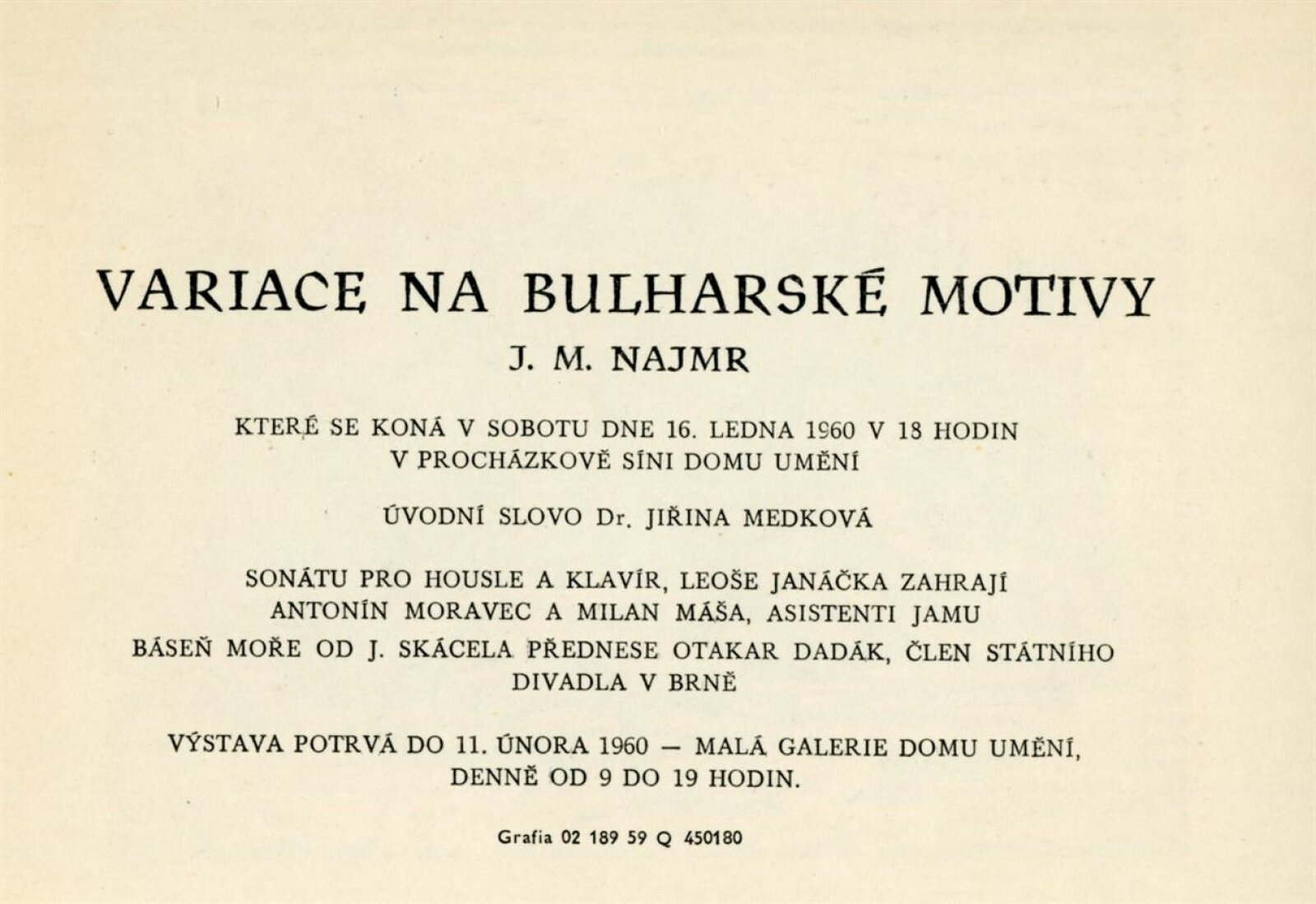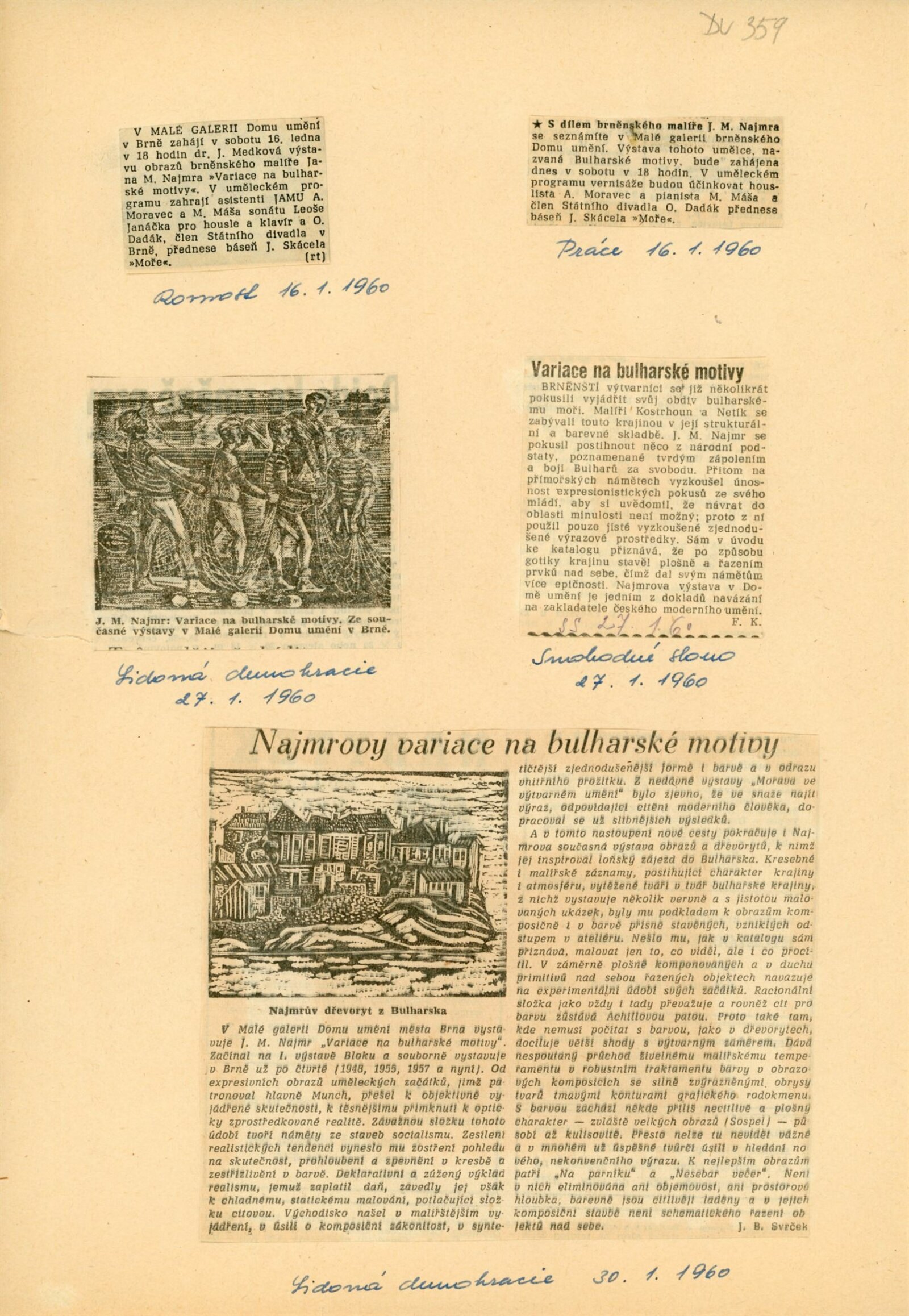 Jan M. Najmr. Variace na bulharské motivy: Dům umění města Brna, Malá galerie, 16. 1. – 11. 2. 1960 / Text: Jiřina Medková-Losmanová. – Brno: DUmB, 1960. – skládačka, 6 s., obr., DU 359. – MG; MMB