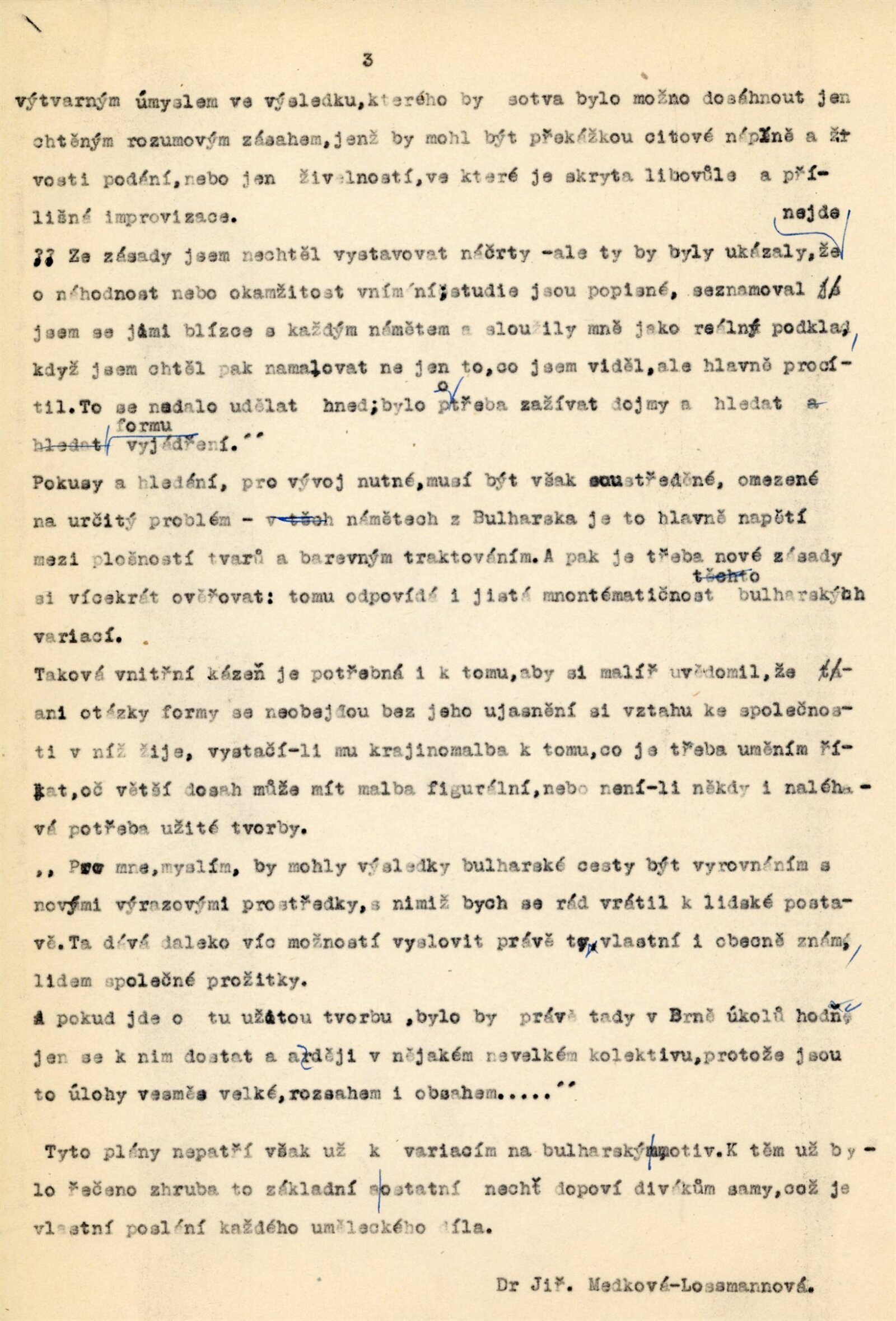 pozvánka, katalog, text (Jiřina Medková-Lossmannová), žádost o výstavní termín v MG, seznam prací, provozní korespondence, recenze v tisku