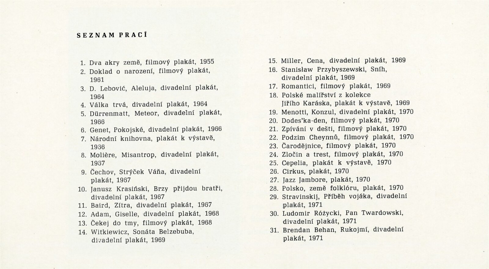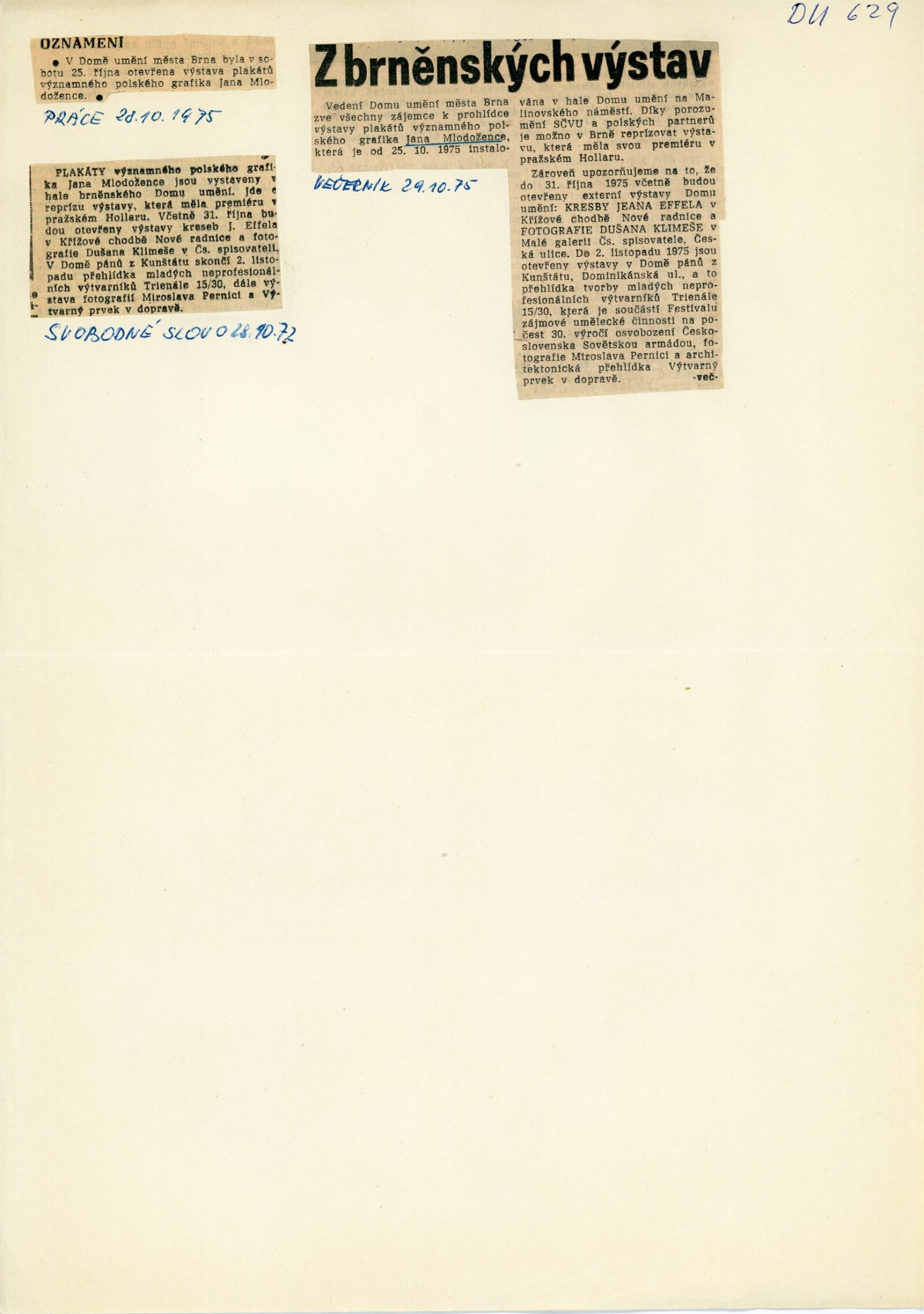 Jan Mlodoženiec. Plakáty: Dům umění města Brna, hala, 24. 10. – 16. 11. 1975 / Převzatý katalog. Jan Mlodoženiec. Plakáty: Výstavní síň Hollar, Praha, září–říjen 1975. – Praha: SČVU, 1975. – 10 s., obr., životní data, výstavy, ceny, DU 629. – MG