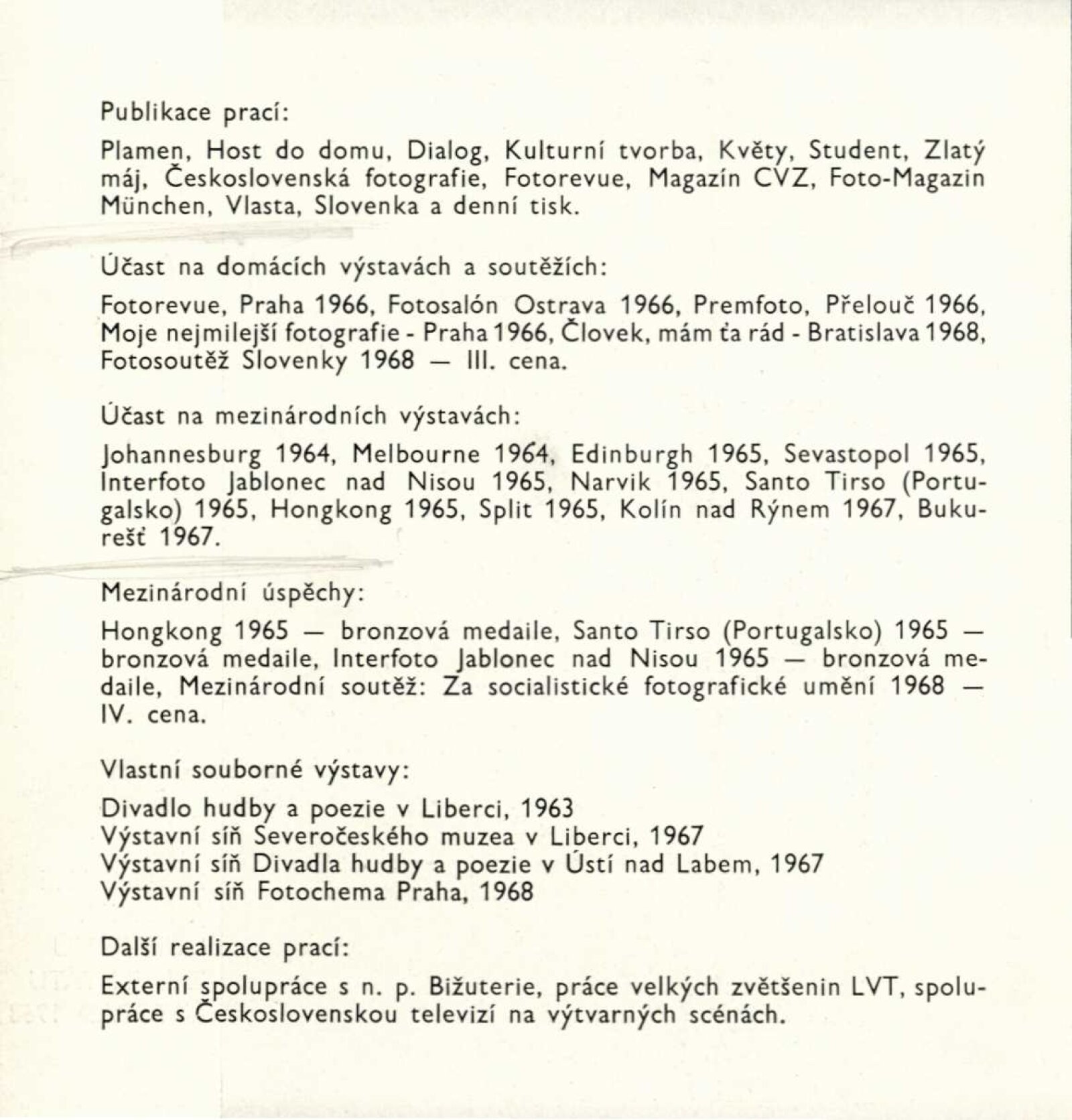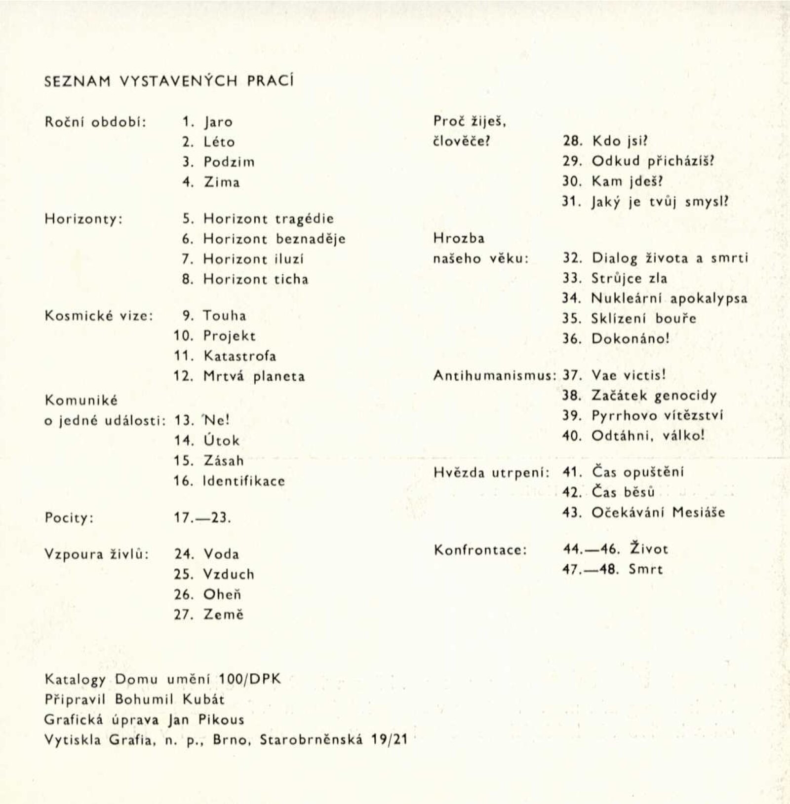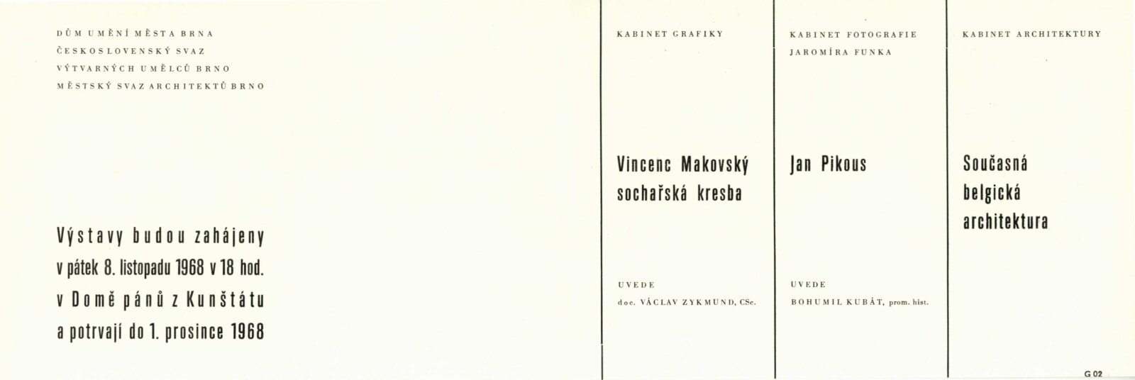 Jan Pikous: Dům umění města Brna / Dům pánů z Kunštátu, 95. výstava Kabinetu fotografie Jaromíra Funka, 8. 11. – 1. 12. 1968 / Text: Bohumil Kubát. – Brno: DUmB, 1968. – 6 s., obr., DPK 394. – MZK; MG