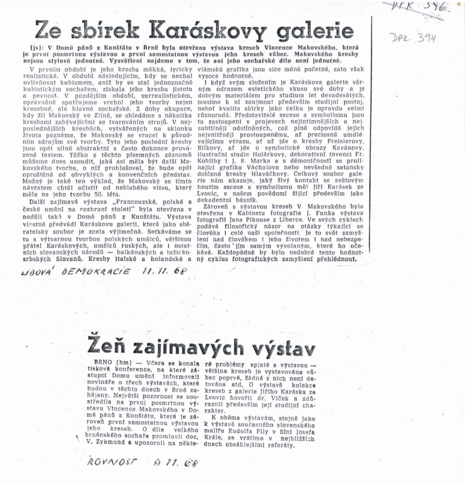 společná pozvánka DPK 393–395, katalog, strojopis katalogu, fotografie Jana Pikouse pro katalog, korespondence (příprava výstavy, katalog, instalace), smlouva o výstavě, recenze v tisku, katalog Jan Pikous (Liberec)