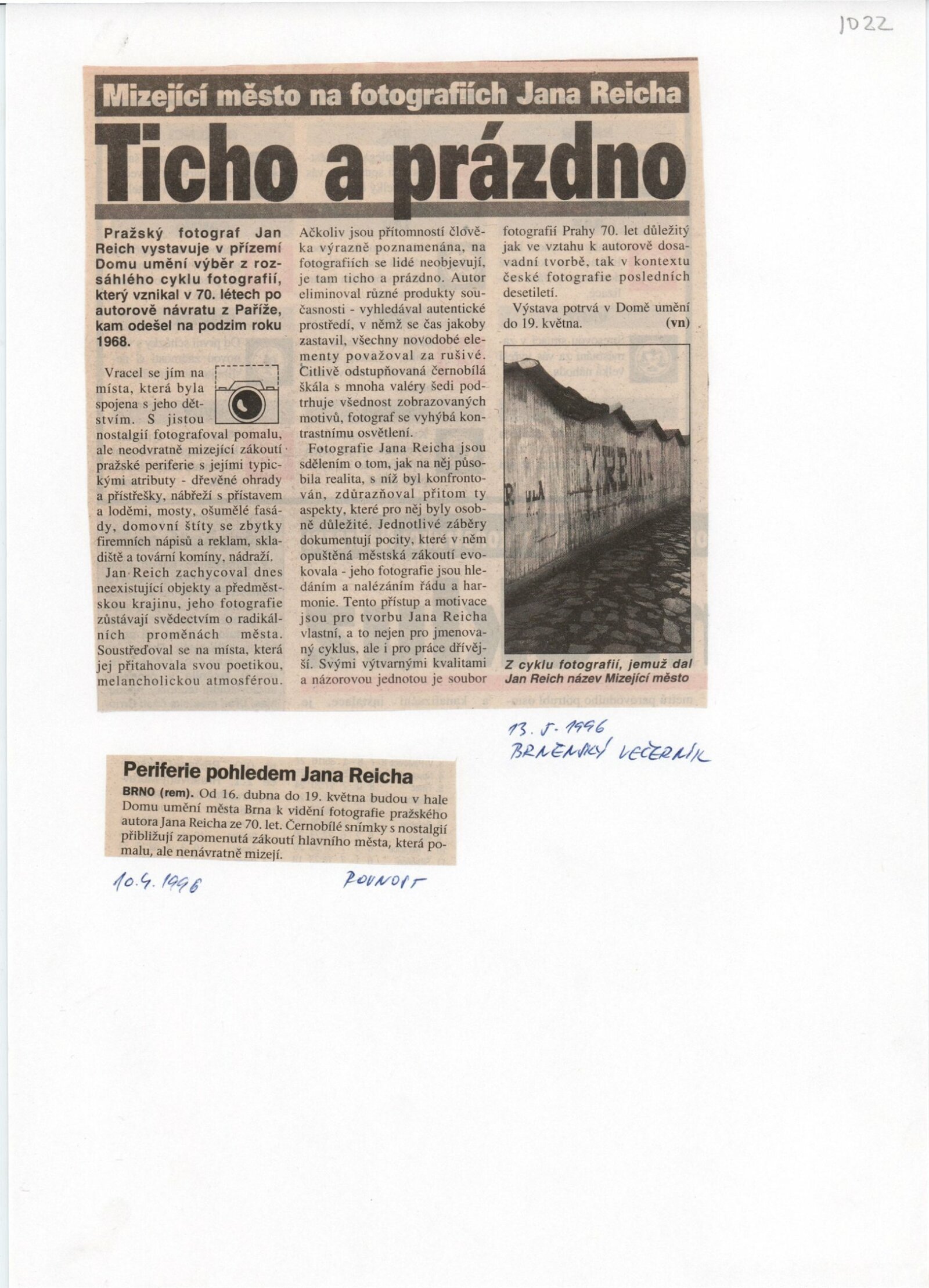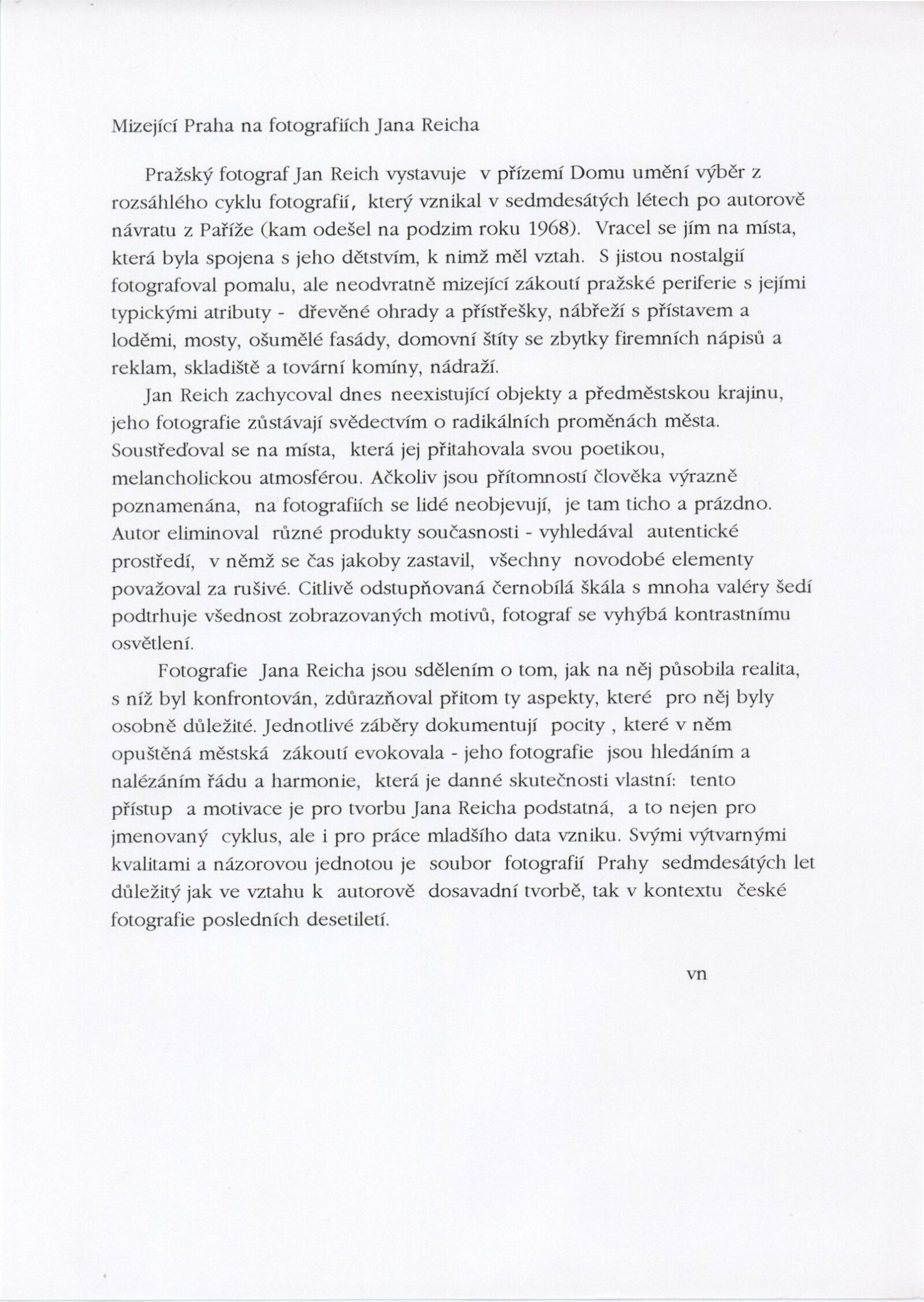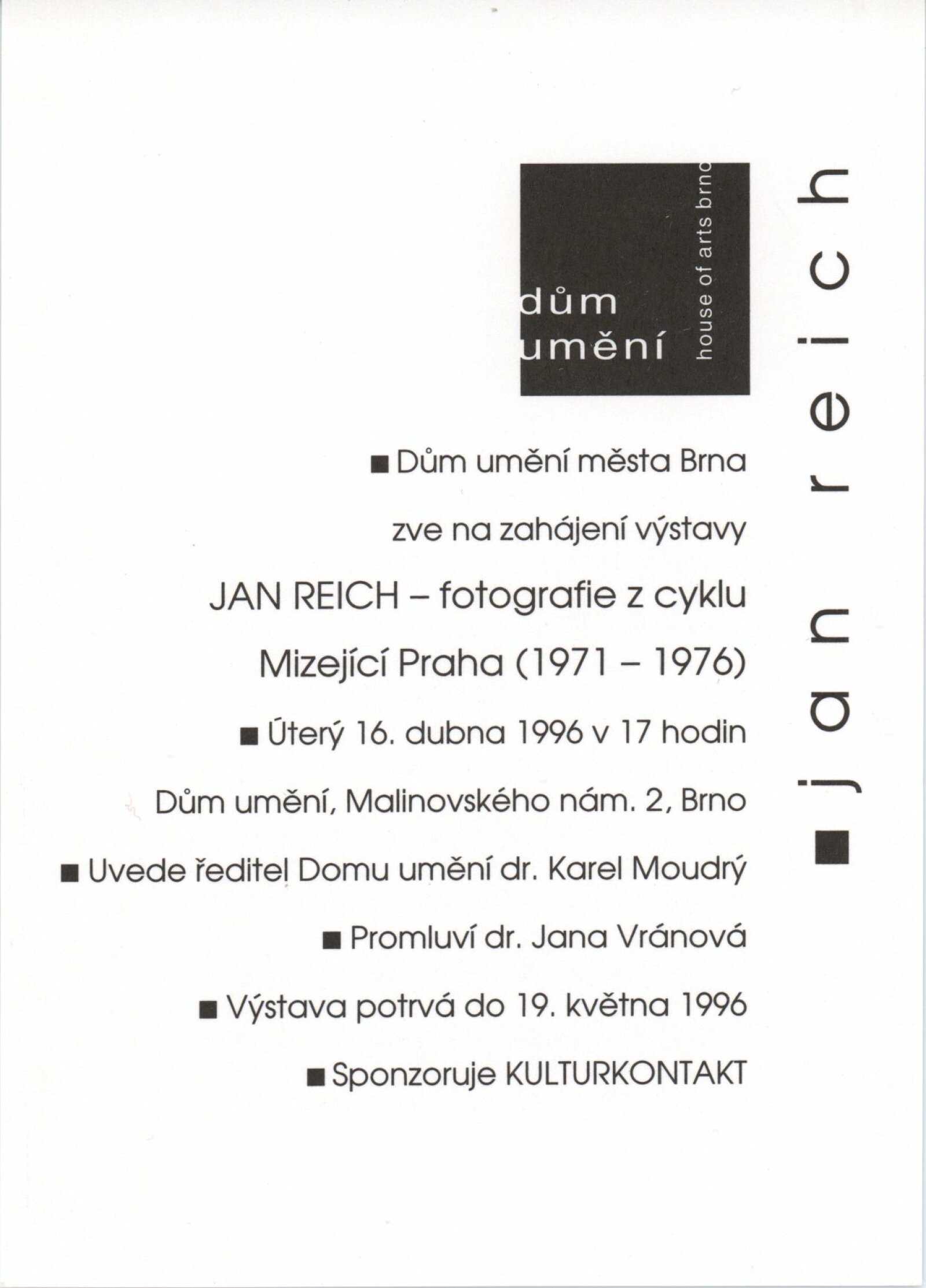 Jan Reich. Fotografie z cyklu Mizející Praha (1971–1976): Dům umění města Brna, hala, 16. 4. – 19. 5. 1996 / Text Jana Reichová. - Brno: DUmB, - 1 skládačka (6 s., obr.) Životní data, výstavy, zastoupení ve sbírkách, publikace DU 1022; MG
