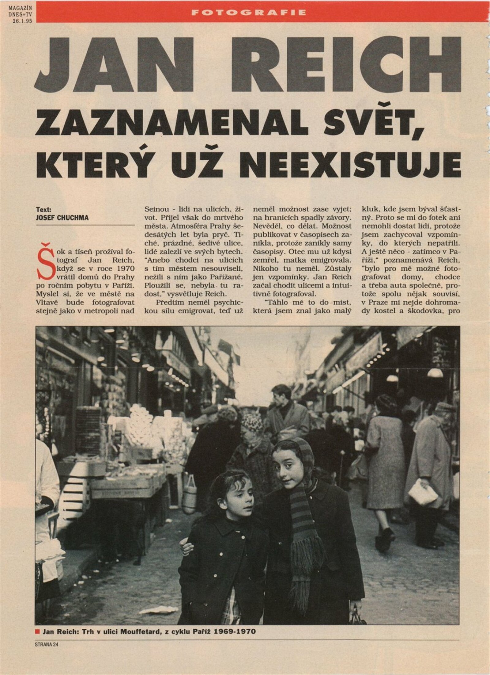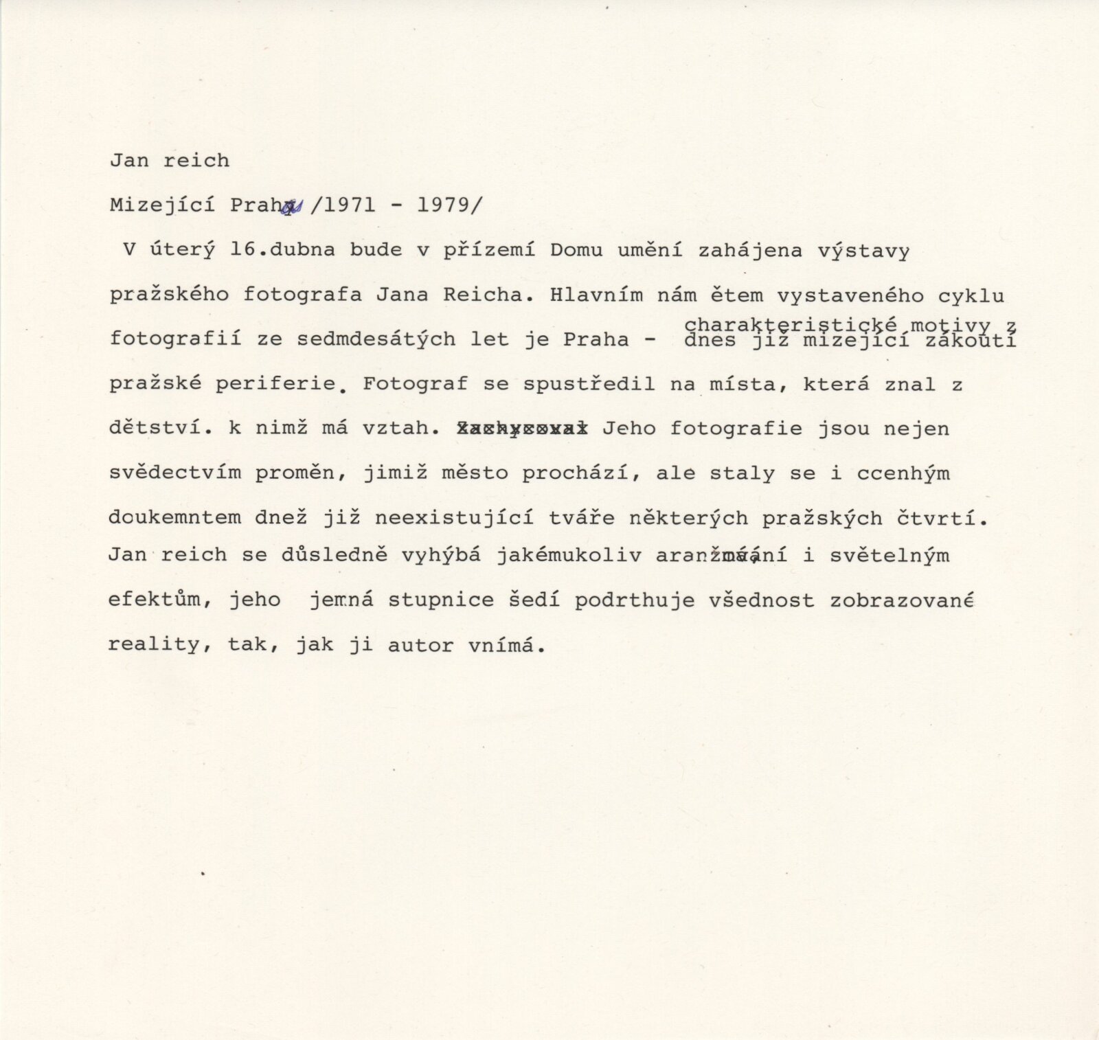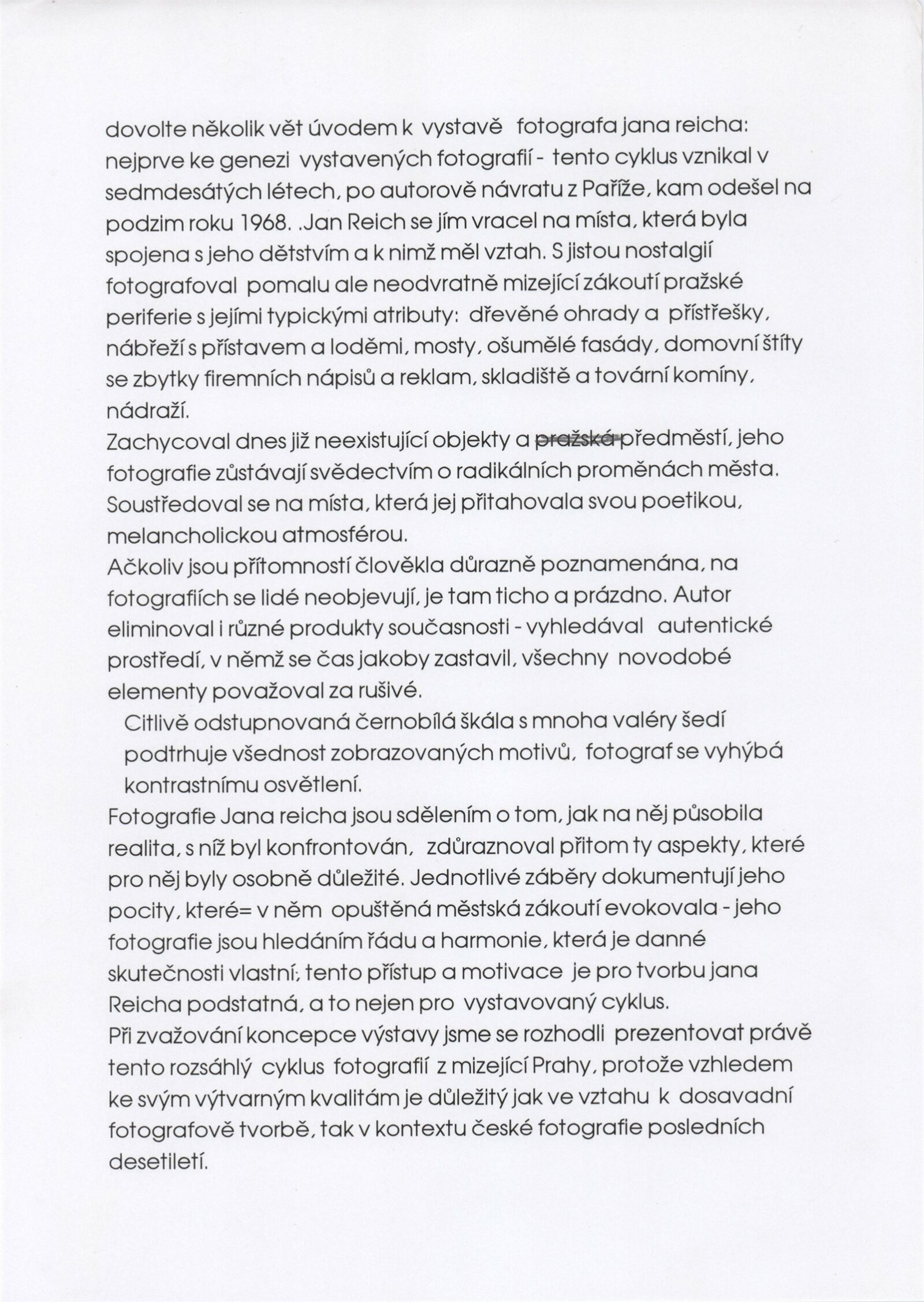 Jan Reich. Fotografie z cyklu Mizející Praha (1971–1976): Dům umění města Brna, hala, 16. 4. – 19. 5. 1996 / Text Jana Reichová. - Brno: DUmB, - 1 skládačka (6 s., obr.) Životní data, výstavy, zastoupení ve sbírkách, publikace DU 1022; MG