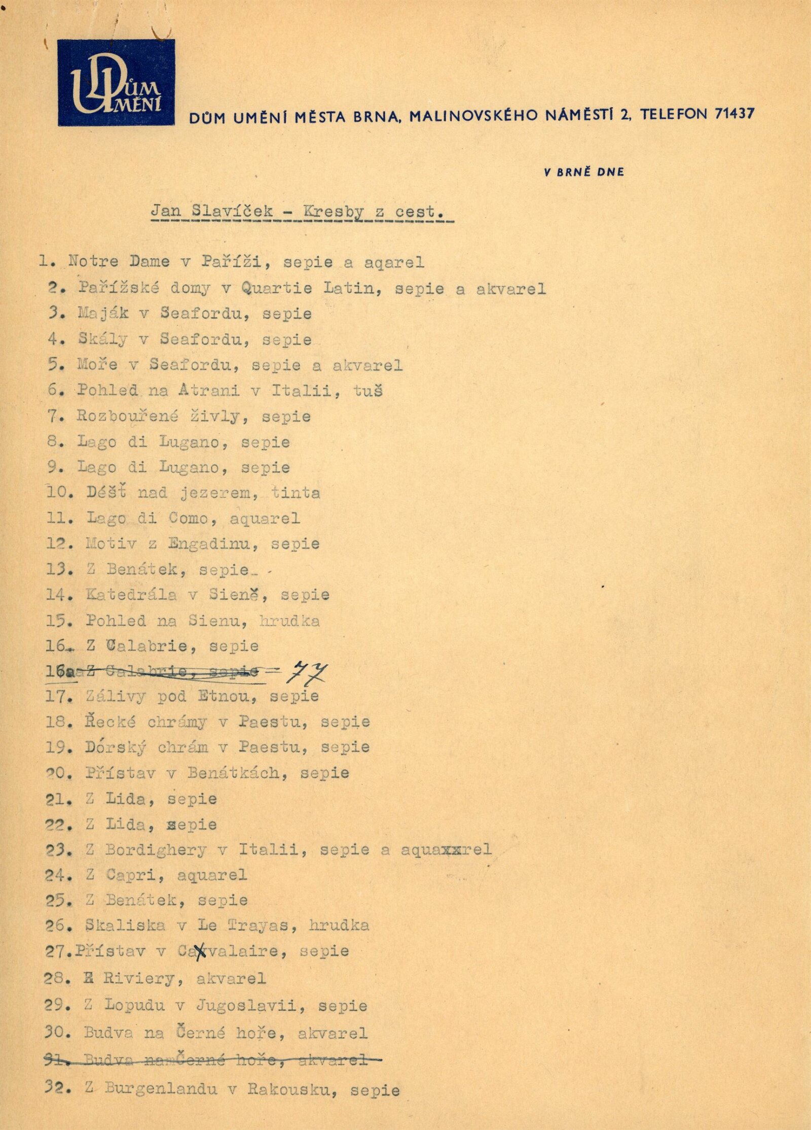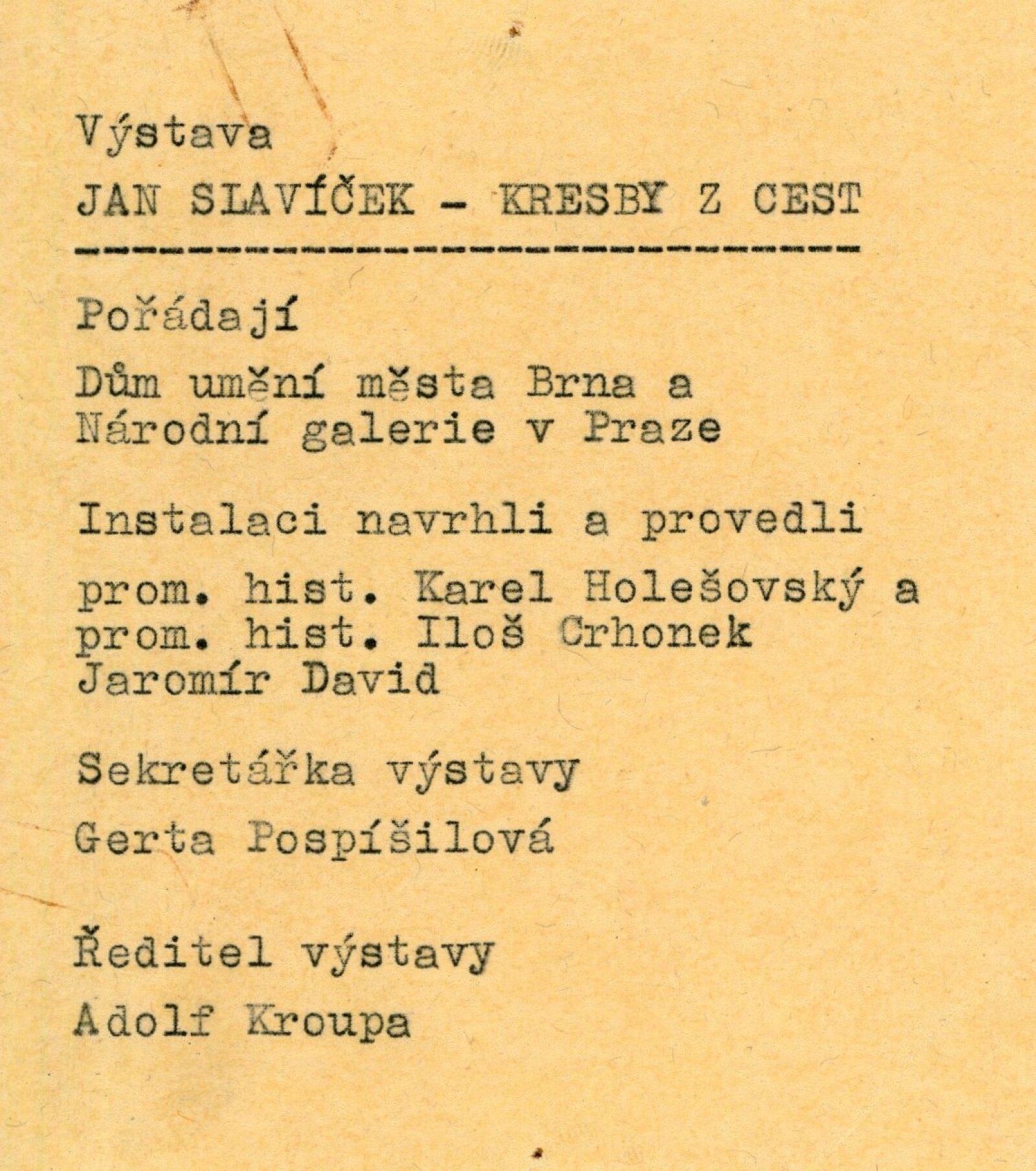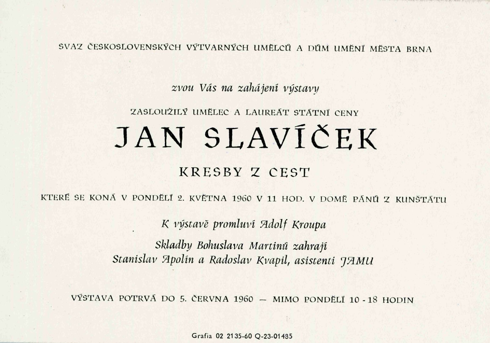 Zasloužilý umělec a laureát státní ceny Jan Slavíček. Kresby z cest: Dům umění města Brna / Dům pánů z Kunštátu, 2. 5. – 5. 6. 1960 / Převzatý katalog. Jan Slavíček. Kresby z cest: Národní galerie v Praze, leden–únor 1960 / Text: Rudolf Rouček. – Praha: Národní galerie, 1960. – skládačka, 6 s., DPK 66. – MG