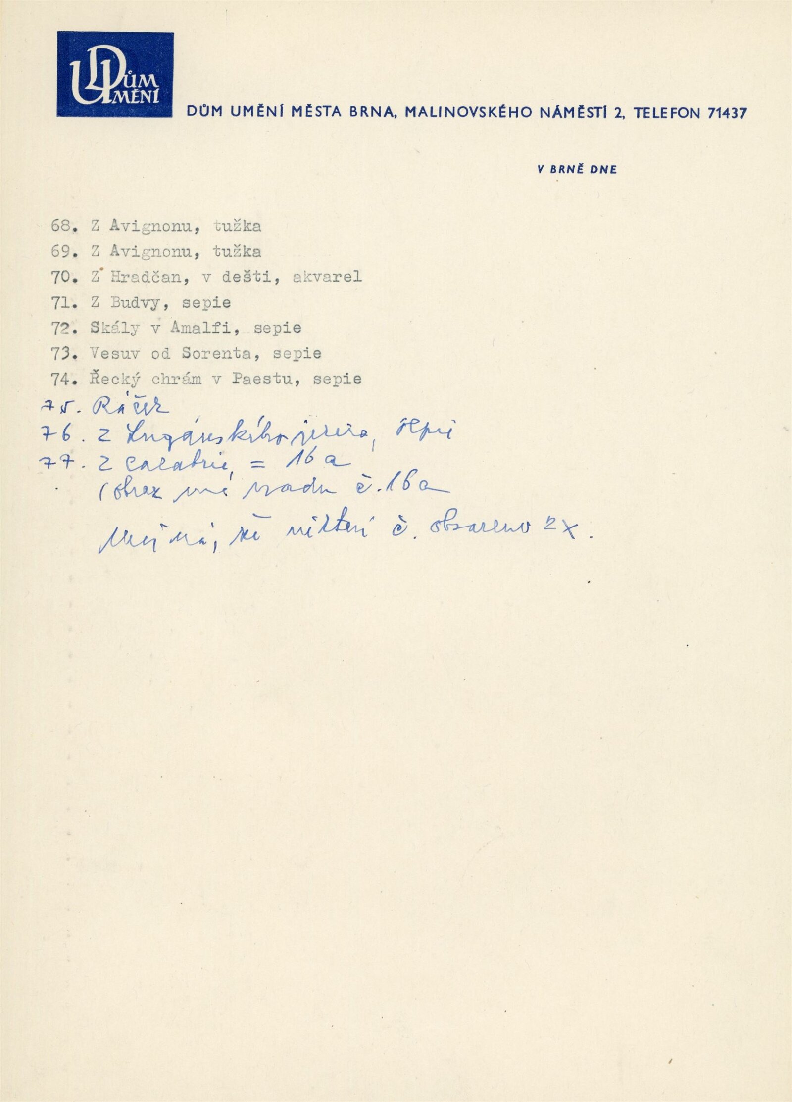 pozvánka, seznam vystavených prací, korespondence (o výstavě – Jan Slavíček a Adolf Kroupa), reverz, recenze v tisku