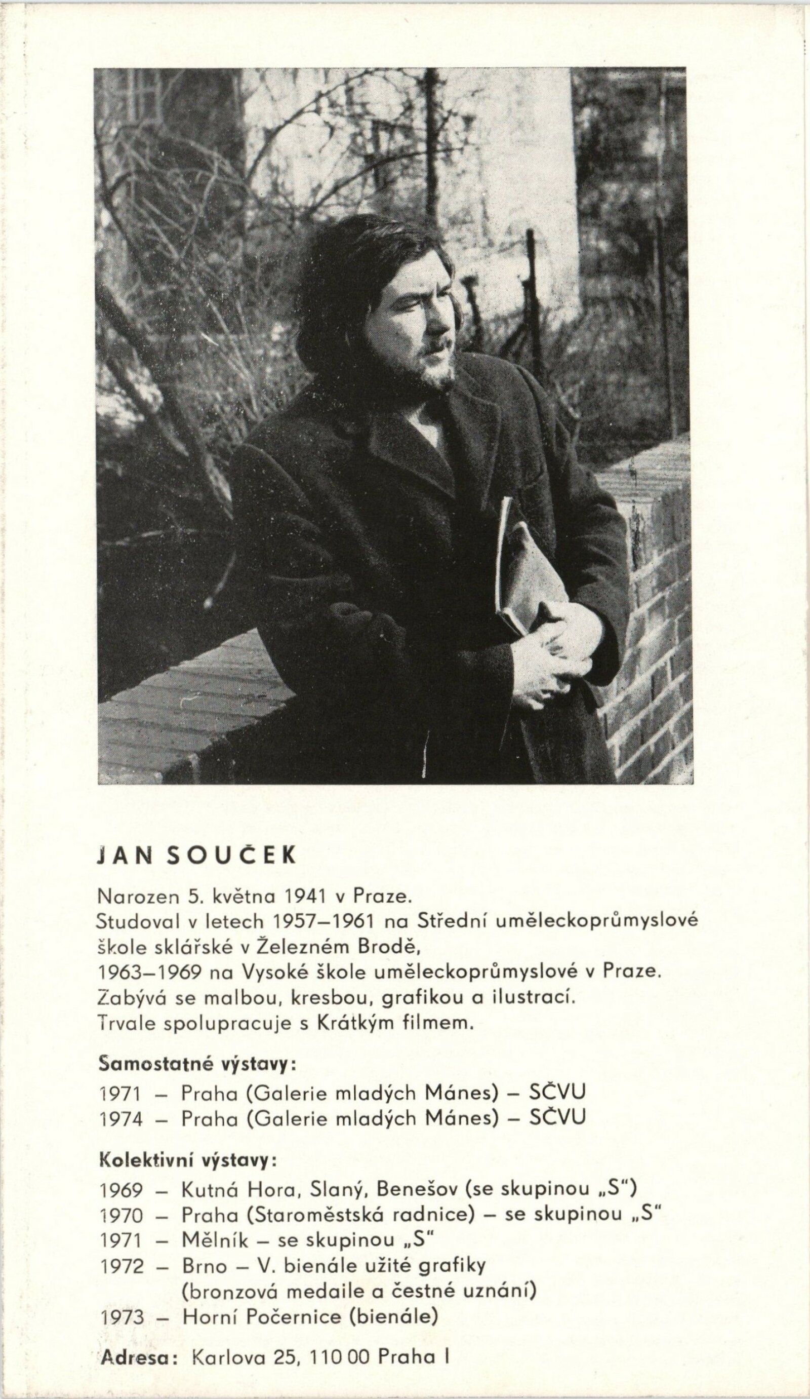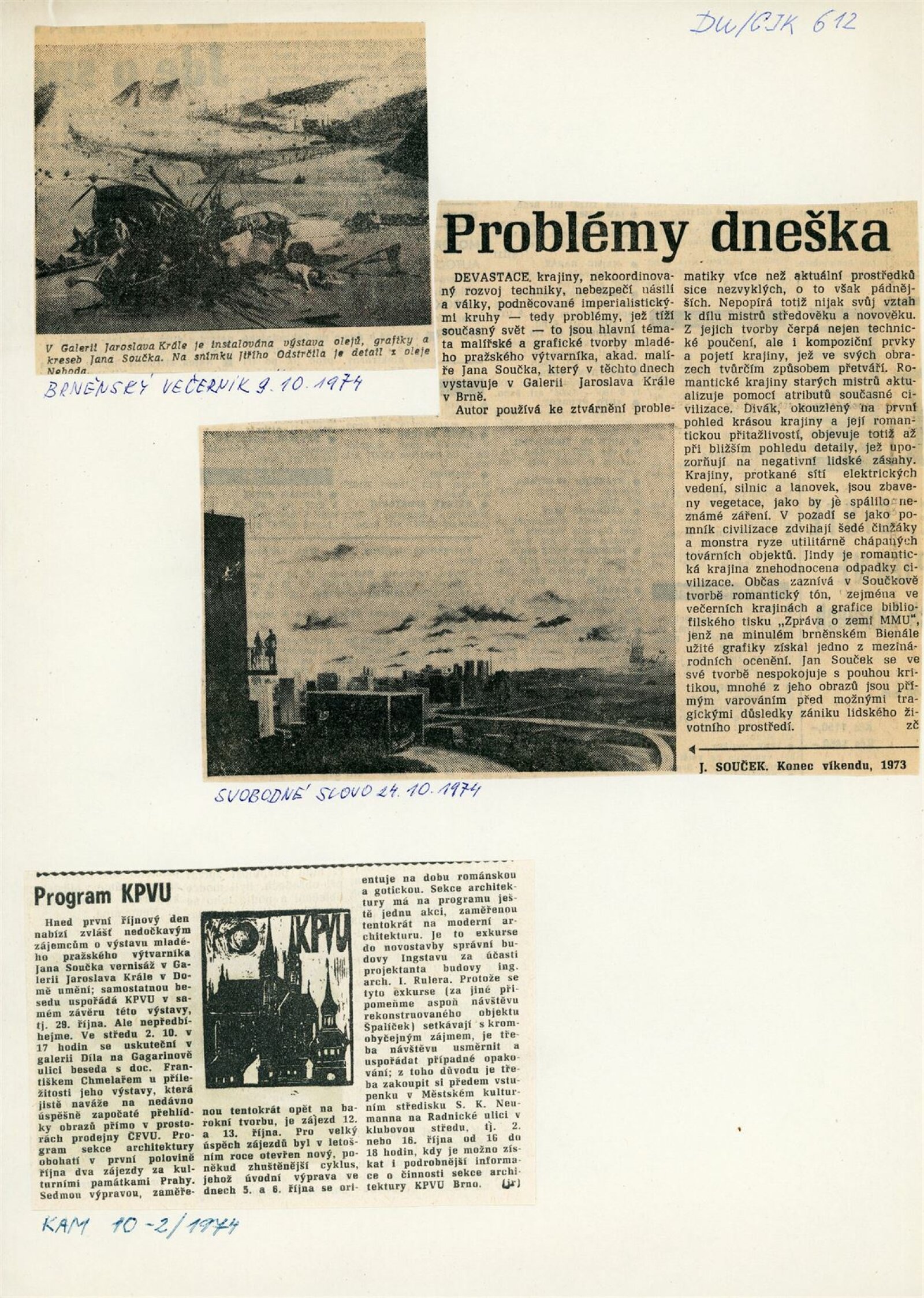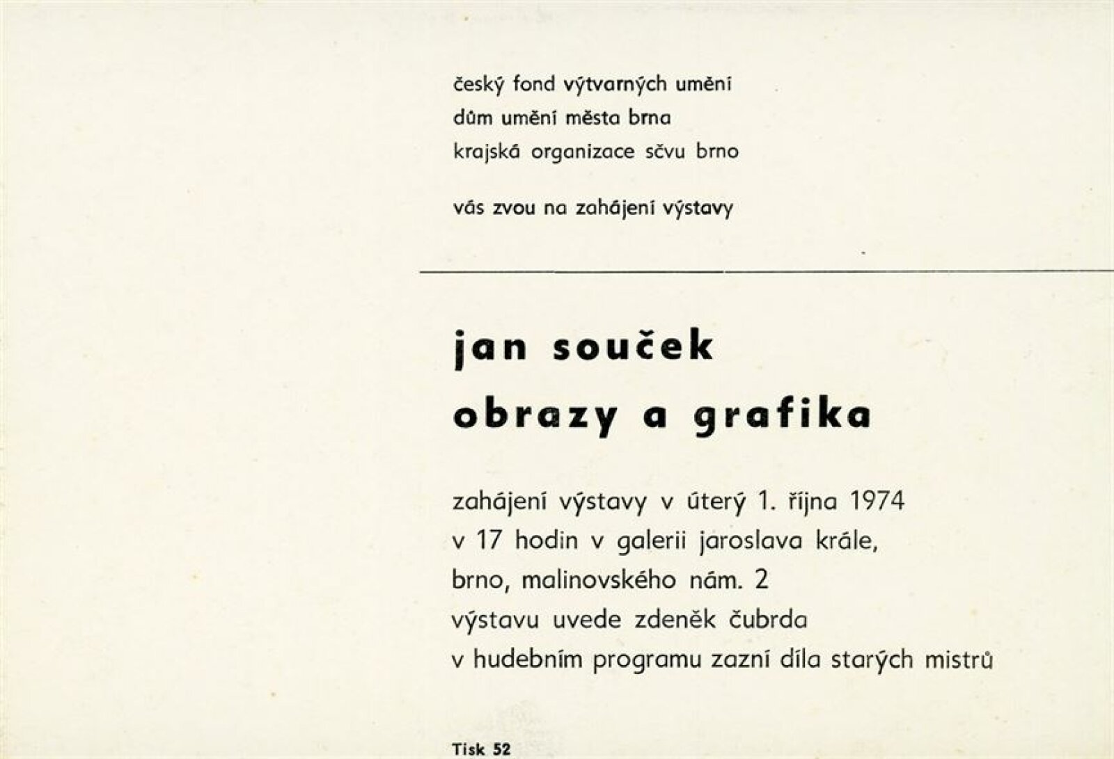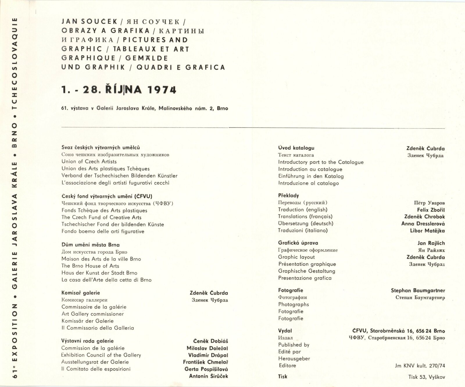 Jan Souček. Obrazy a grafika: Dům umění, 61. výstava v Galerii Jaroslava Krále, 1. 10. – 28. 10. 1974 / Text: Zdeněk Čubrda. – Brno: ČFVU, 1974. – 10 s., obr., seznam vystavených prací 2 s., portrét, životní data, výstavy, DU 612. – MG; MMB