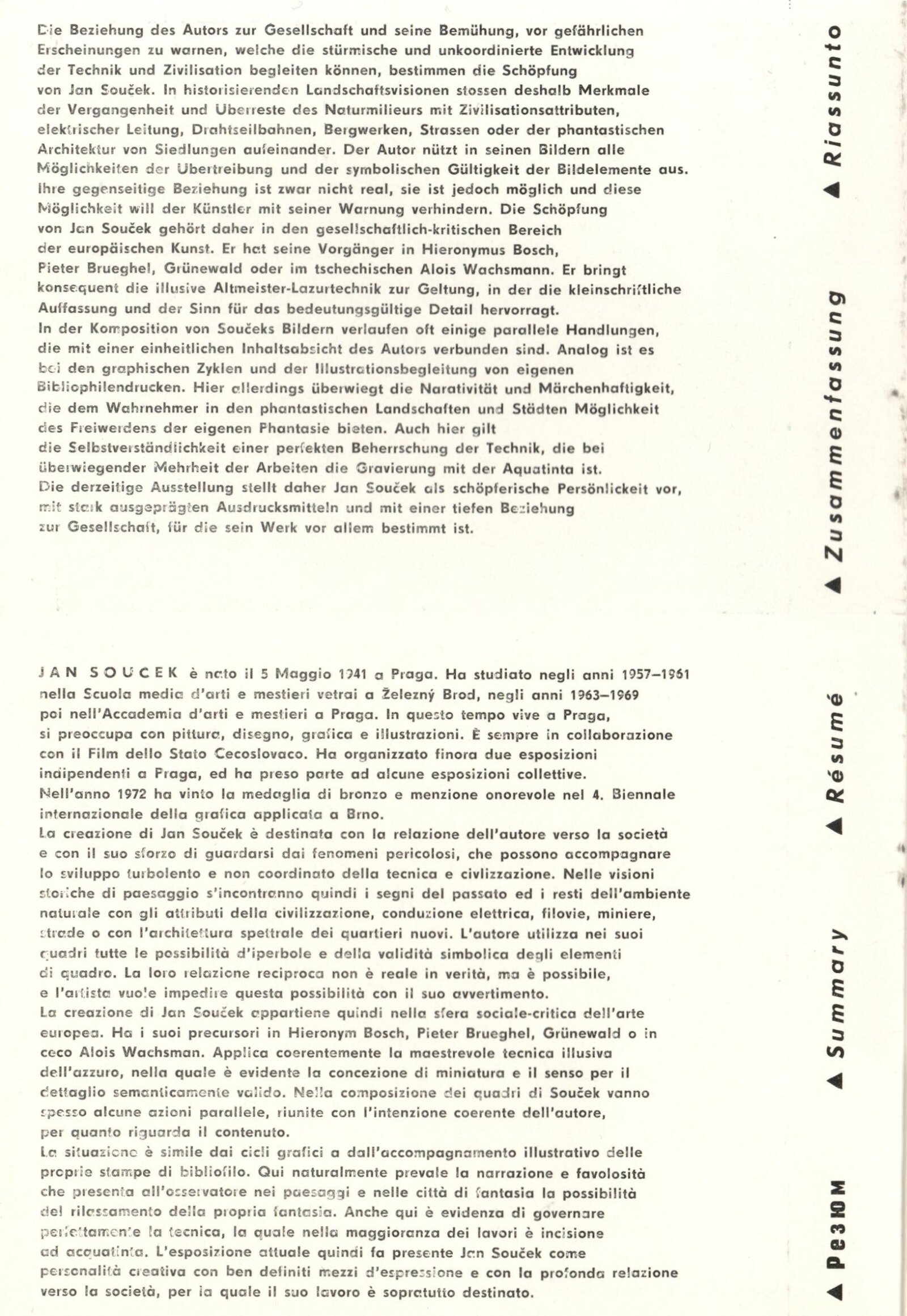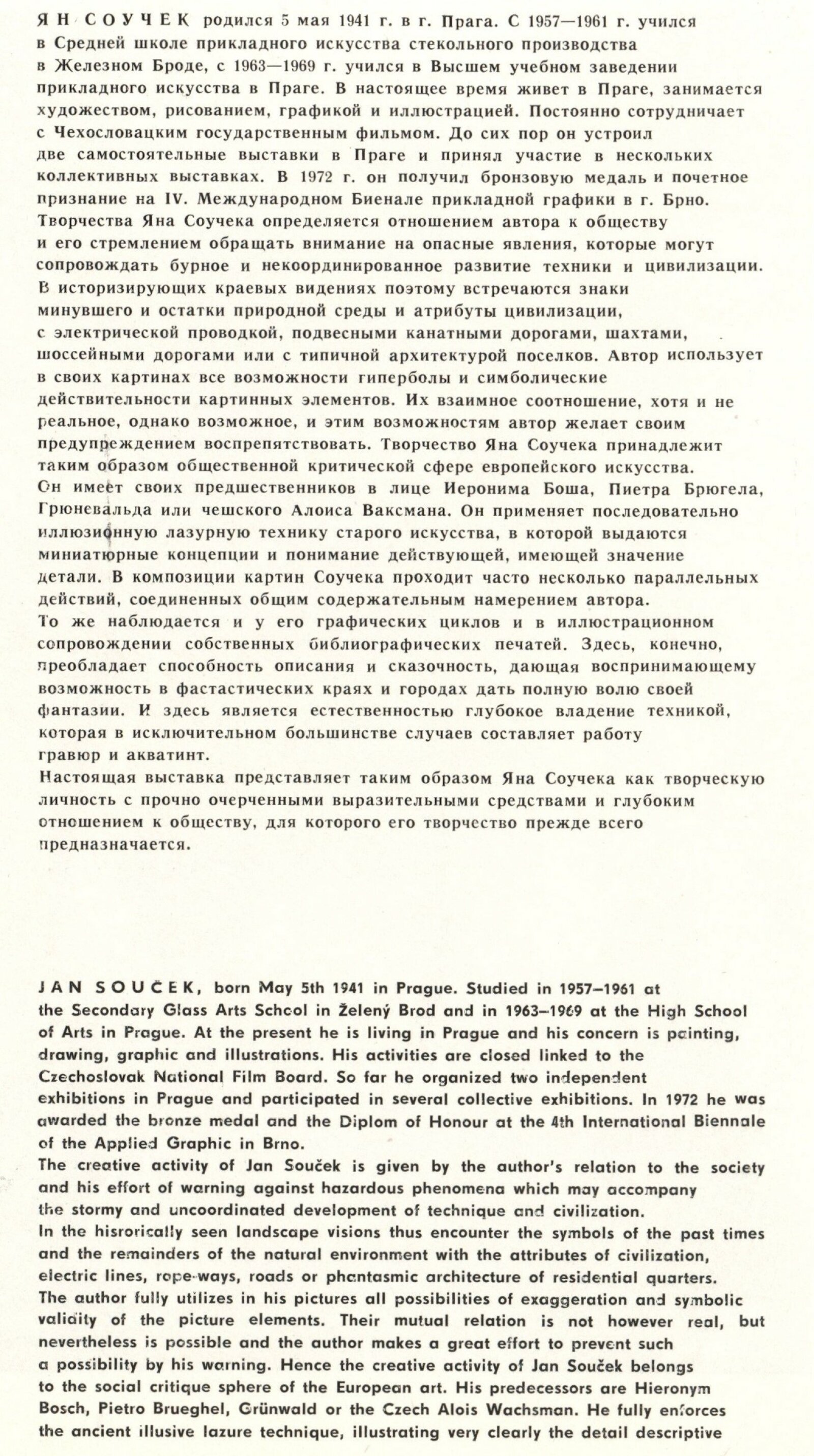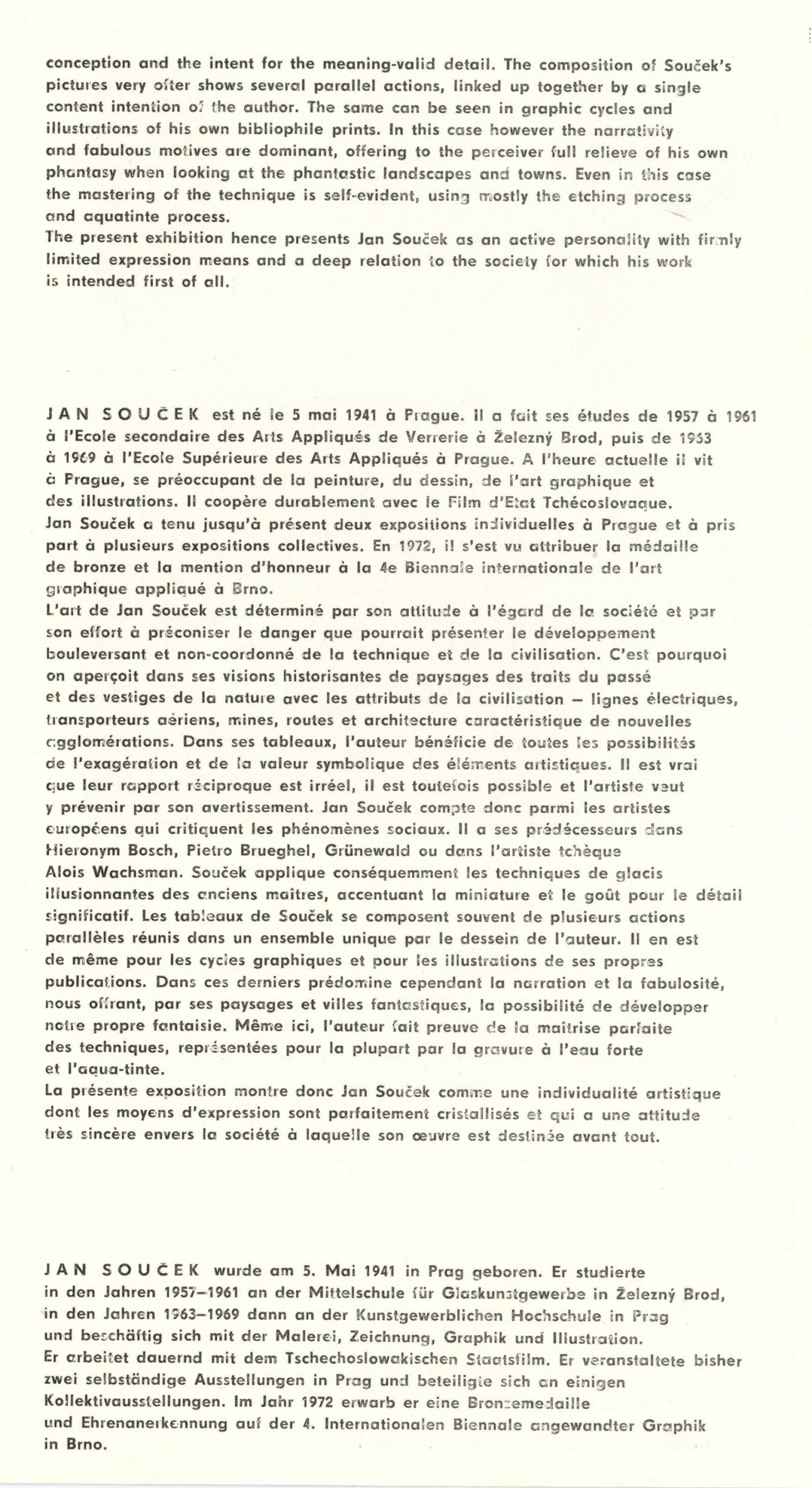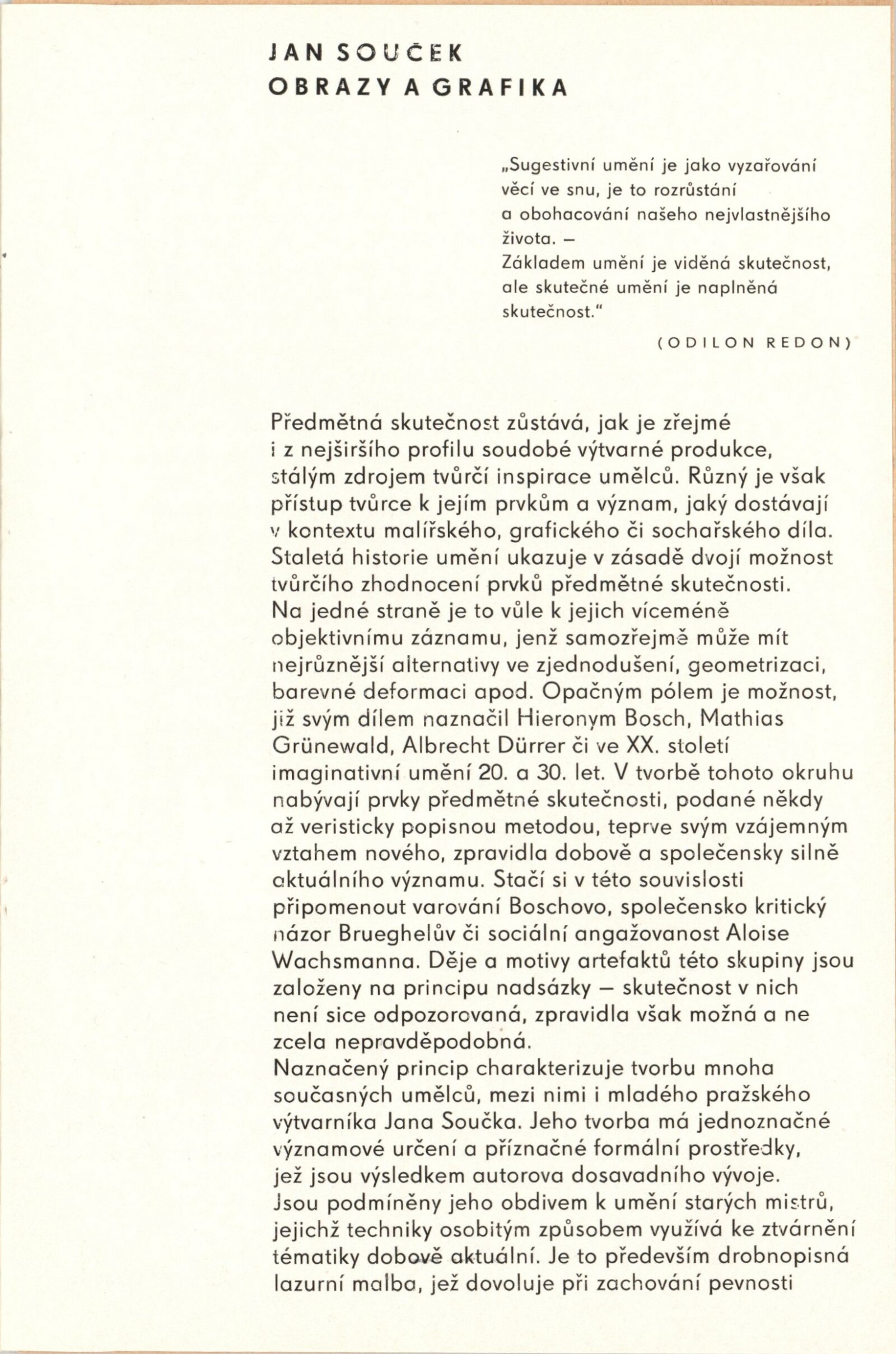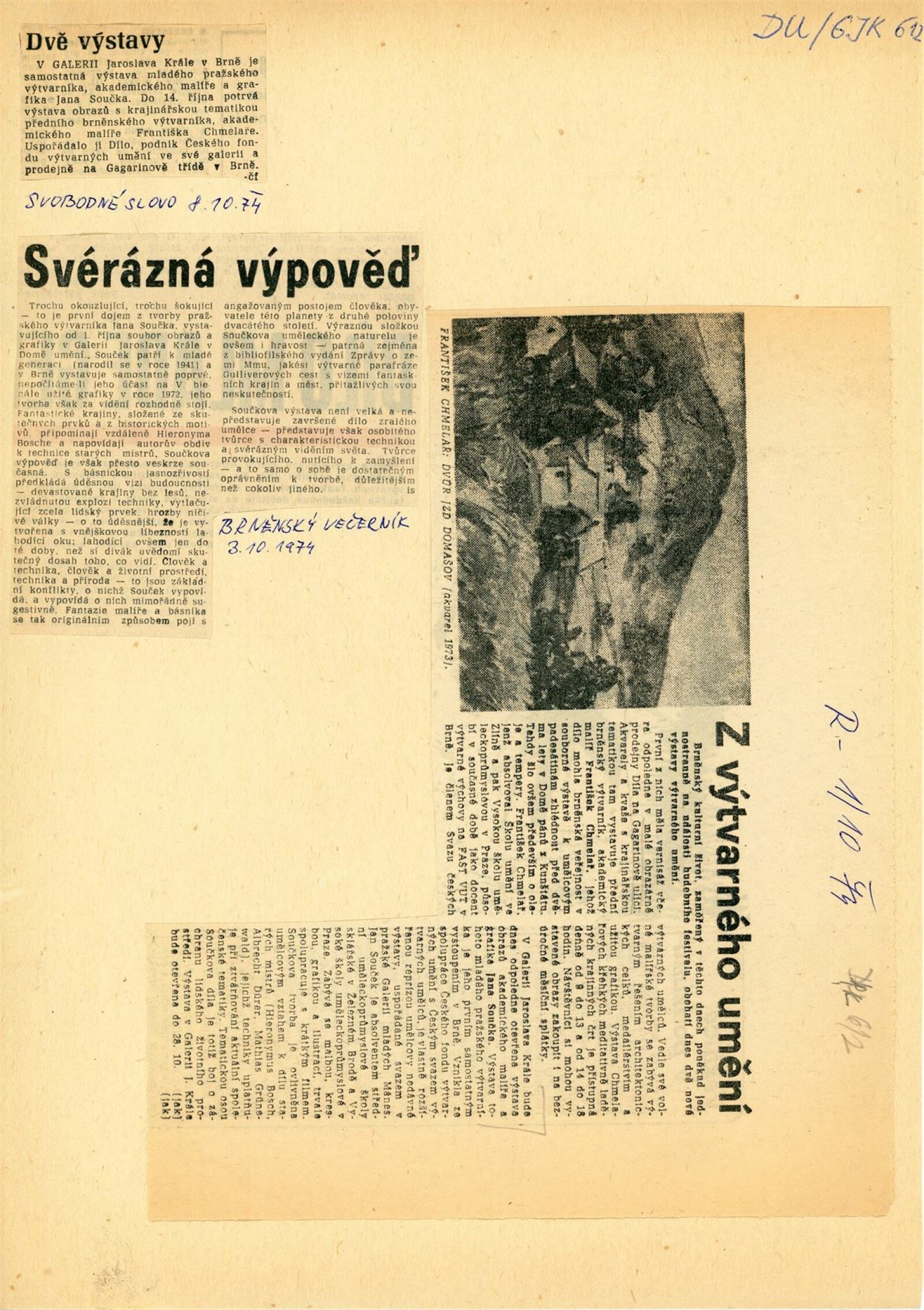 Jan Souček. Obrazy a grafika: Dům umění, 61. výstava v Galerii Jaroslava Krále, 1. 10. – 28. 10. 1974 / Text: Zdeněk Čubrda. – Brno: ČFVU, 1974. – 10 s., obr., seznam vystavených prací 2 s., portrét, životní data, výstavy, DU 612. – MG; MMB