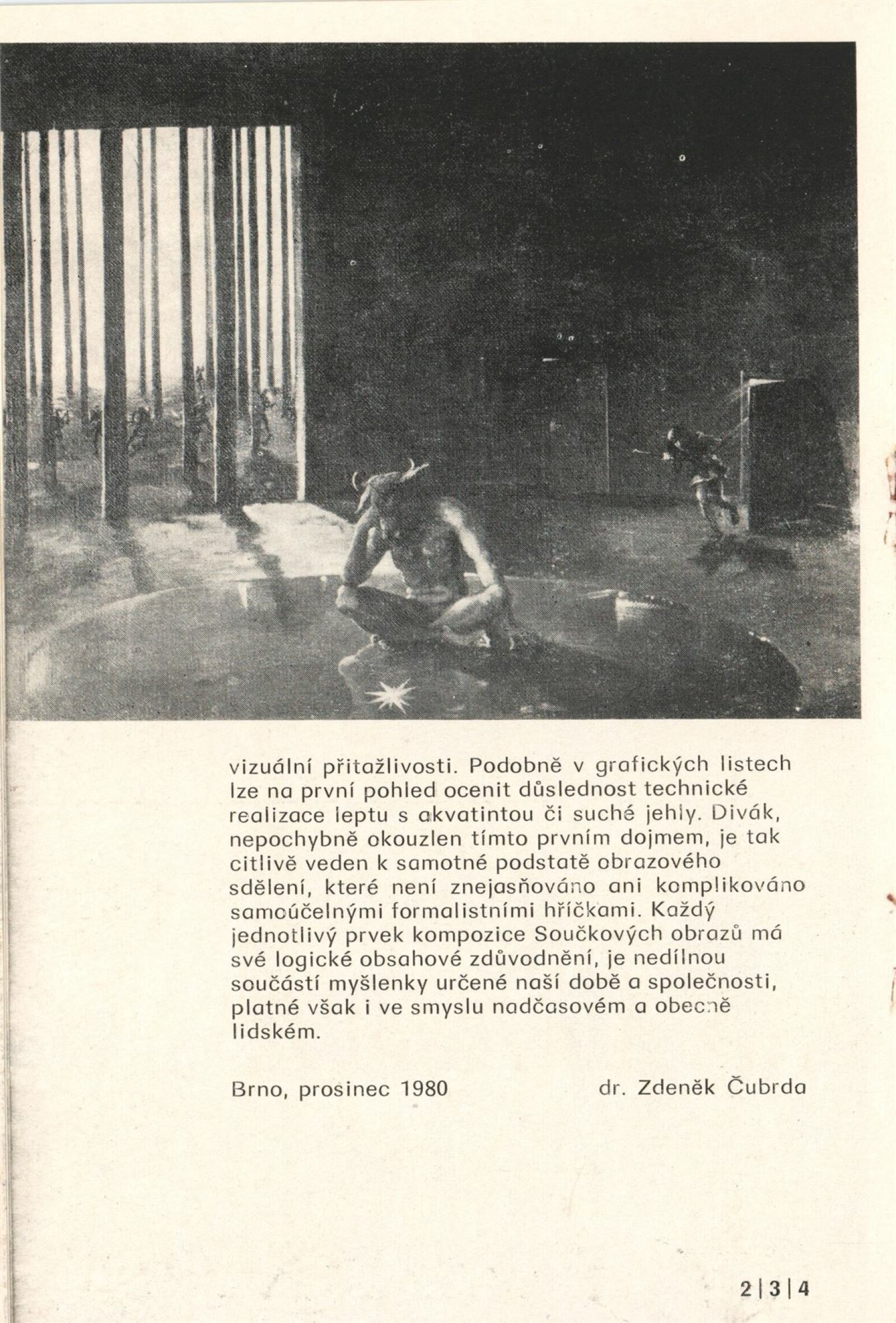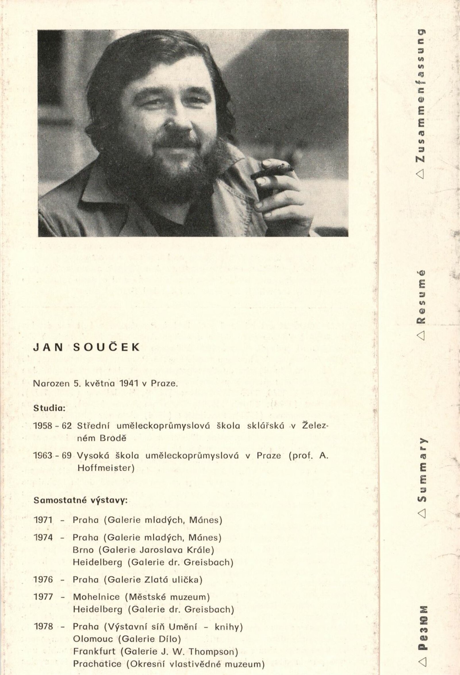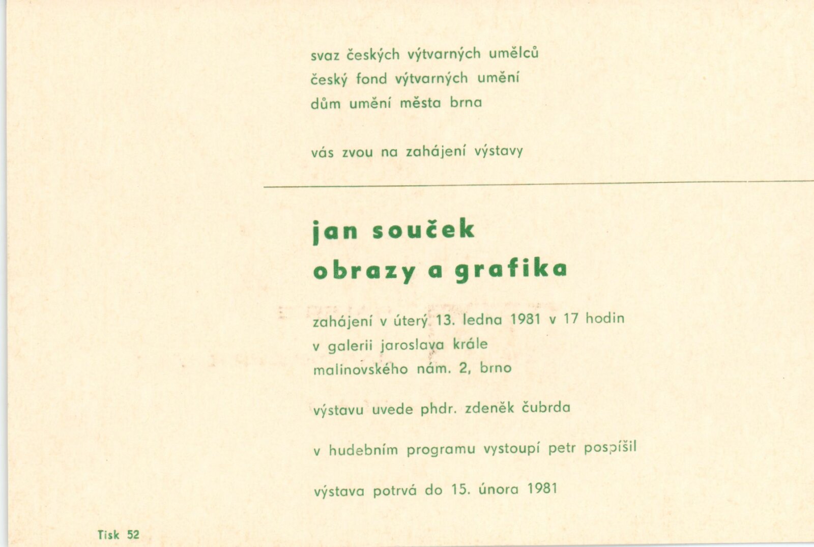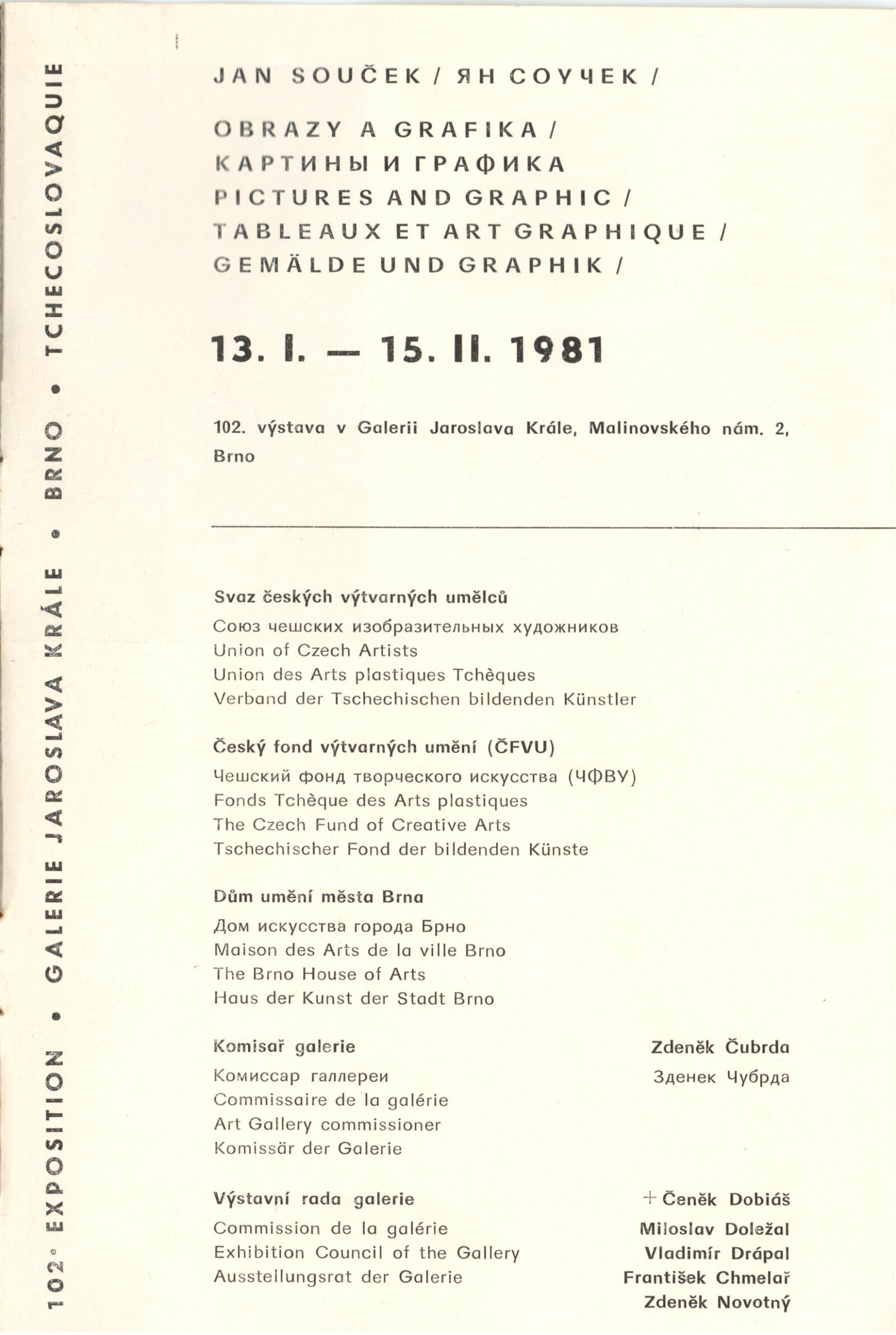 Jan Souček. Obrazy a krajina: Dům umění, 102. výstava v Galerii Jaroslava Krále, 13. 1. – 15. 2. 1981 / Text: Zdeněk Čubrda. – Brno: ČFVU, 1981. – 10 s., obr., portrét, životní data, výstavy, DU 723