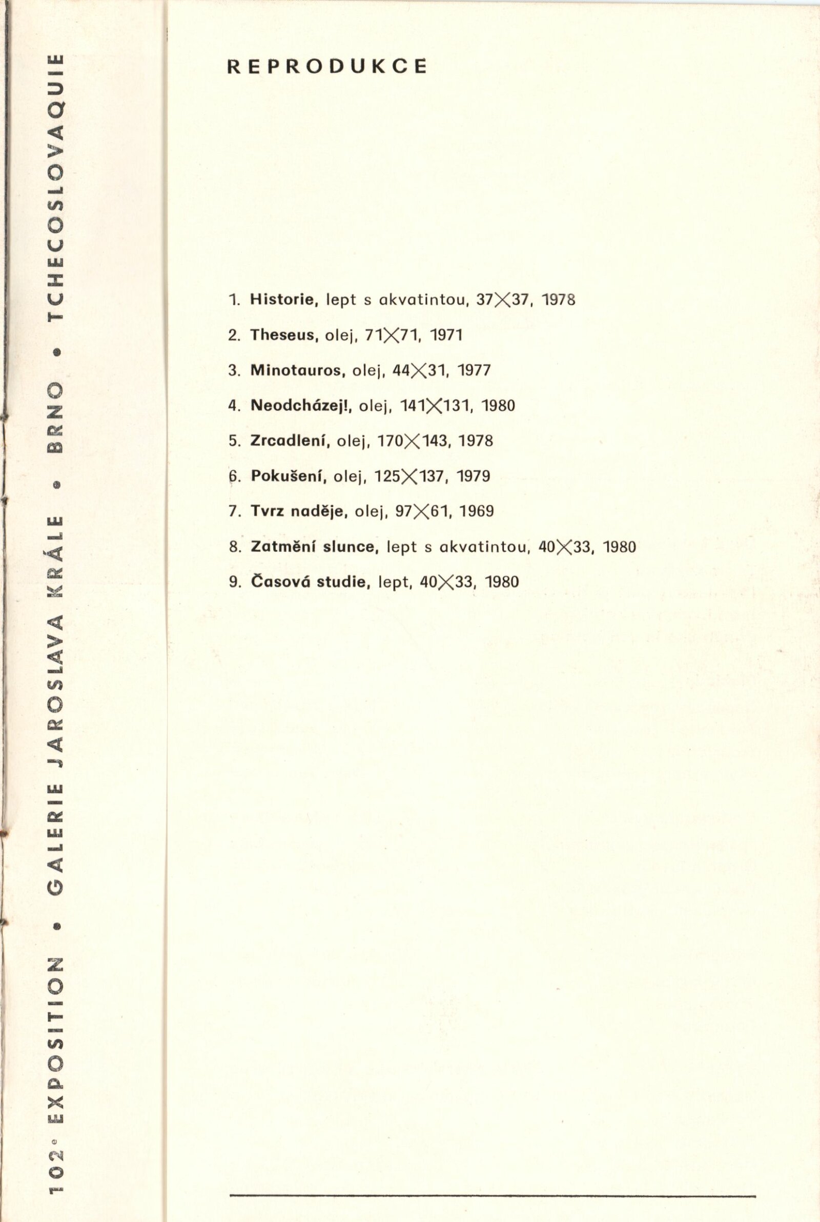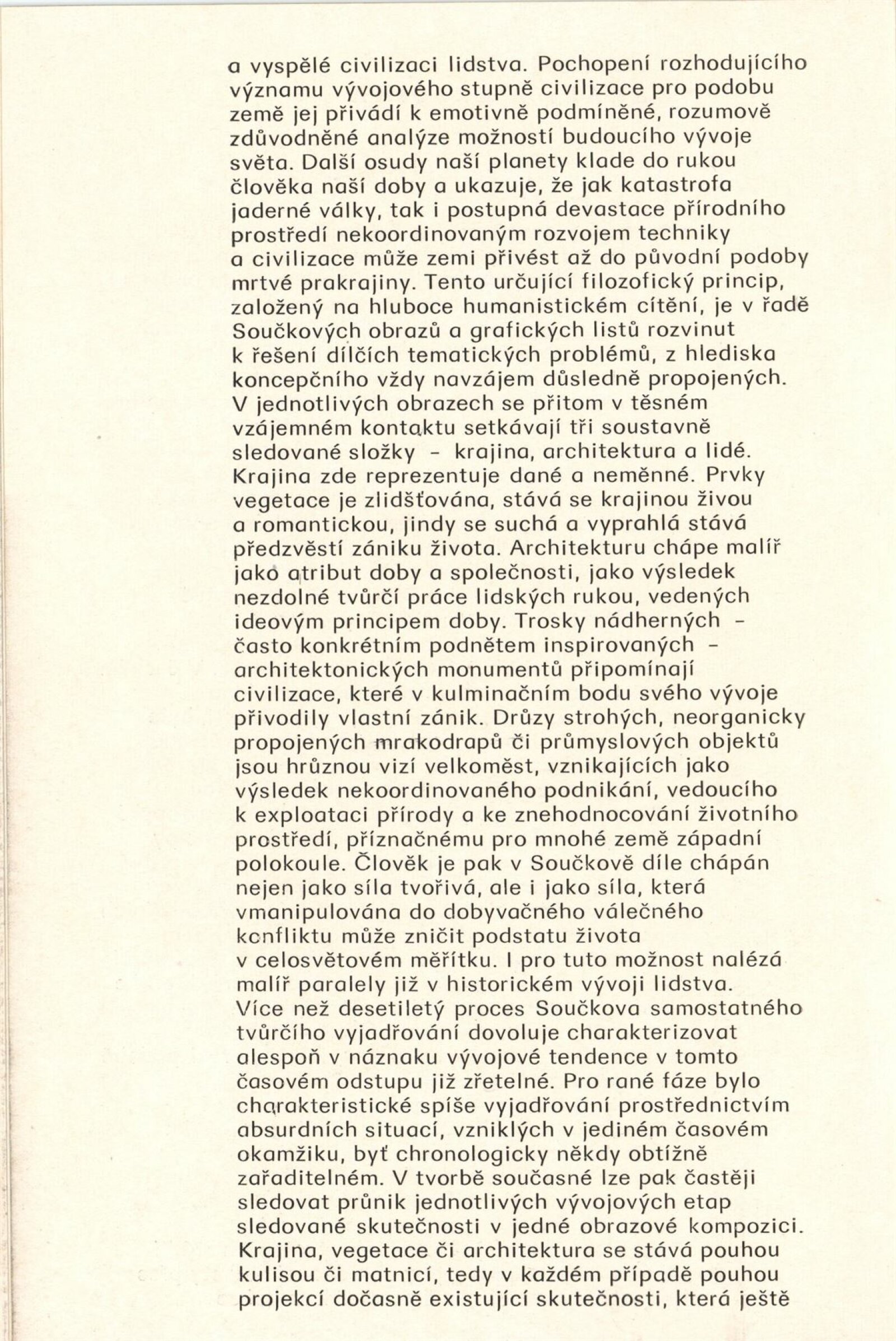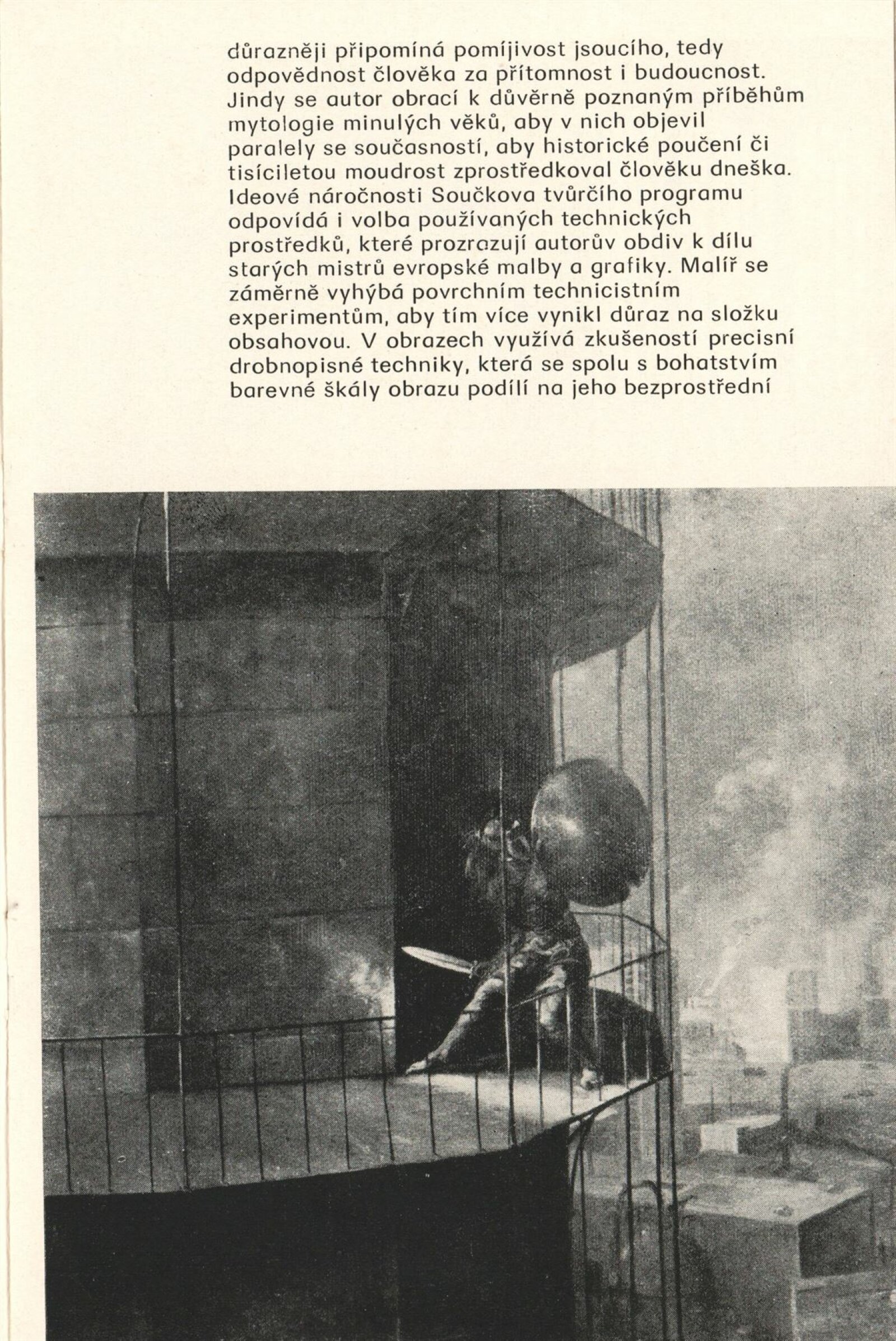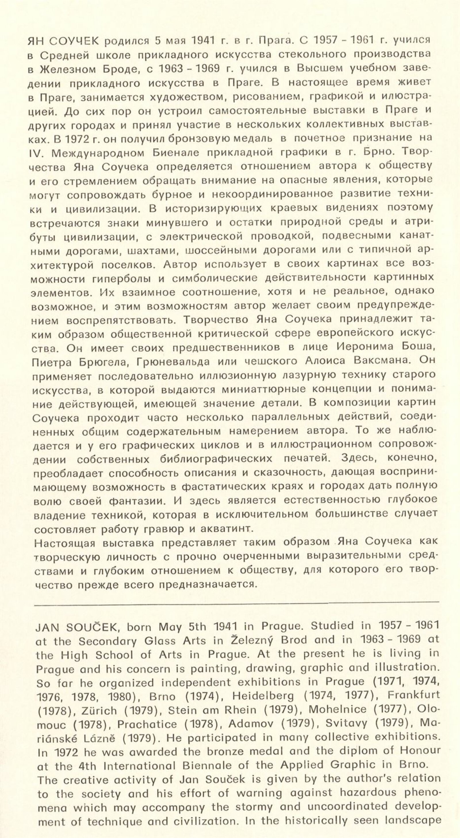 Jan Souček. Obrazy a krajina: Dům umění, 102. výstava v Galerii Jaroslava Krále, 13. 1. – 15. 2. 1981 / Text: Zdeněk Čubrda. – Brno: ČFVU, 1981. – 10 s., obr., portrét, životní data, výstavy, DU 723