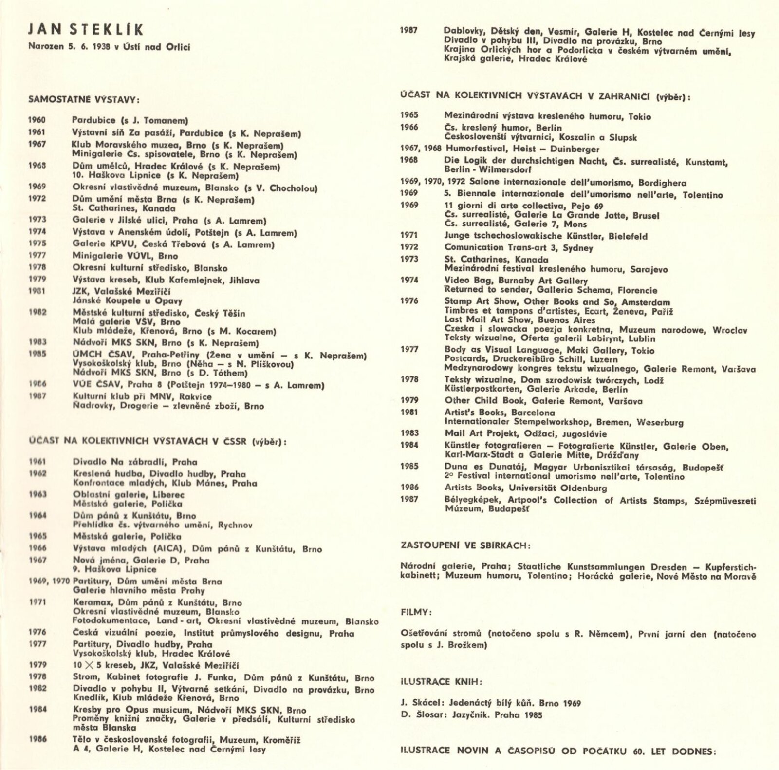Jan Steklík. [Objekty, kresby]: Dům umění / Dům pánů z Kunštátu, Kabinet grafiky, 24. 11. 1987 – 3. 1. 1988 / Text: Jiří Valoch. – Brno: DUmB, 1987. – [24] s., obr., životní data, výstavy, zastoupení ve sbírkách, ilustrace, DPK 901. – MZK; MG; MMB