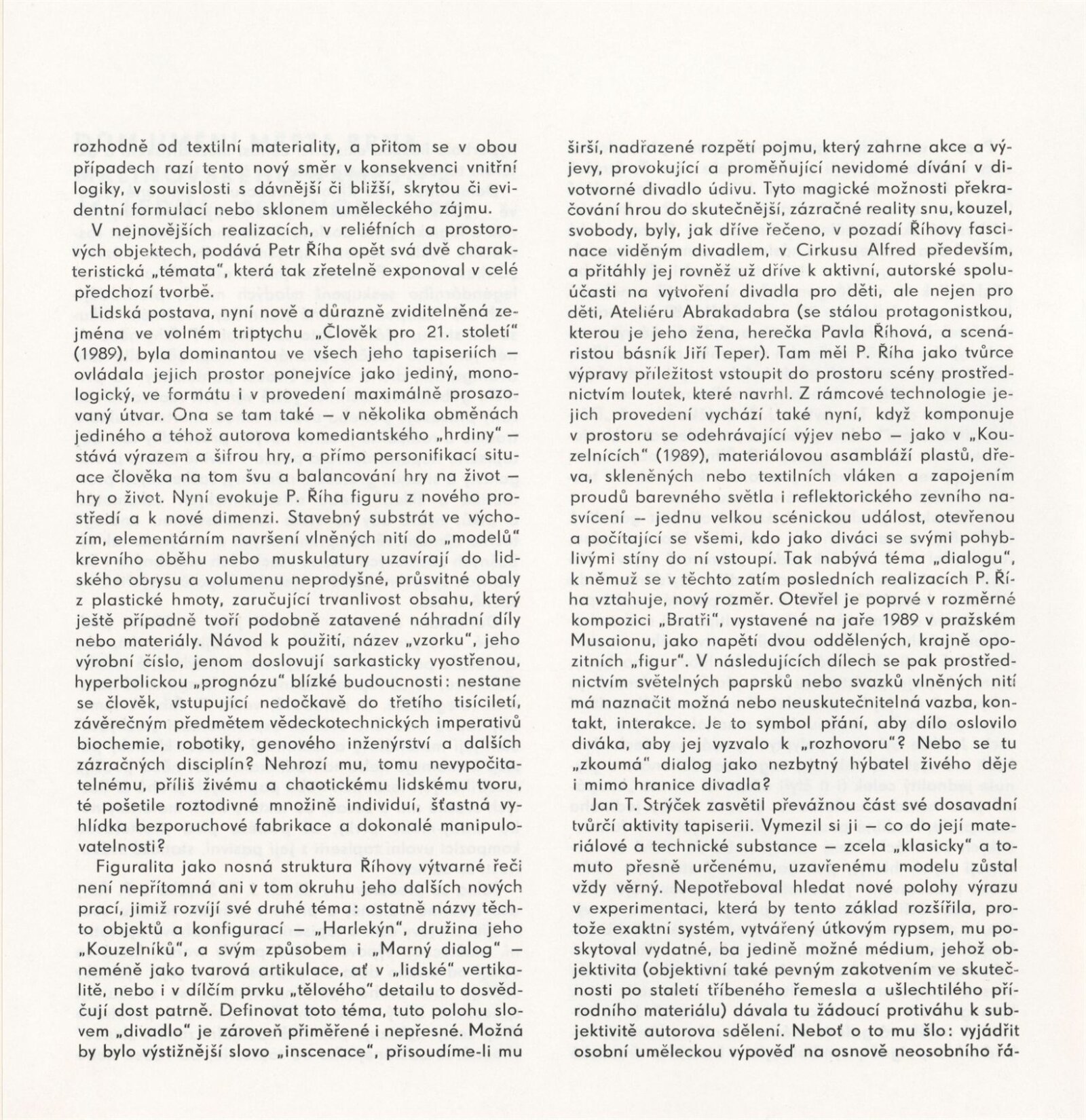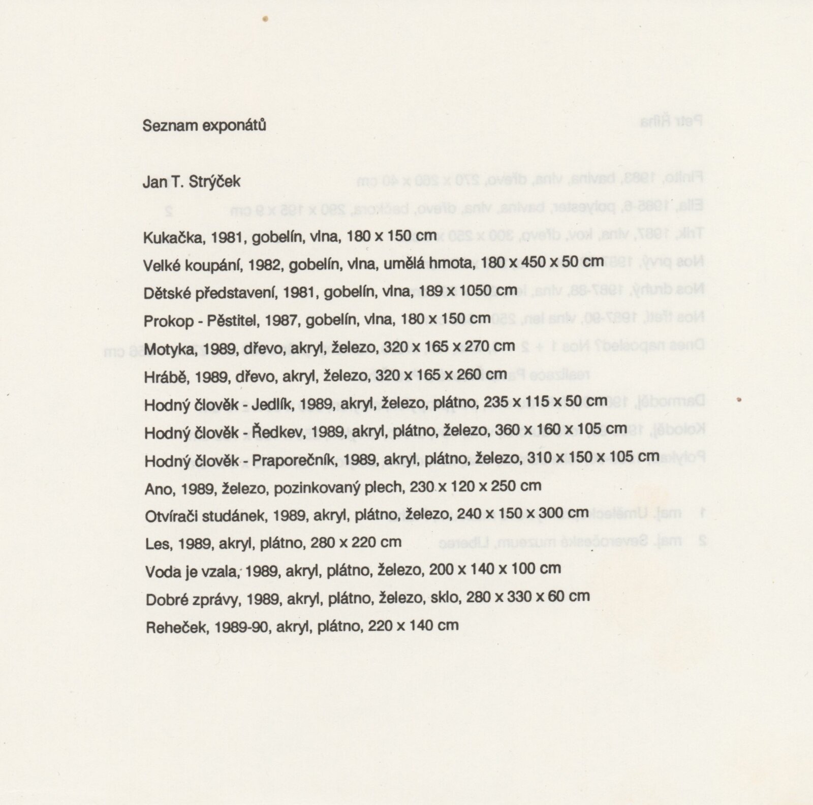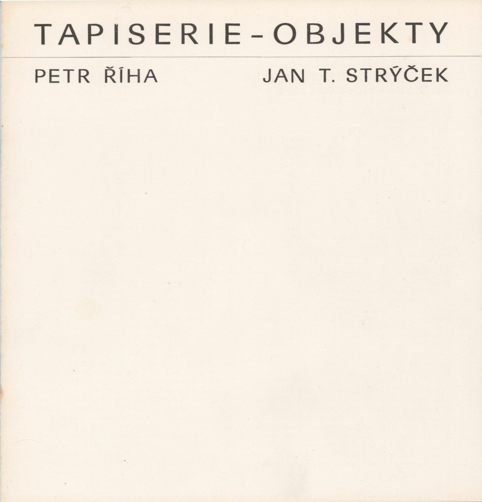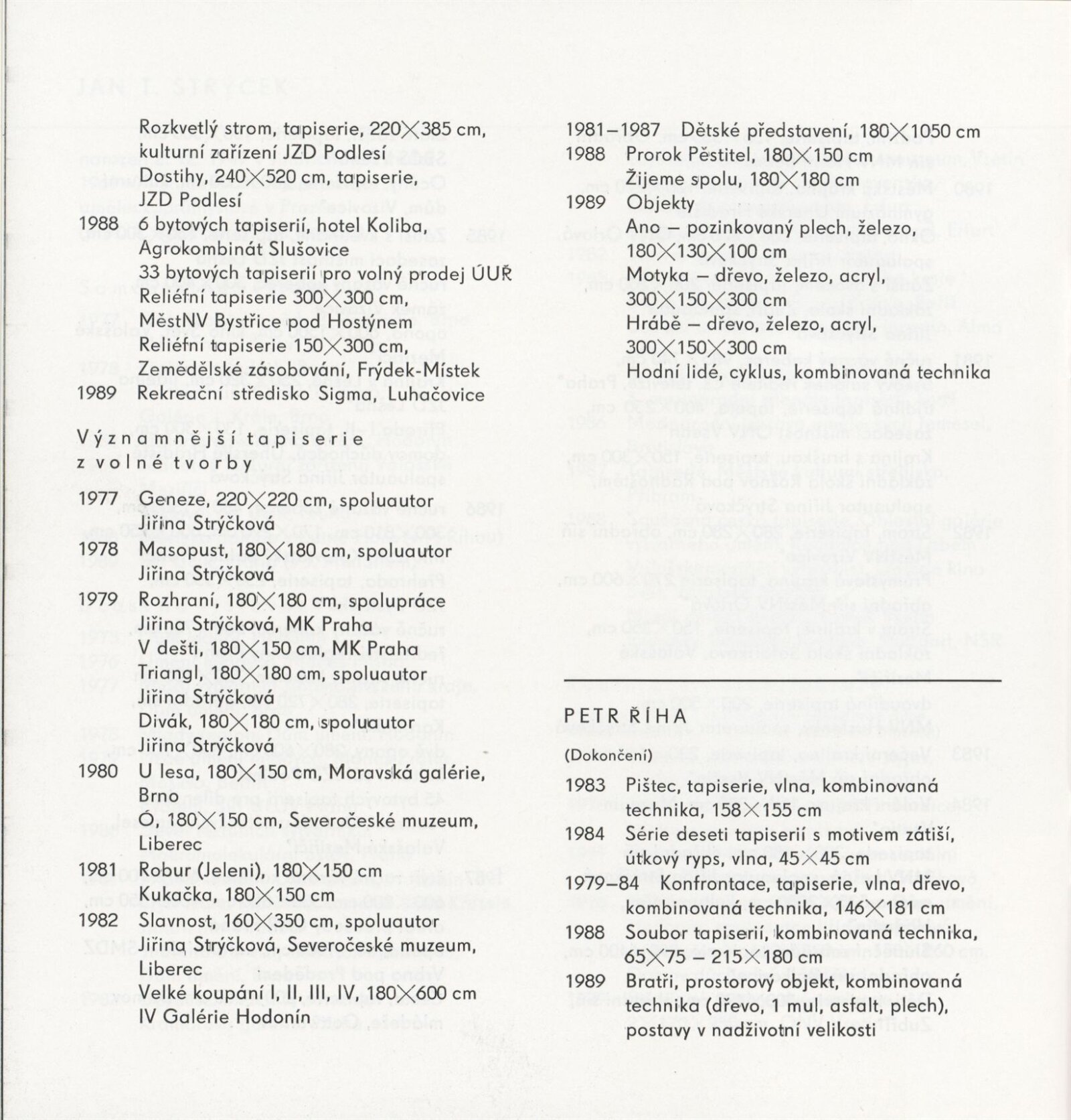 Petr Říha. Jan T. Strýček. Tapiserie. Objekty: Dům umění města Brna, 1. patro, 16. 1. – 25. 2. 1990 / Texty: Ludmila Kybalová, Antonín Hartmann. – Brno: DUmB, 1990. – [18] s., obr., životní data, výstavy, zastoupení ve sbírkách, realizace, významnější tapiserie, DU 881. – MZK; MG