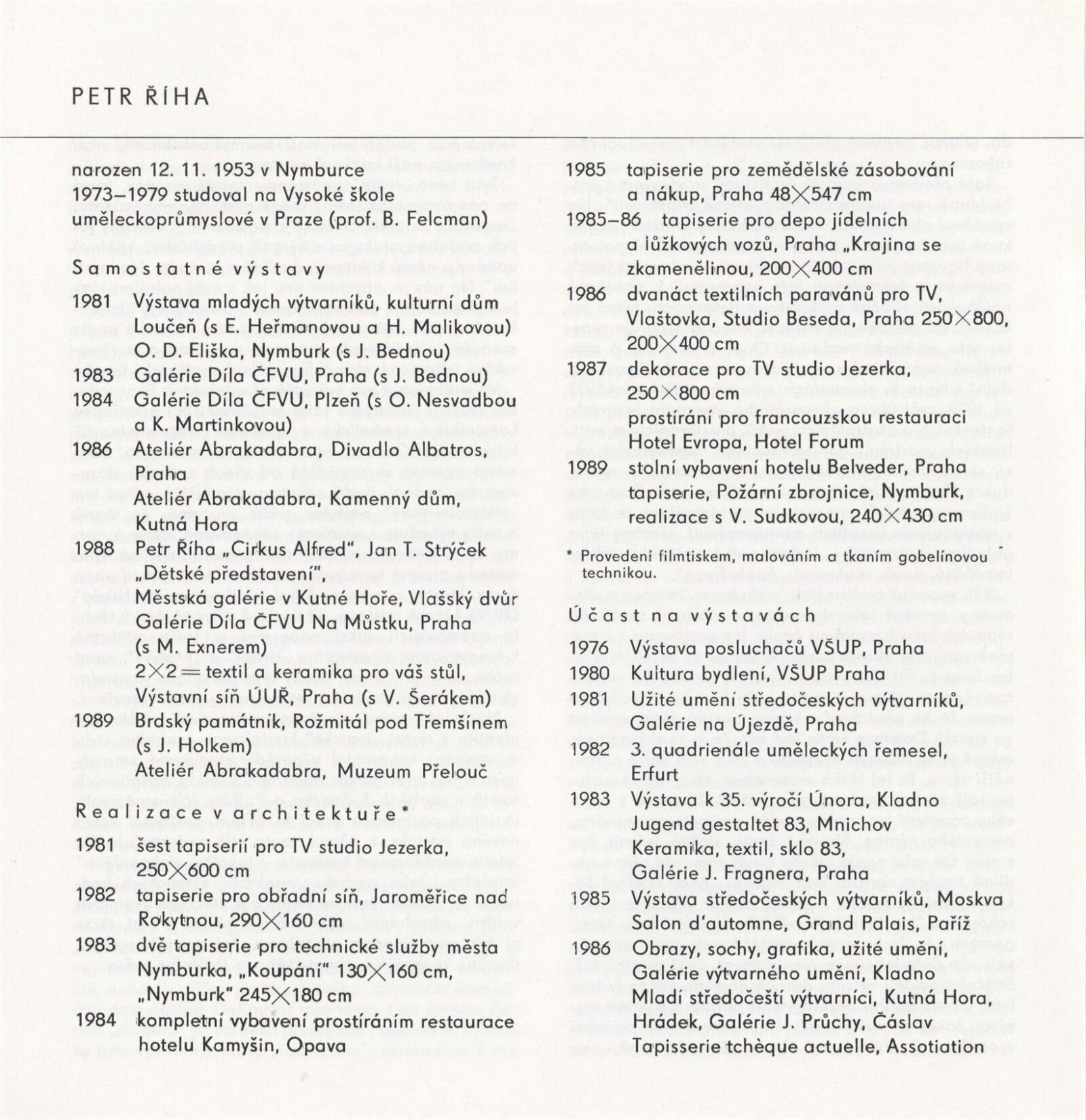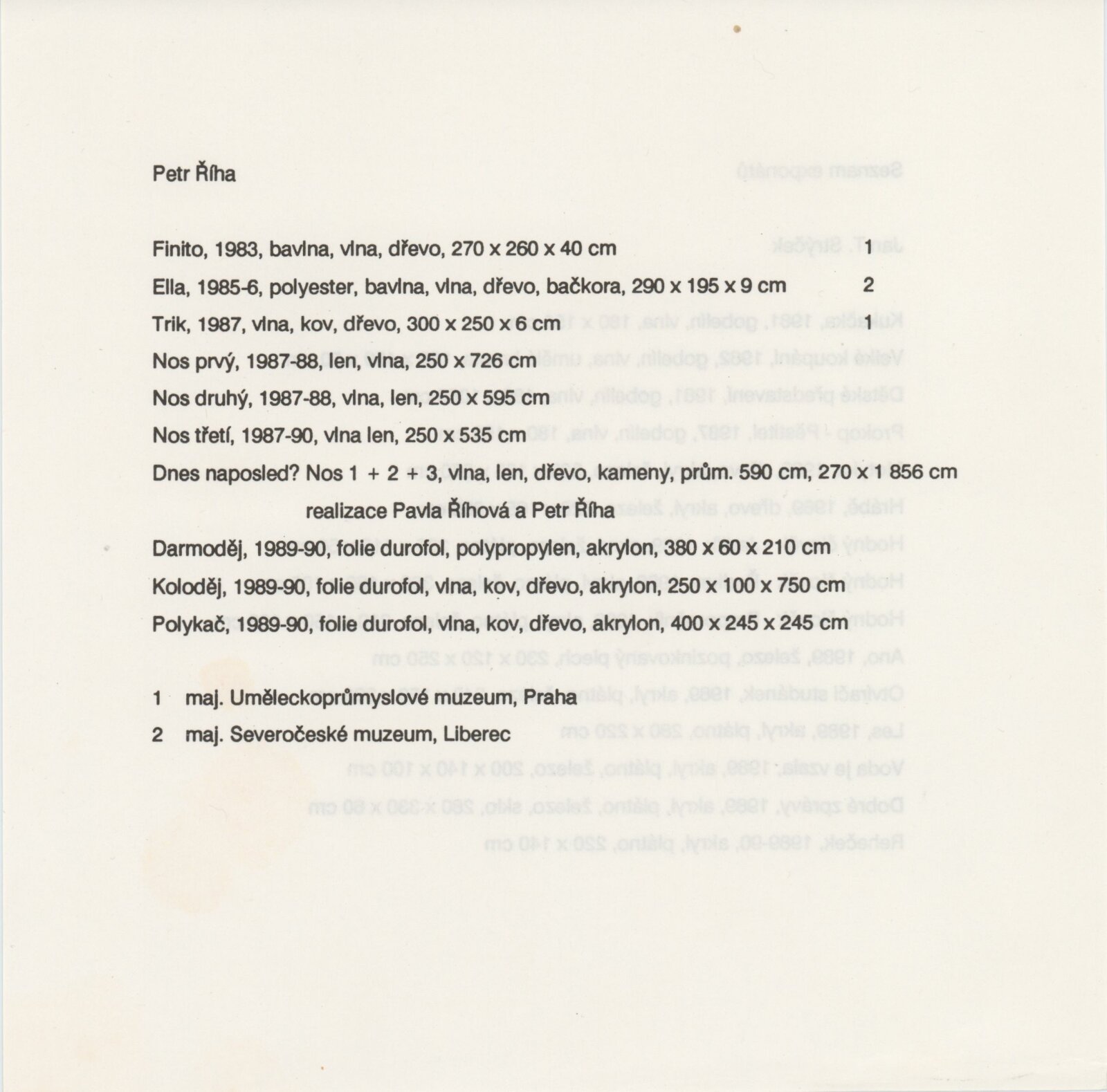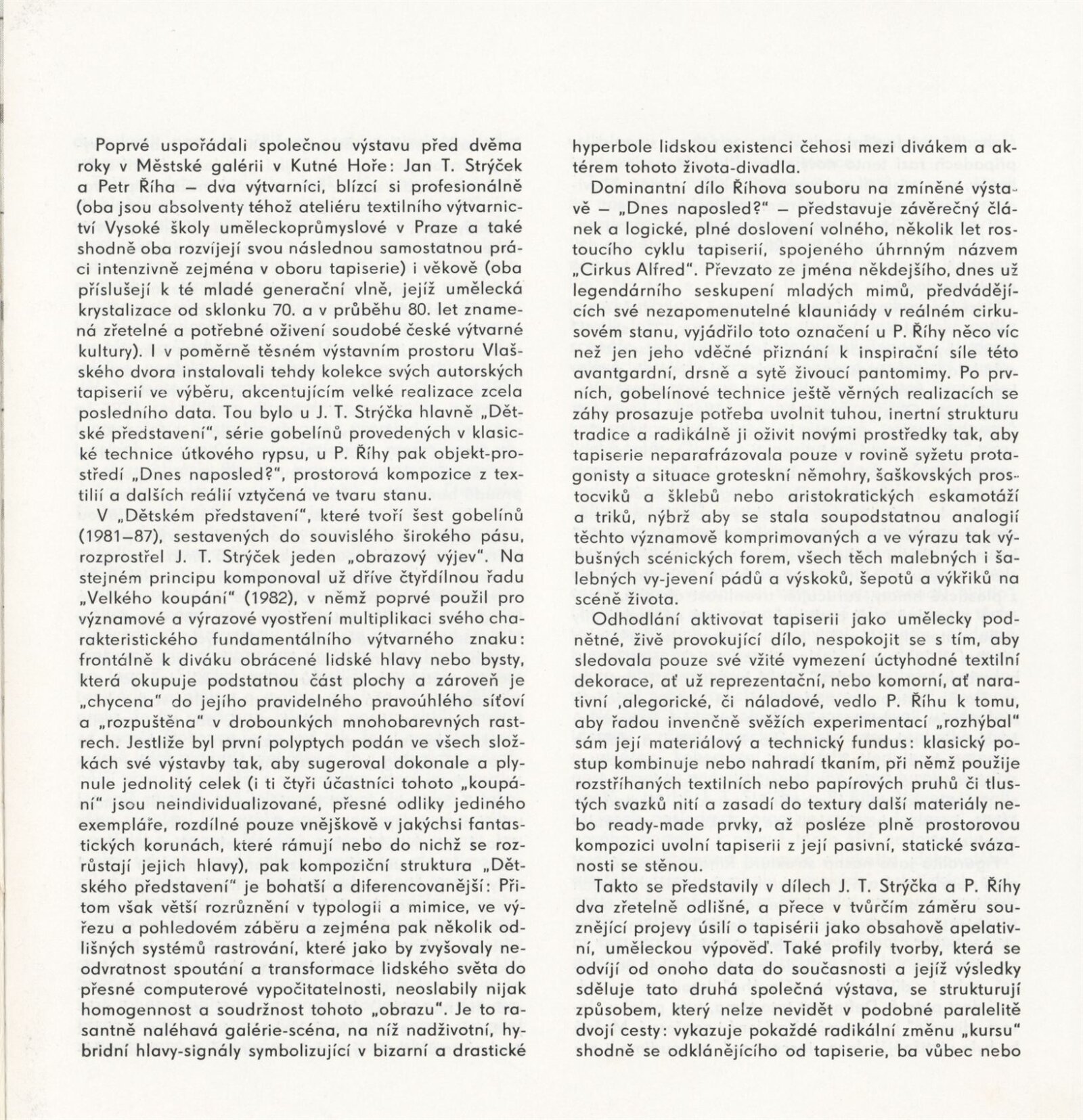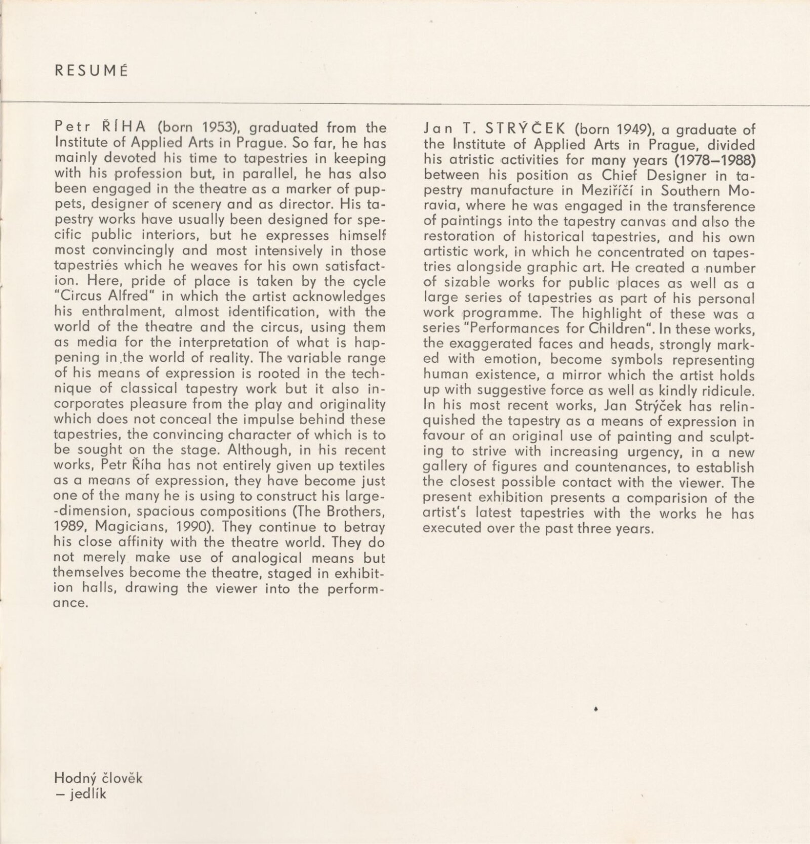 Petr Říha. Jan T. Strýček. Tapiserie. Objekty: Dům umění města Brna, 1. patro, 16. 1. – 25. 2. 1990 / Texty: Ludmila Kybalová, Antonín Hartmann. – Brno: DUmB, 1990. – [18] s., obr., životní data, výstavy, zastoupení ve sbírkách, realizace, významnější tapiserie, DU 881. – MZK; MG