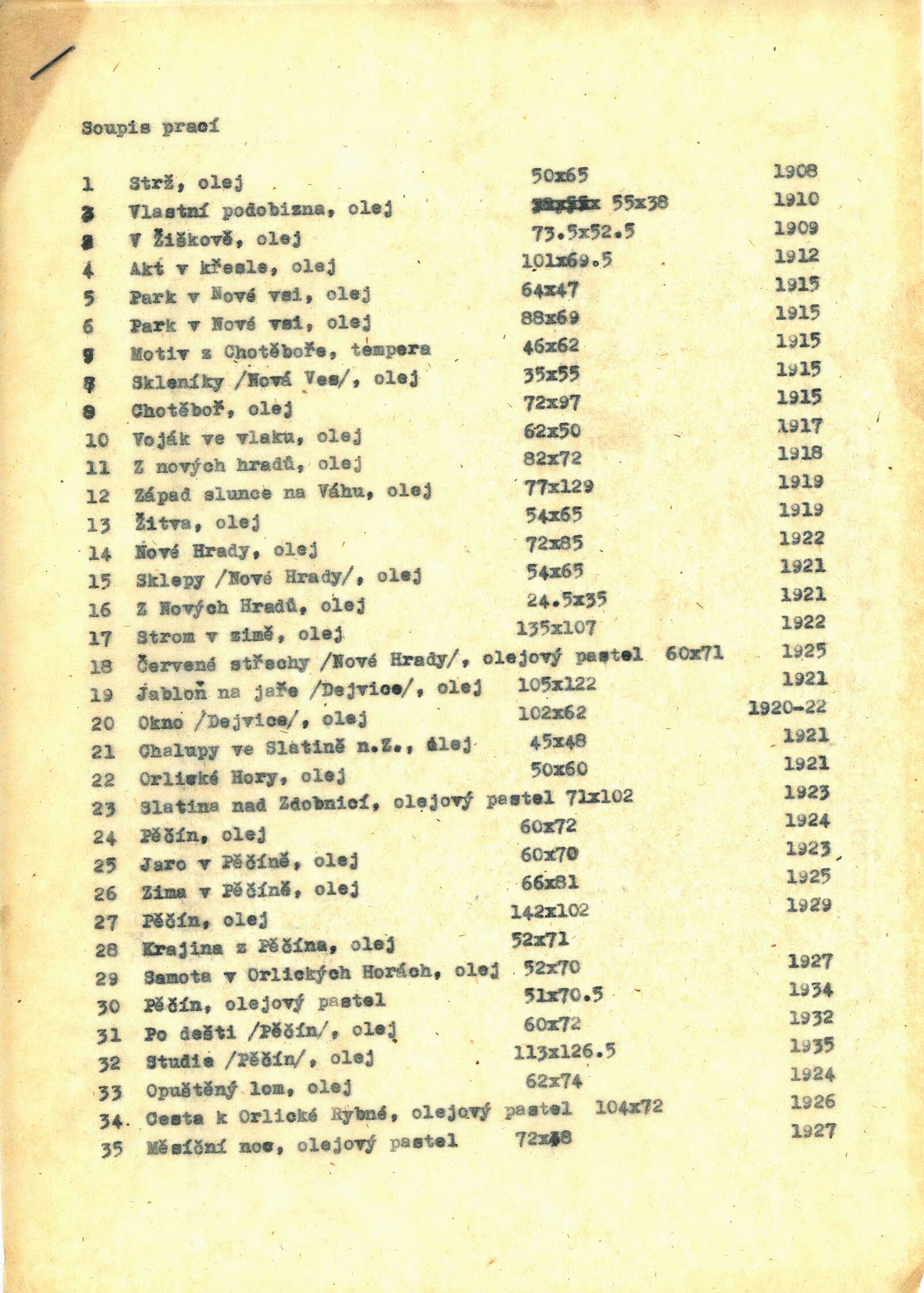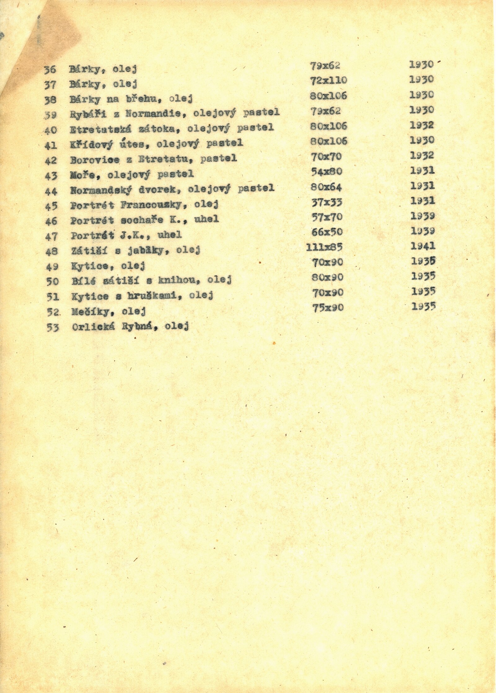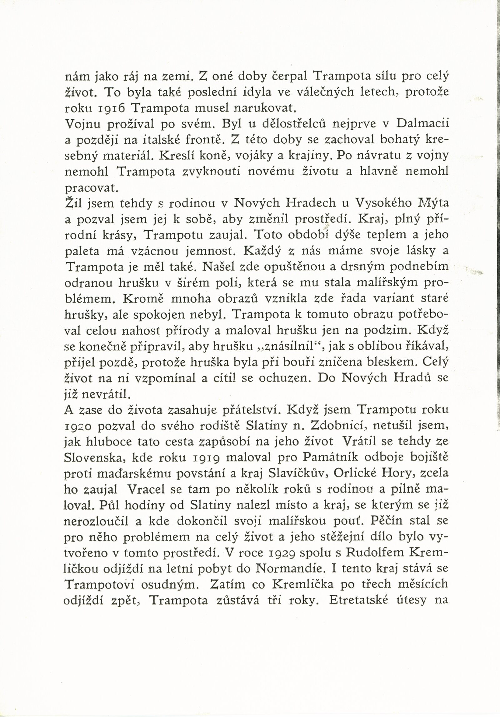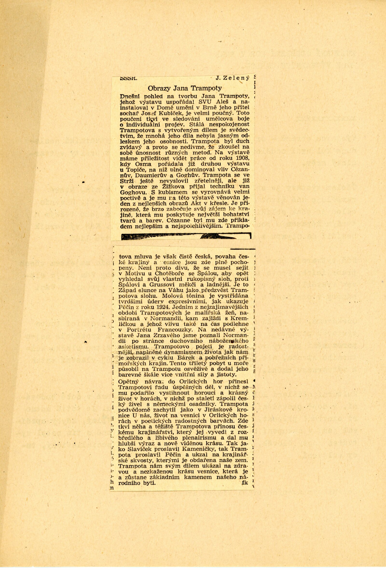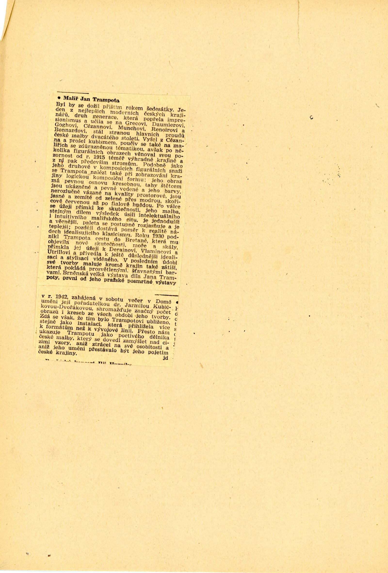 společná pozvánka s DU 67, katalog, přípravný text (medailony Jana Trampoty a Karla Svolinského), společný tištěný seznam vystavených prací (K 195, viz DU 64), soupisy vystavených a zapůjčených děl k výstavě Jana Trampoty, korespondence (s Jarmilou Kubíčkovou-Dvořákovou), provozní korespondence, adresy majitelů, recenze v tisku
