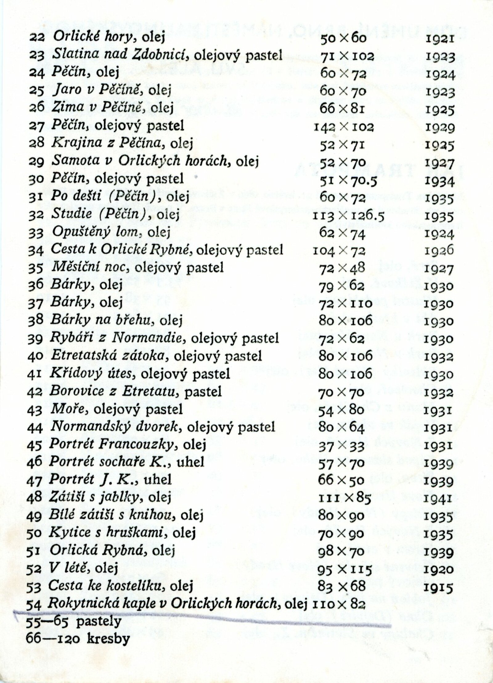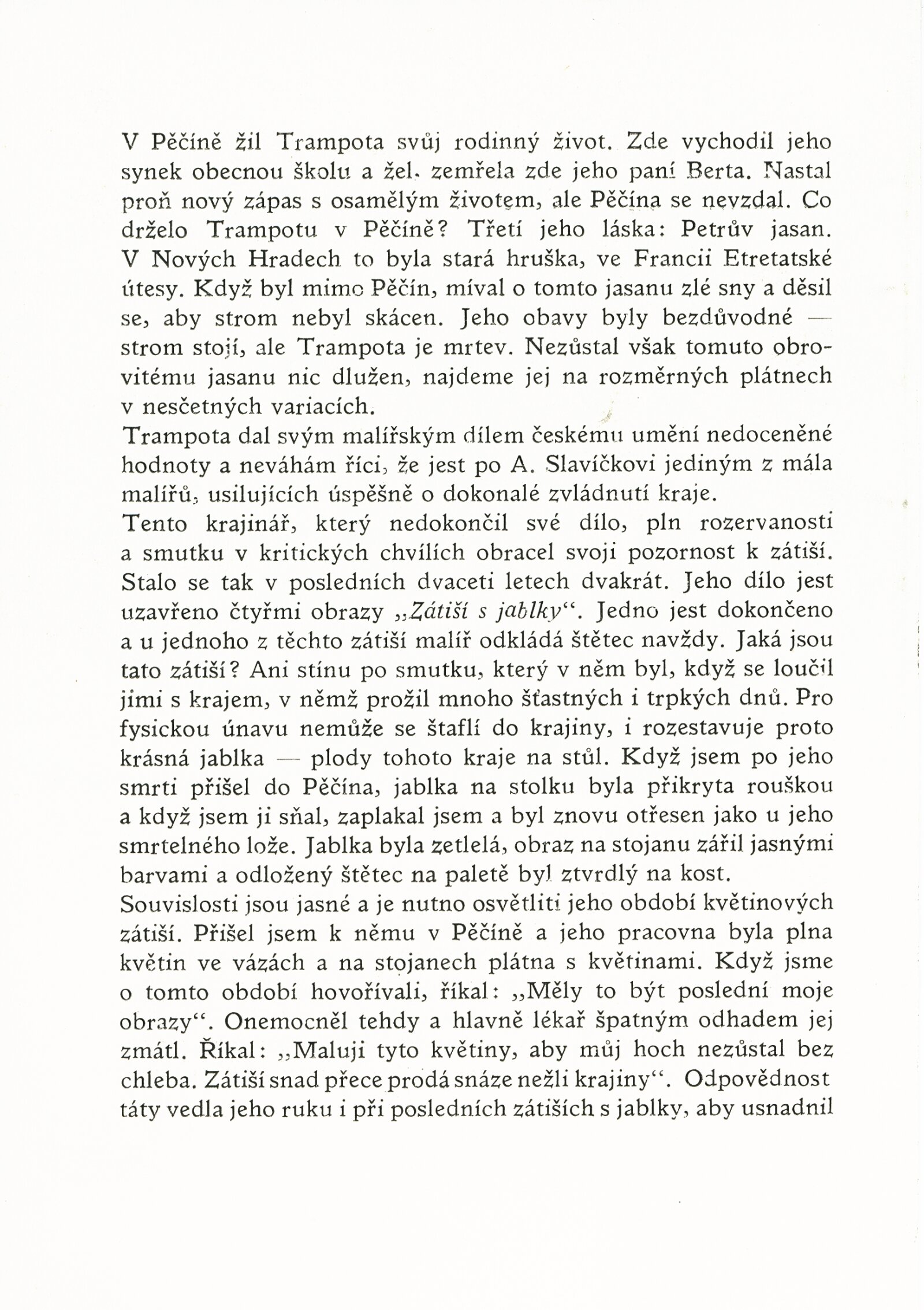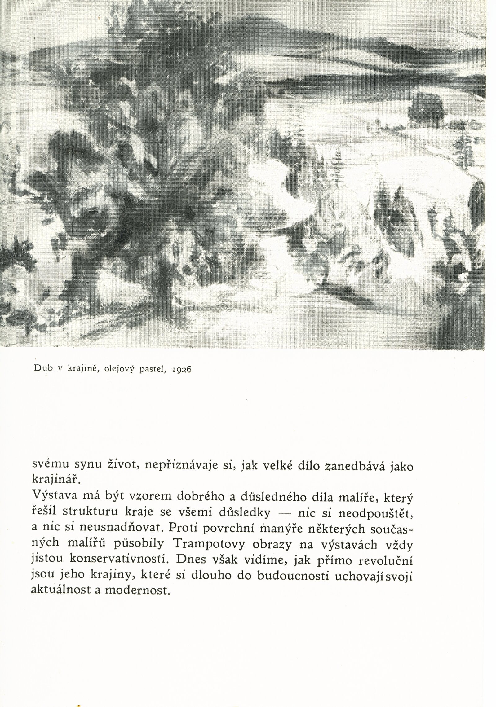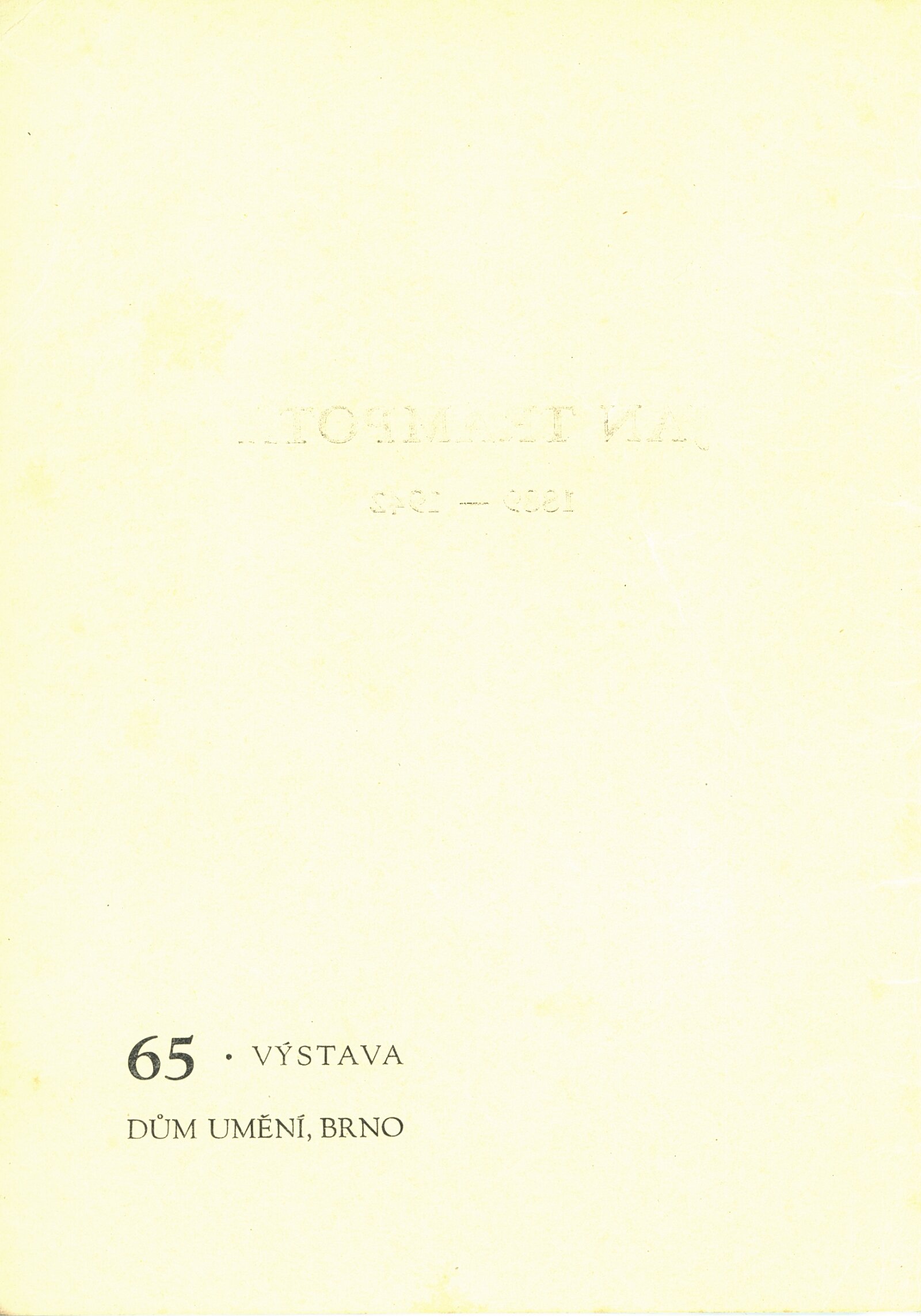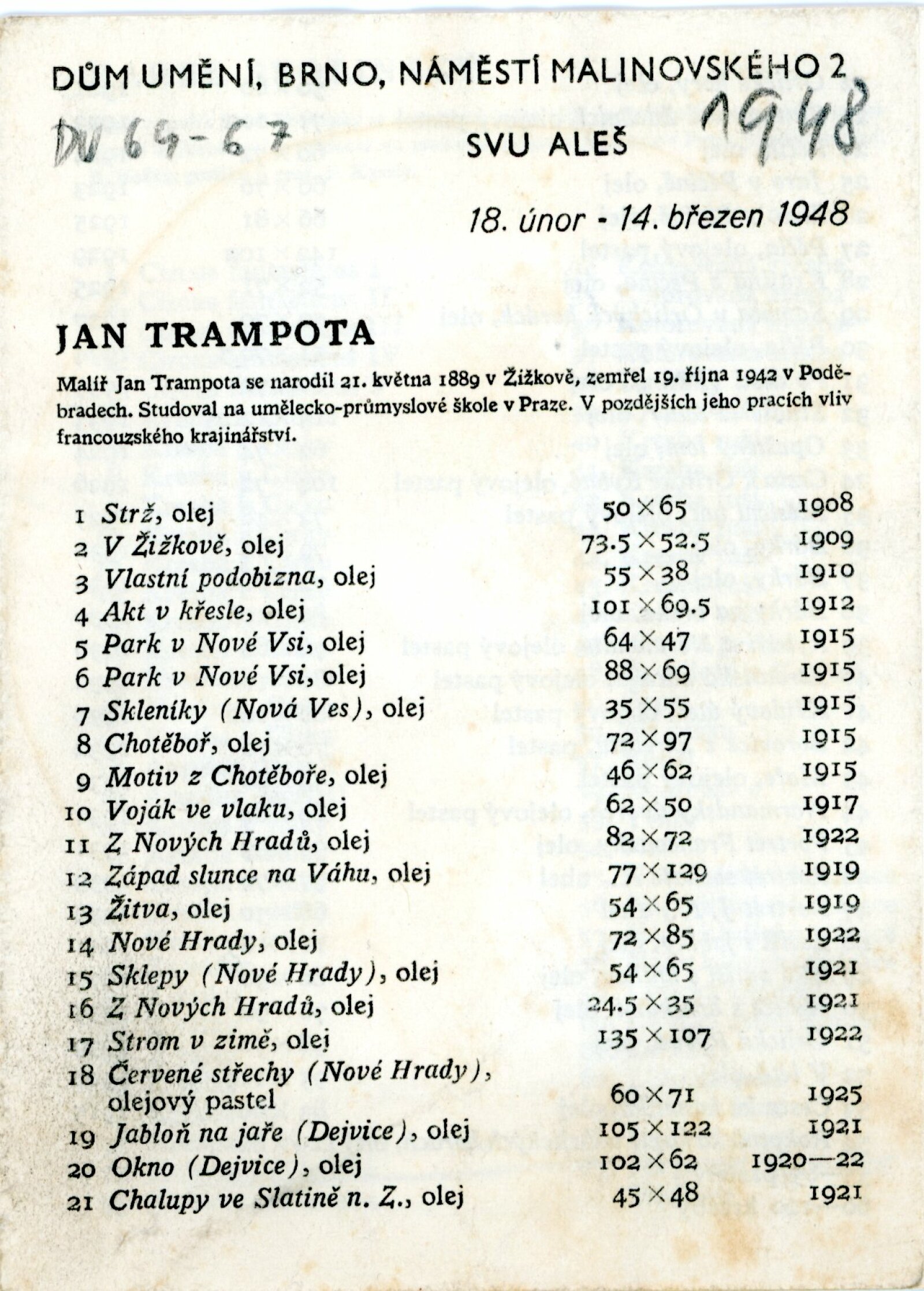 Katalog výstav Domu umění, pořádaných 18. 2. – 7. 3. 1948 / Obsahuje výstavy: Jan Trampota, Karel Svolinský, Ruské lidové tisky z XIX. století, Marc Chagall. – Brno: SVU Aleš, 1948. – 8 s., životopisná data vystavujících, DU 64–67. – AMB Jan Trampota. 1889–1942. 65. výstava: Dům umění, 21. 2. – 14. 3. 1948 / Text: Josef Kubíček. – Brno: SVU Aleš, 1948. – 12 s., DU 66. – Kubíček 7993; MZK; MG; AMB; MMB
