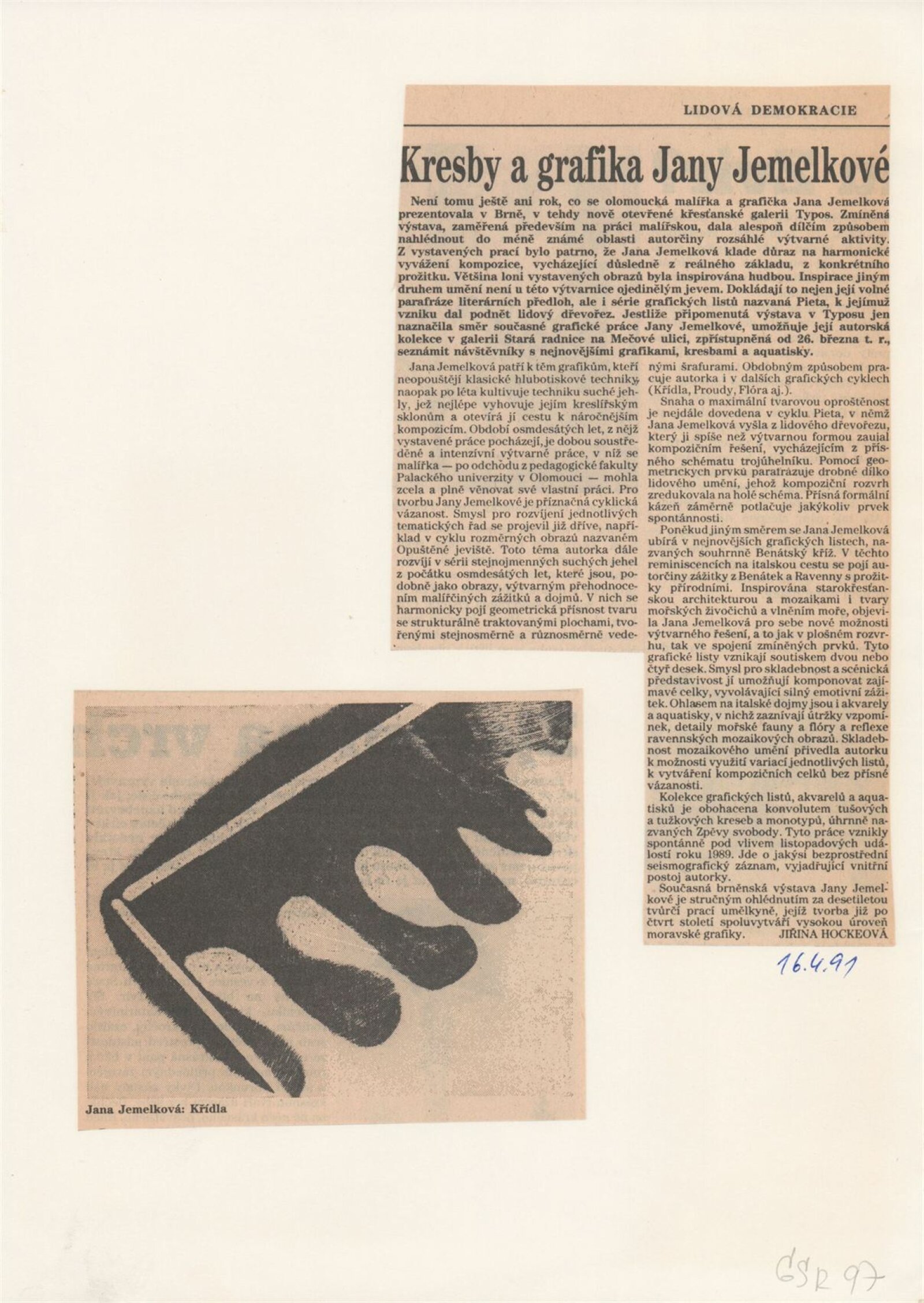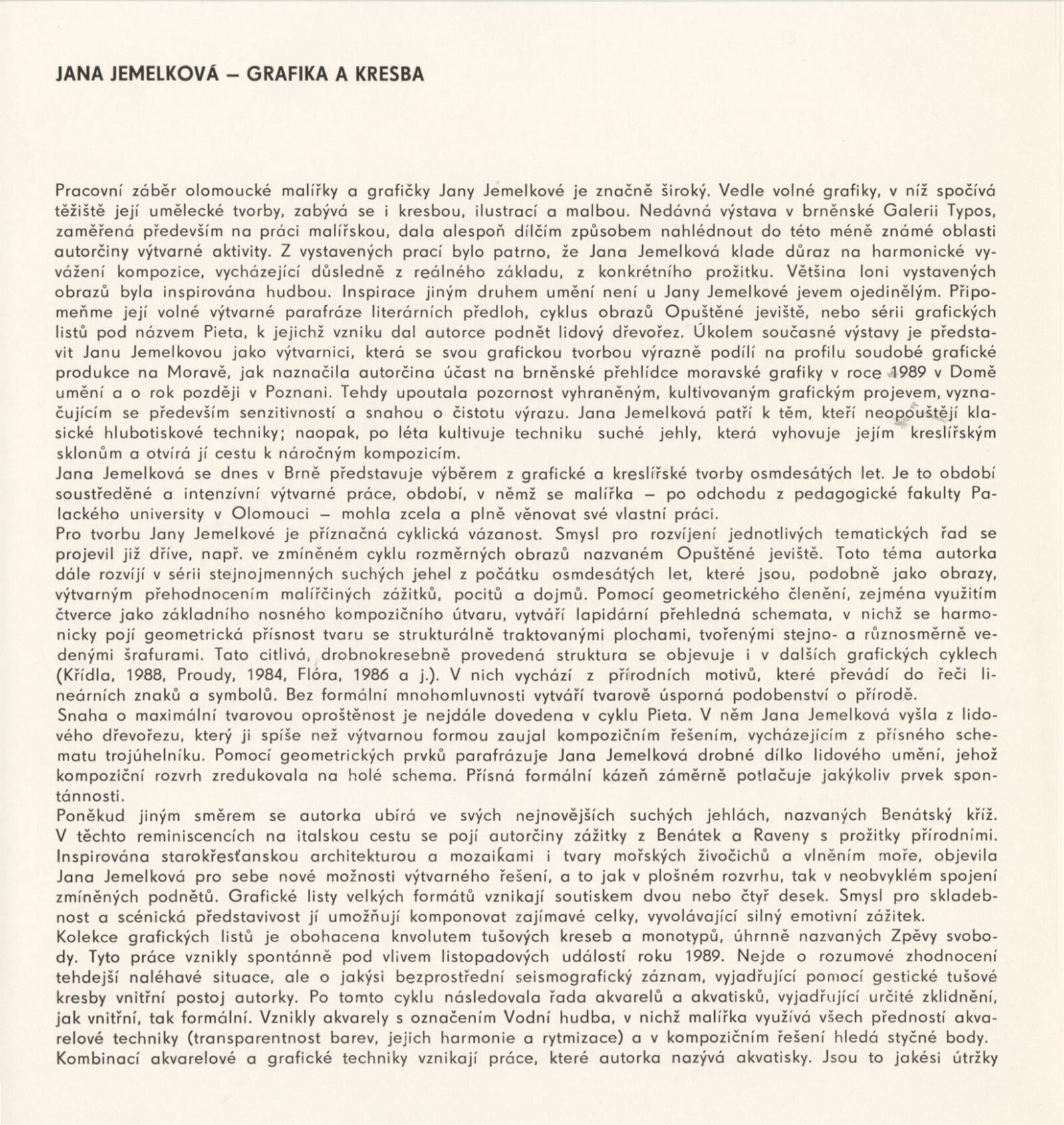 Jana Jemelková. Grafika a kresba: Galerie Stará radnice, podkroví, 26. 3. – 28. 4. 1991 / Text: Jiřina Hockeová. – Brno: DUmB, 1991. – skládačka (6 s., obr.), životopis, GSR 97. – MZK; MG
