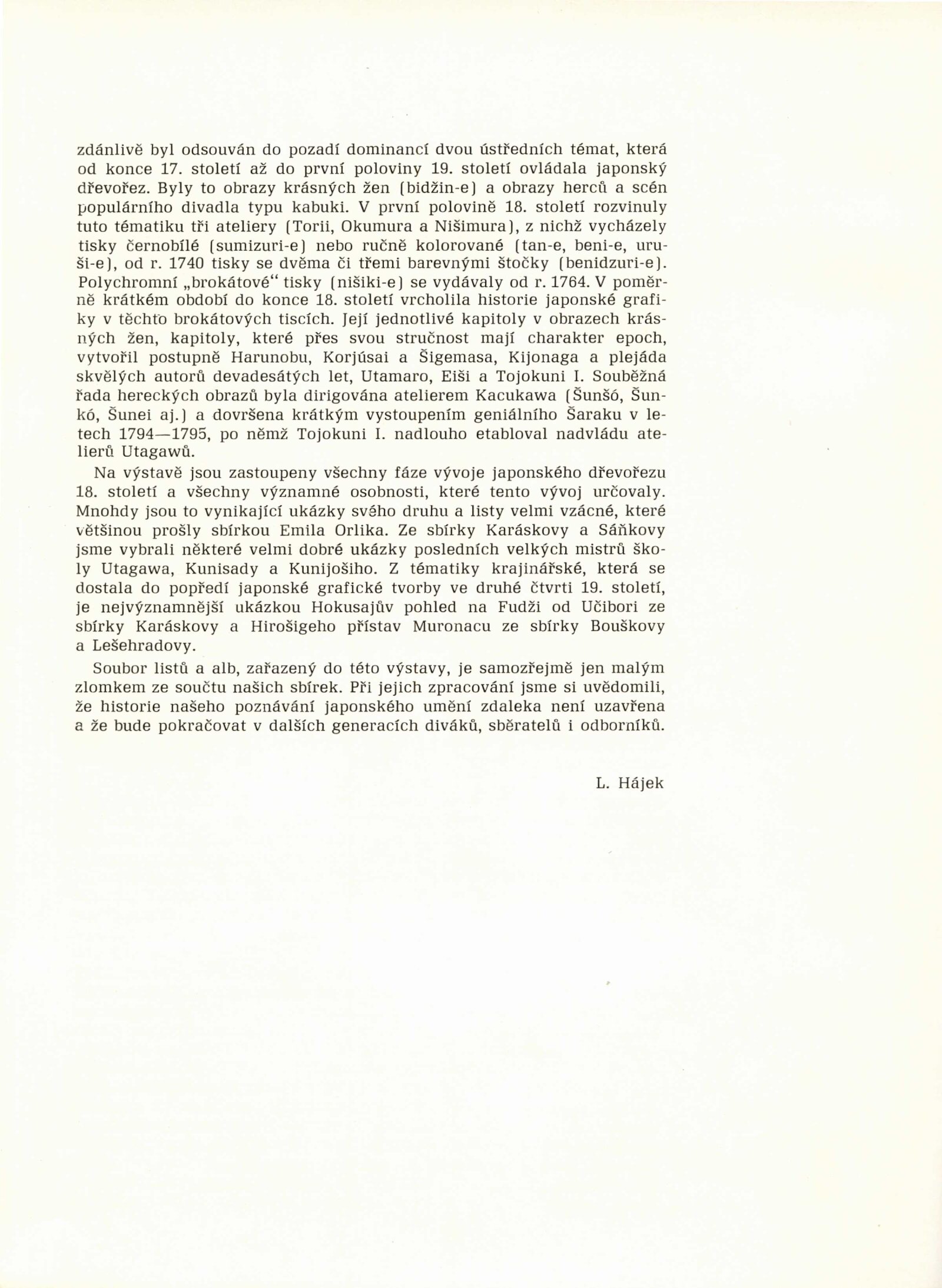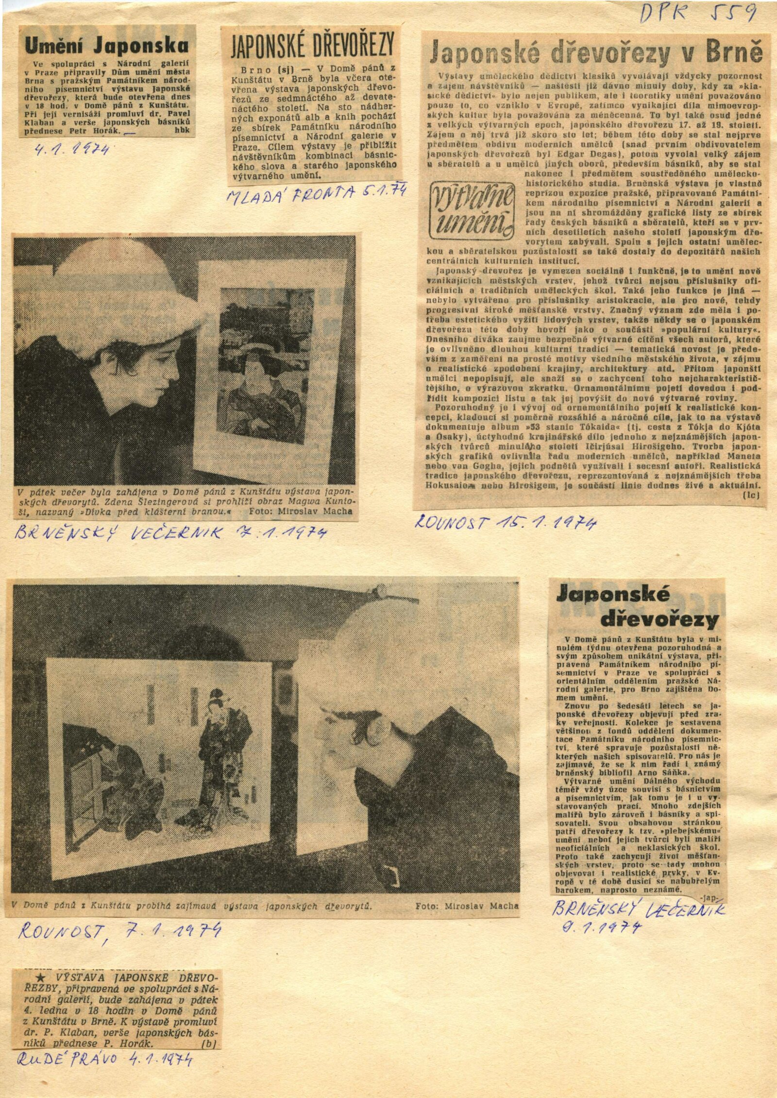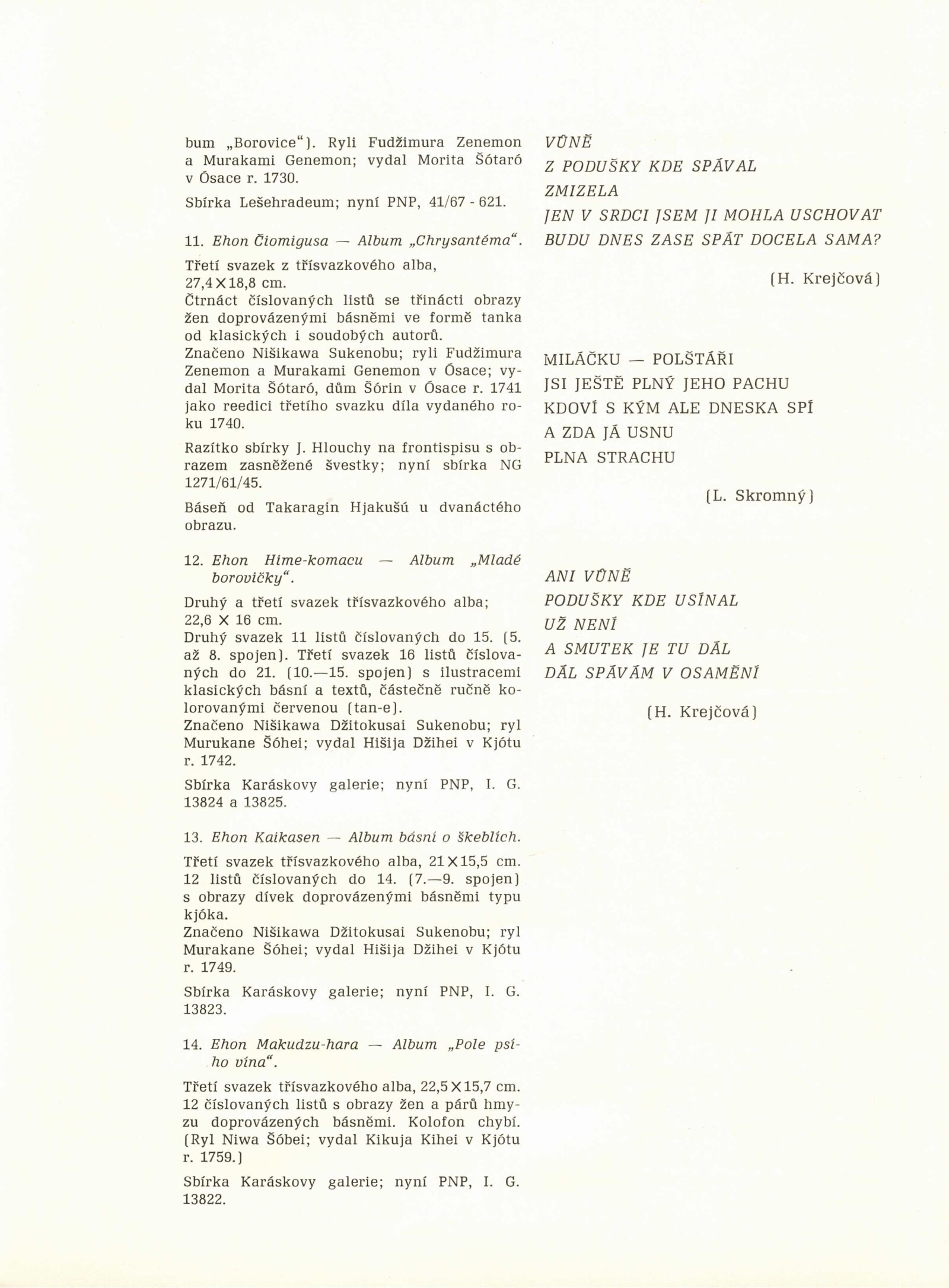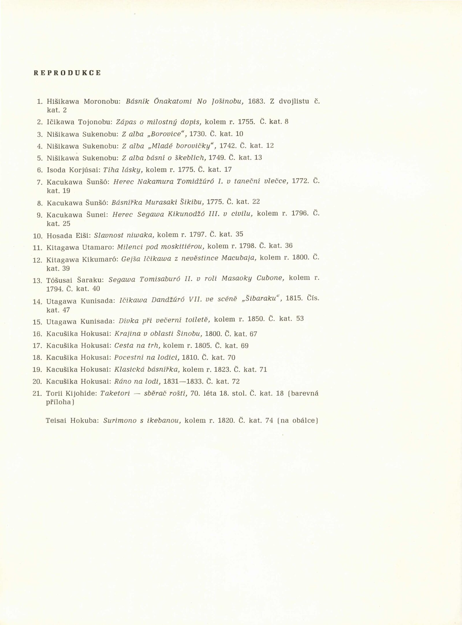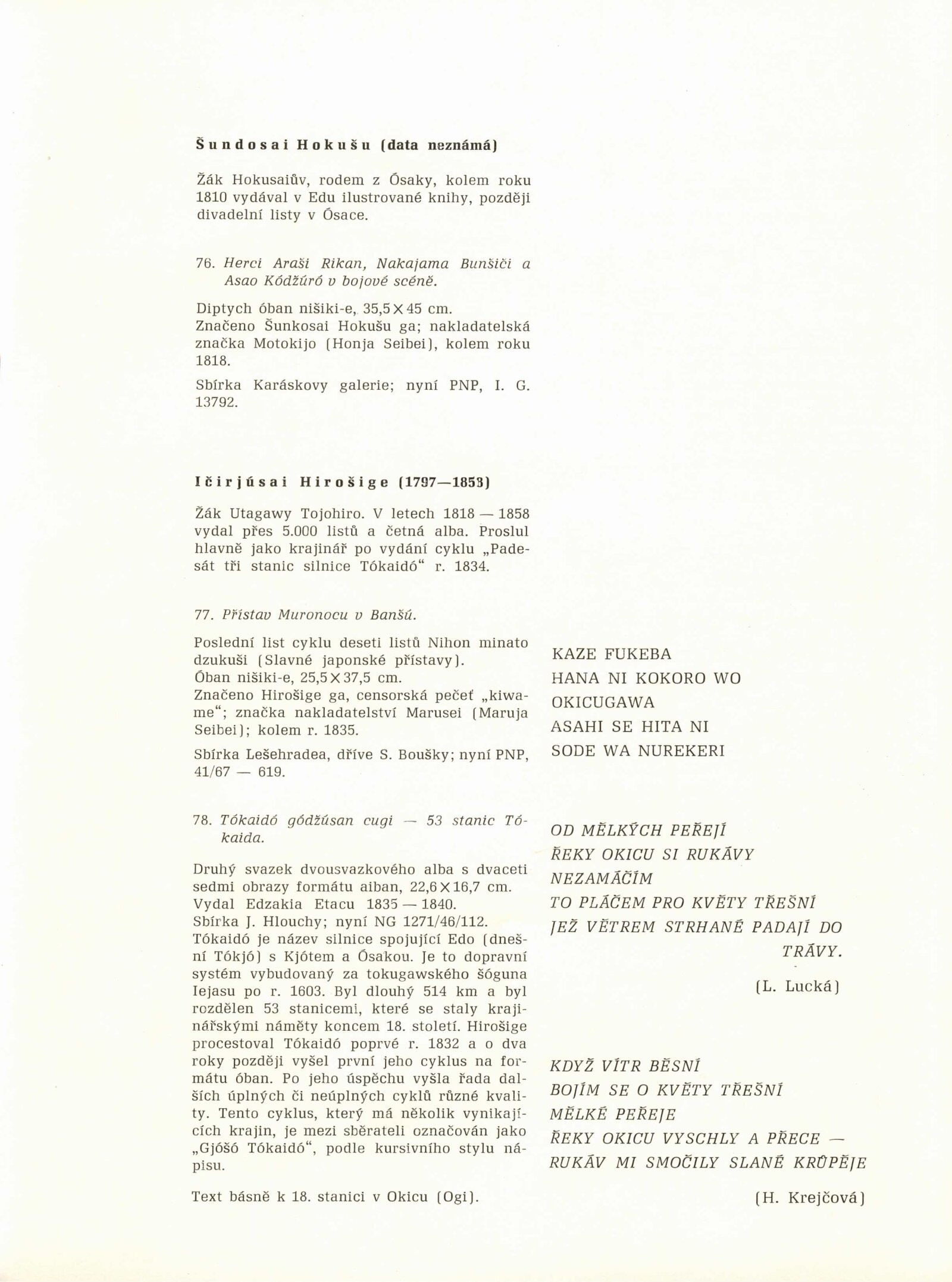 Japonské dřevořezy: Dům umění / Dům pánů z Kunštátu, 140. výstava Kabinetu grafiky, 4. 1. – 3. 3. 1974 / Převzatý katalog. Japonské dřevořezy: Památník národního písemnictví, Výstavní síň Musaion, Praha, podzim 1973 / Texty: Lubor Hájek, Helena Krejčová. – Praha: Památník národního písemnictví, 1973. – 60 s., obr., odborné popisy, DPK 559